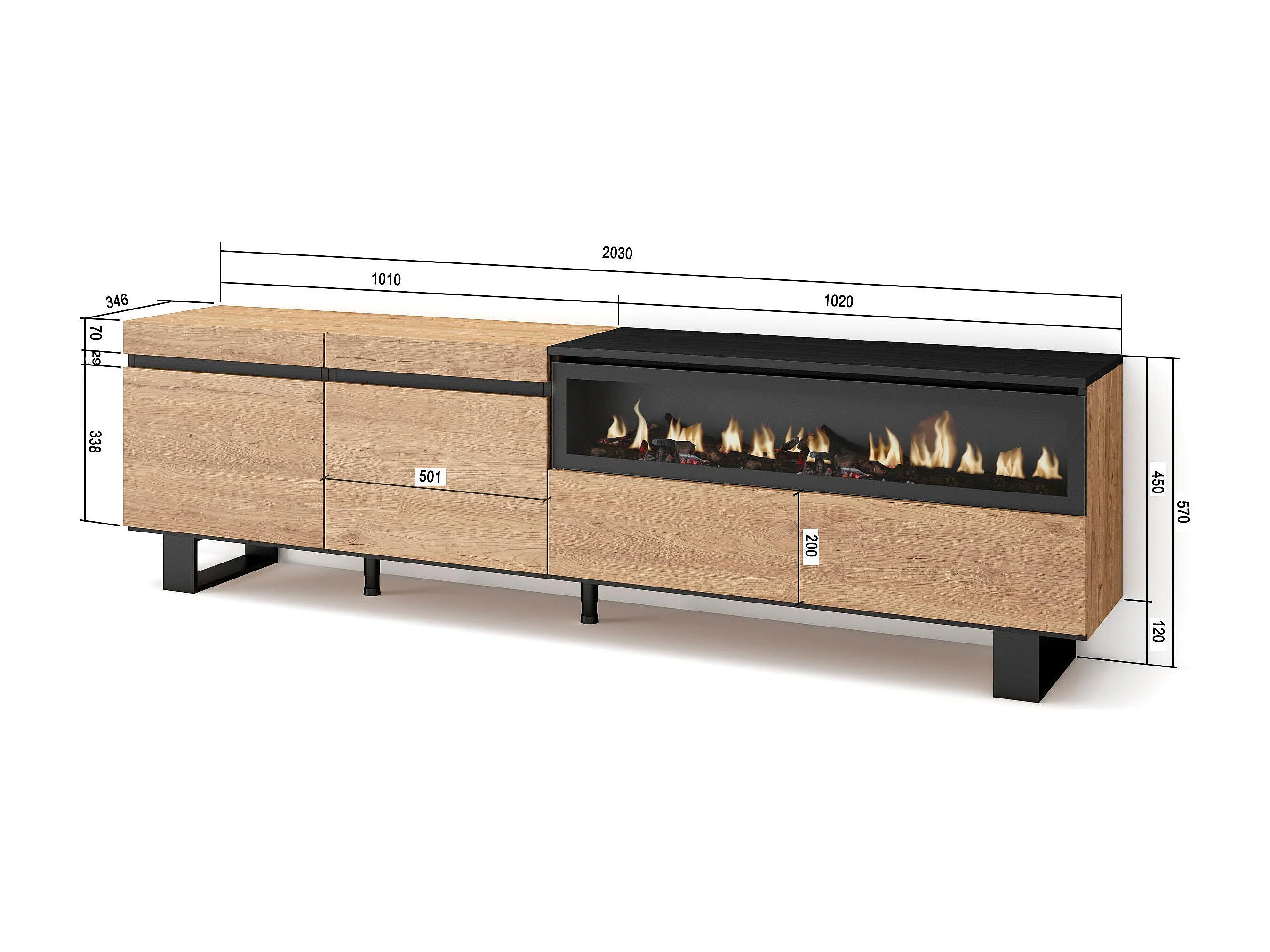 TV-Meubel, Lowboard, 200x35x57cm, Voor tv's tot 80", Elektrische haard, Industrieel design, Eiken/Zwart