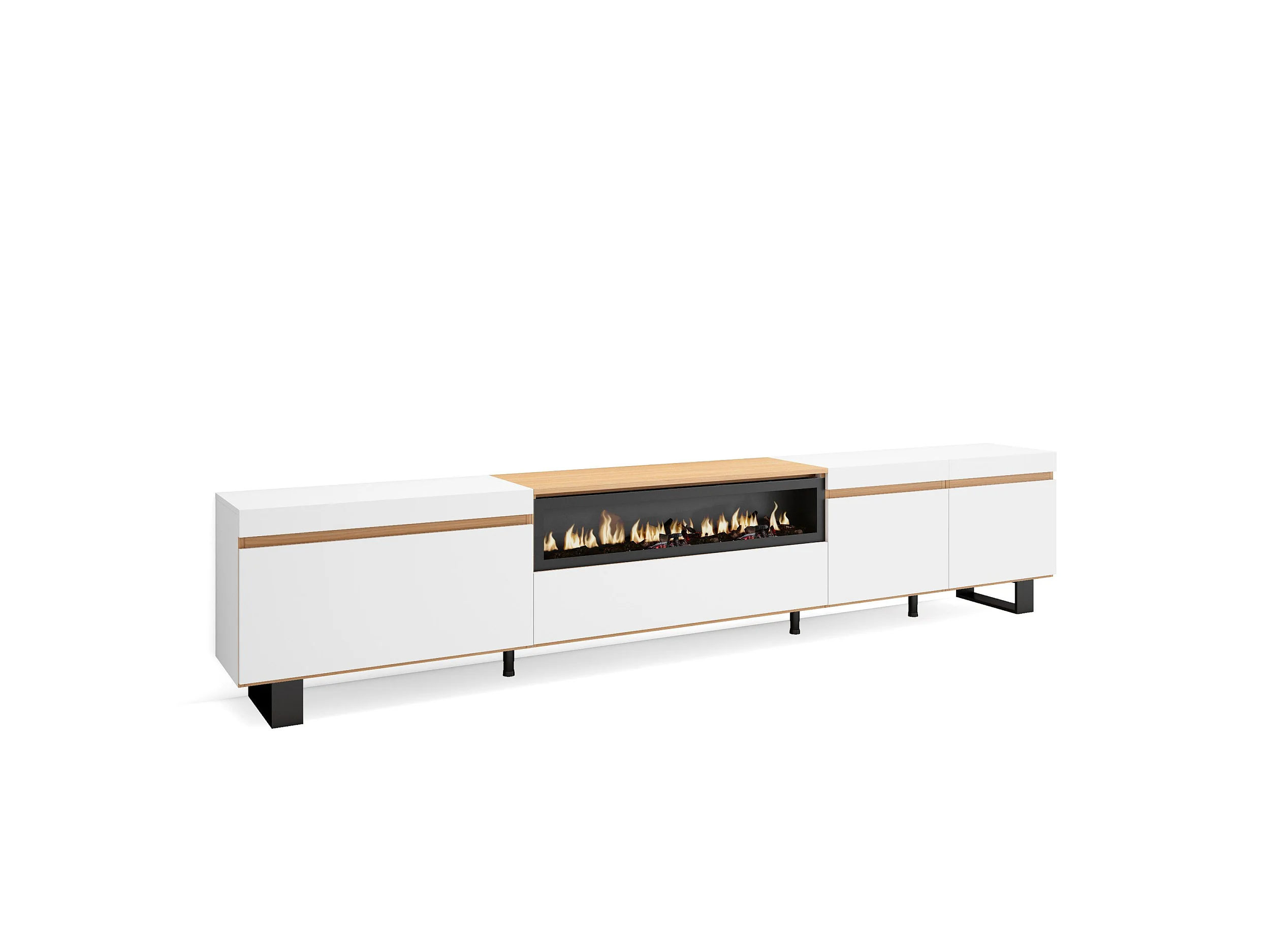 TV-Meubel, Lowboard, 288x35x57cm, Groot formaat TV, Elektrische haard, Industrieel design, Wit en Eiken soft