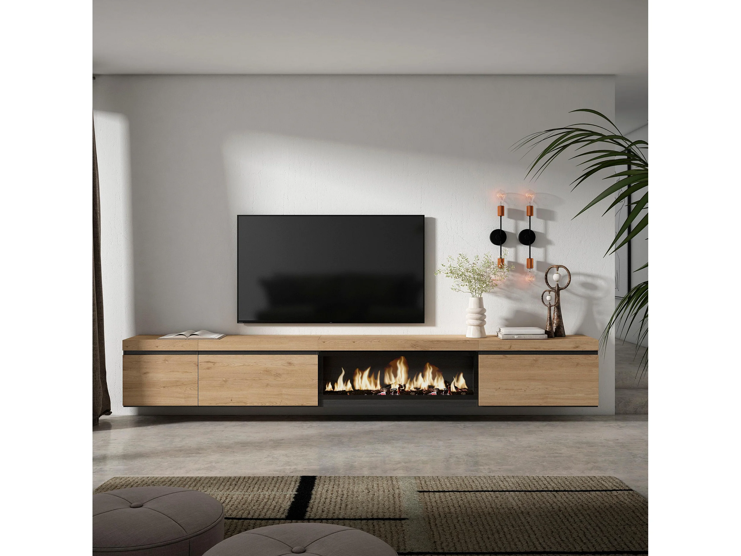 TV-Meubel, Lowboard, 317x35x45cm, Elektrische haard XXL, Hangend, Eiken