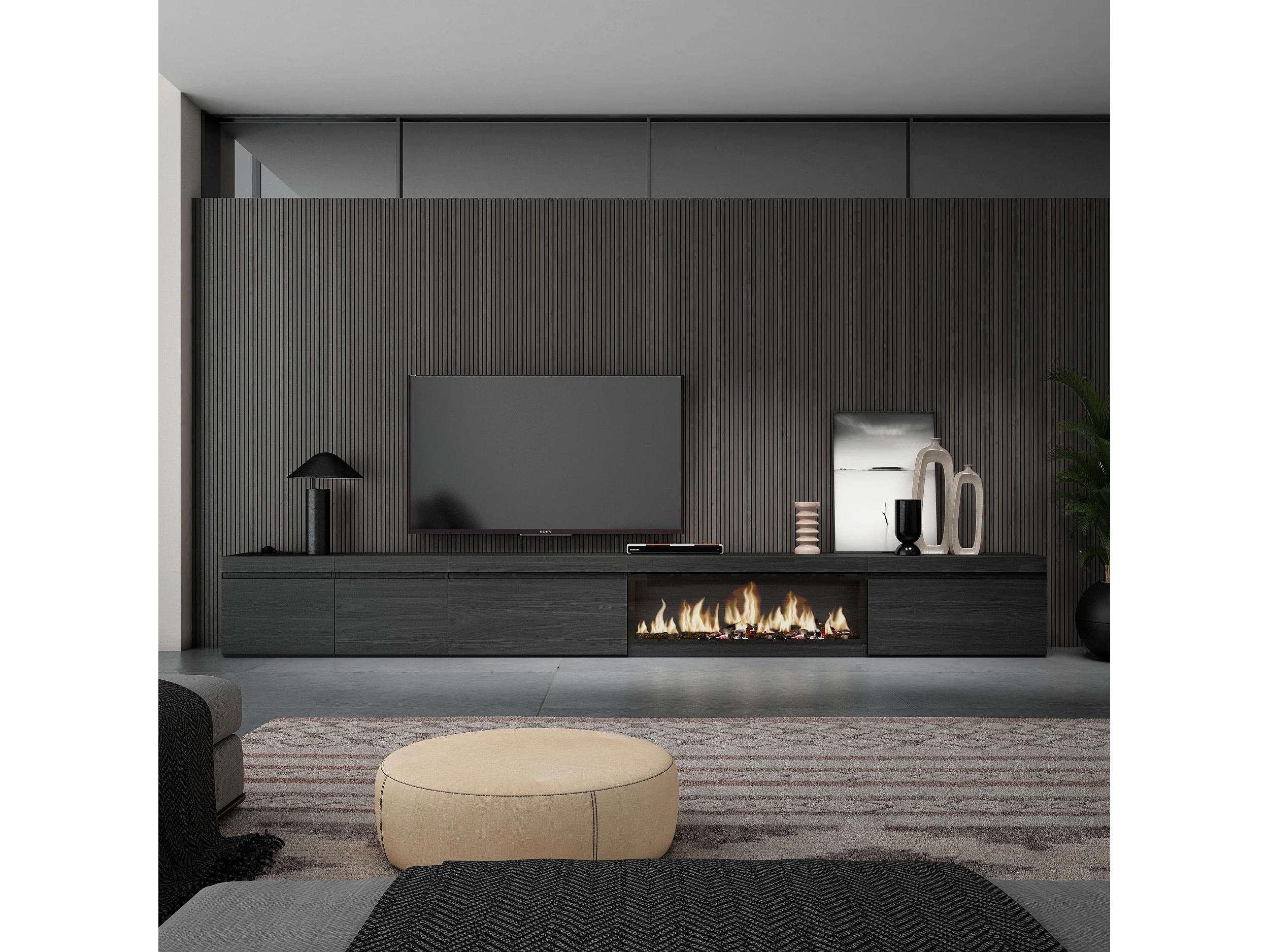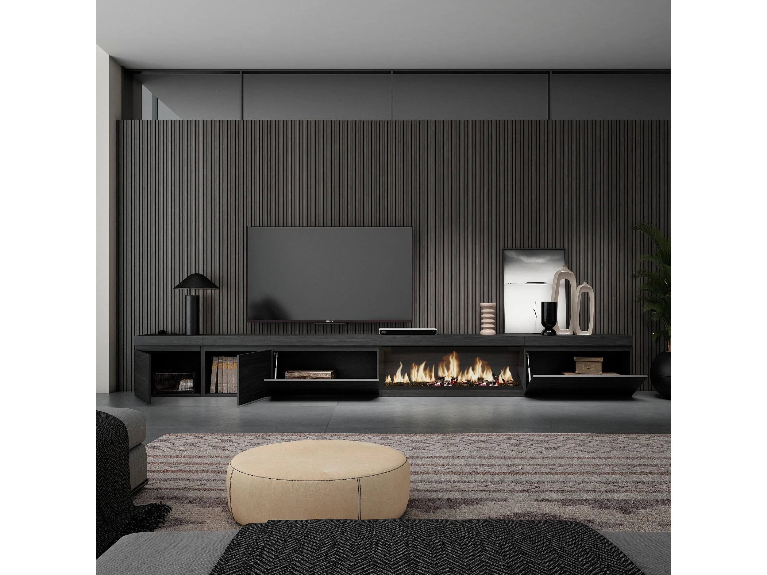 TV-Meubel, Lowboard, 368x35x45cm, Elektrische haard XXL, Zwart