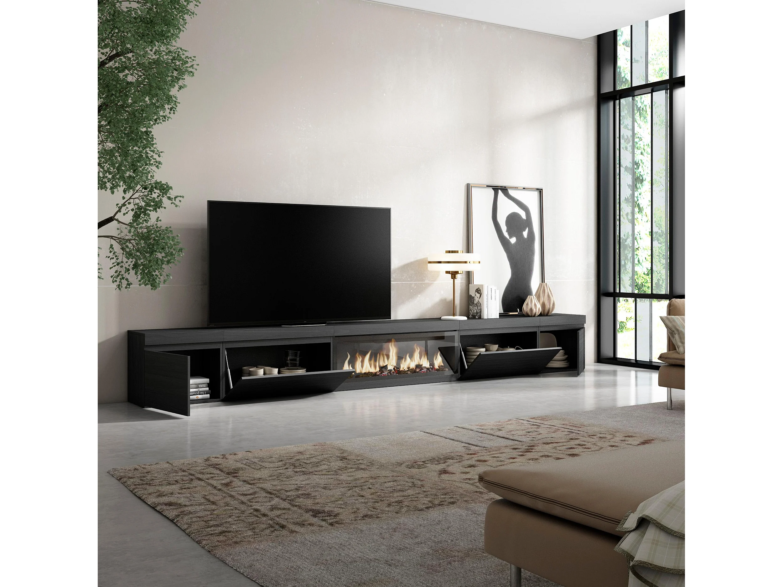 TV-Meubel, Lowboard, 368x35x45cm, Elektrische haard XXL, Zwart