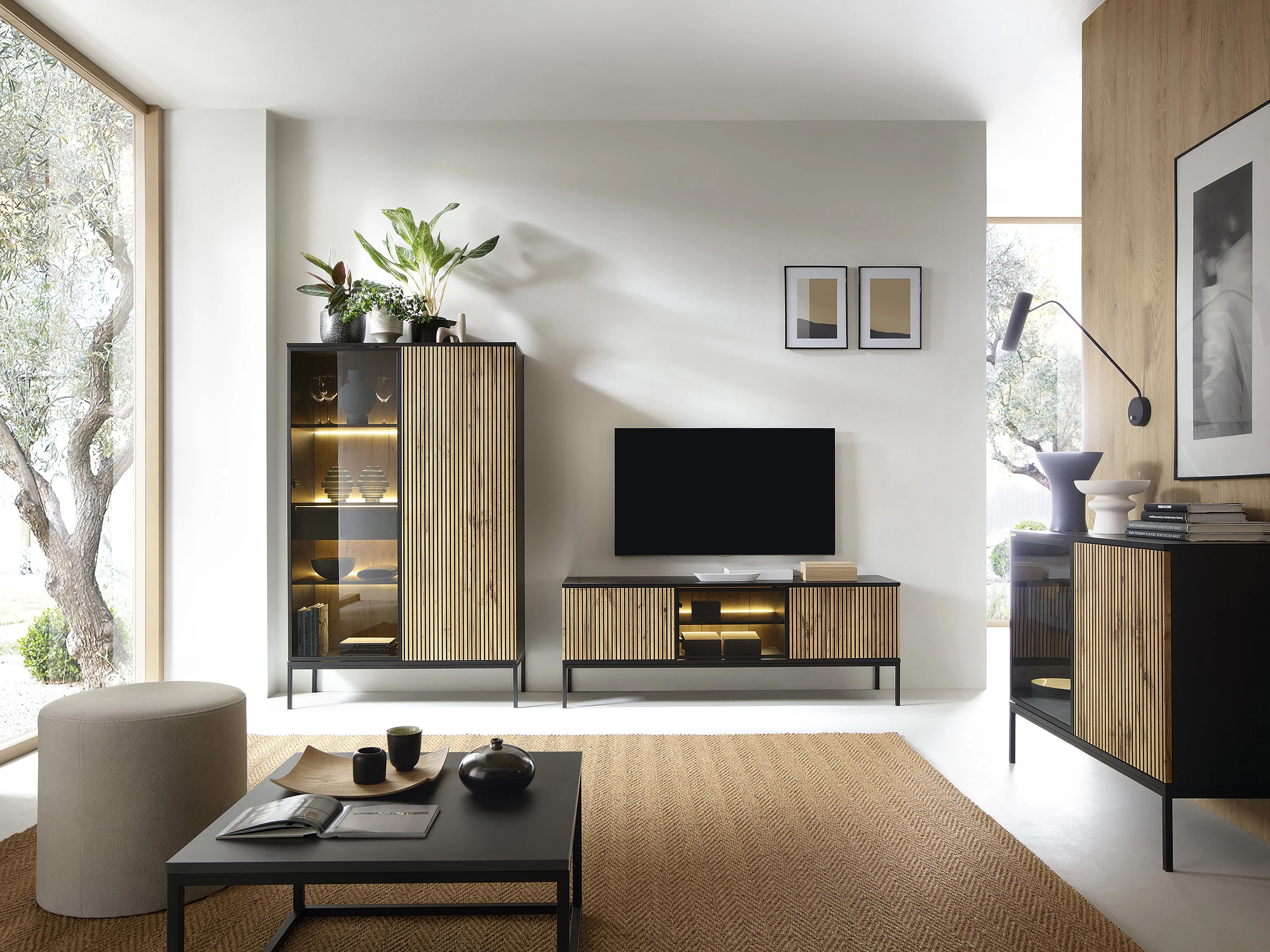 Tv-meubel met 3 deurtjes met ledverlichting van mdf en gerookt glas - Zwart en naturel - OVILA