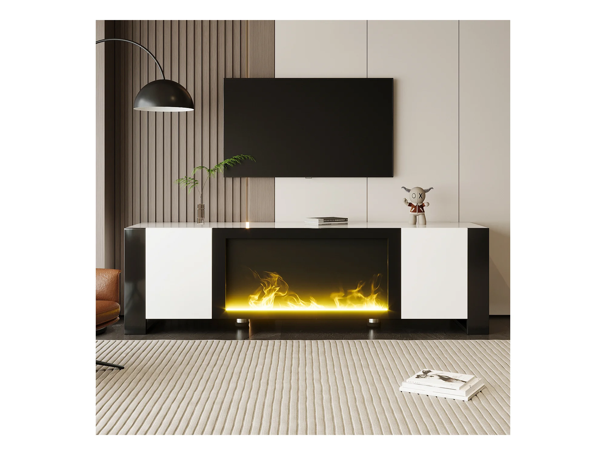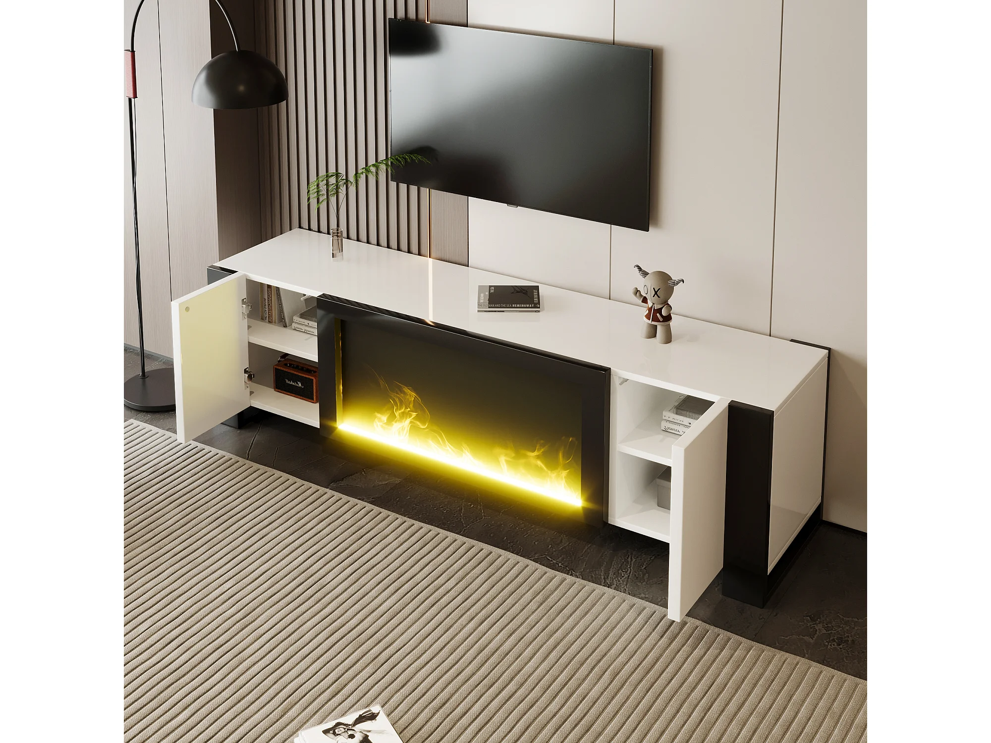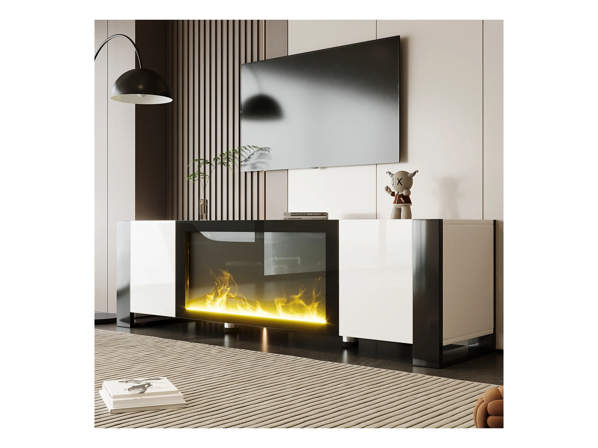 TV-meubel met decoratieve verlichting, elektrisch vlameffect (zonder verwarmingsfunctie), modern design, hoogglans, hout en zwart (165x32x55cm)