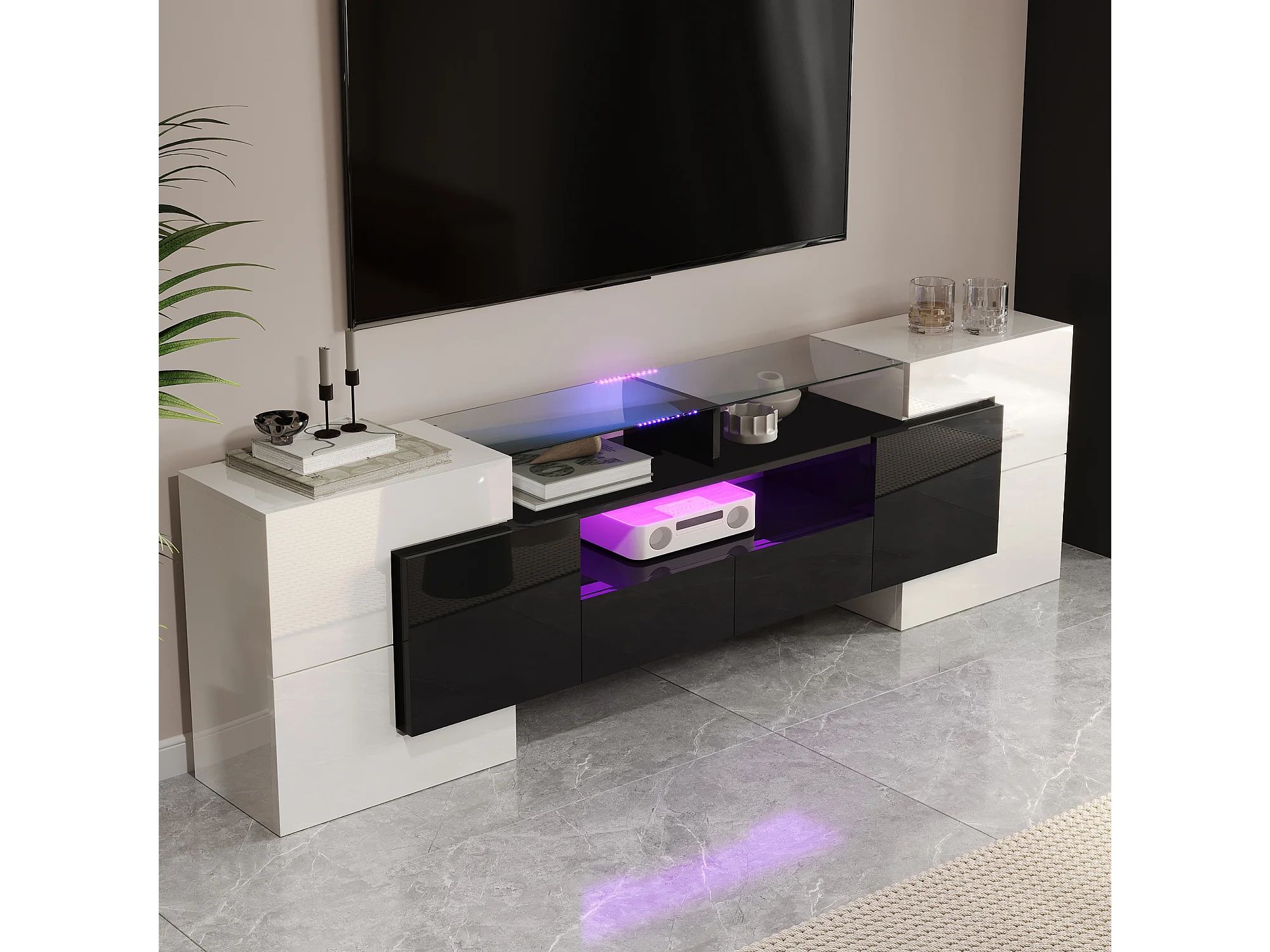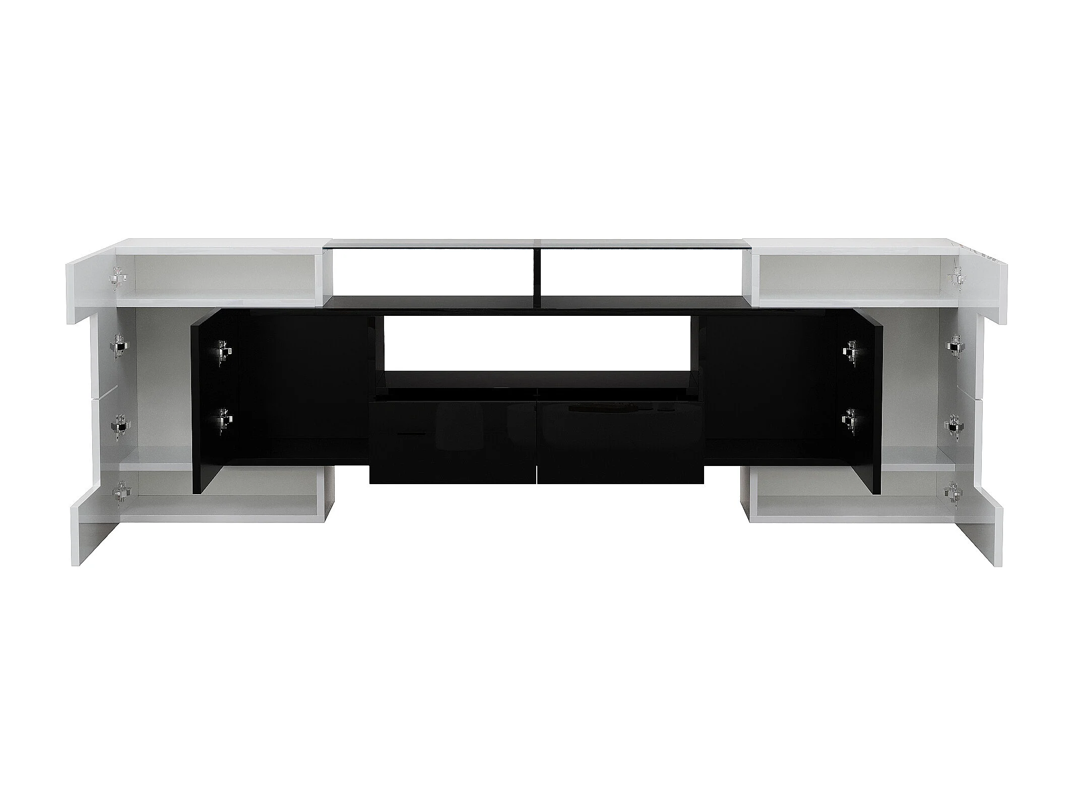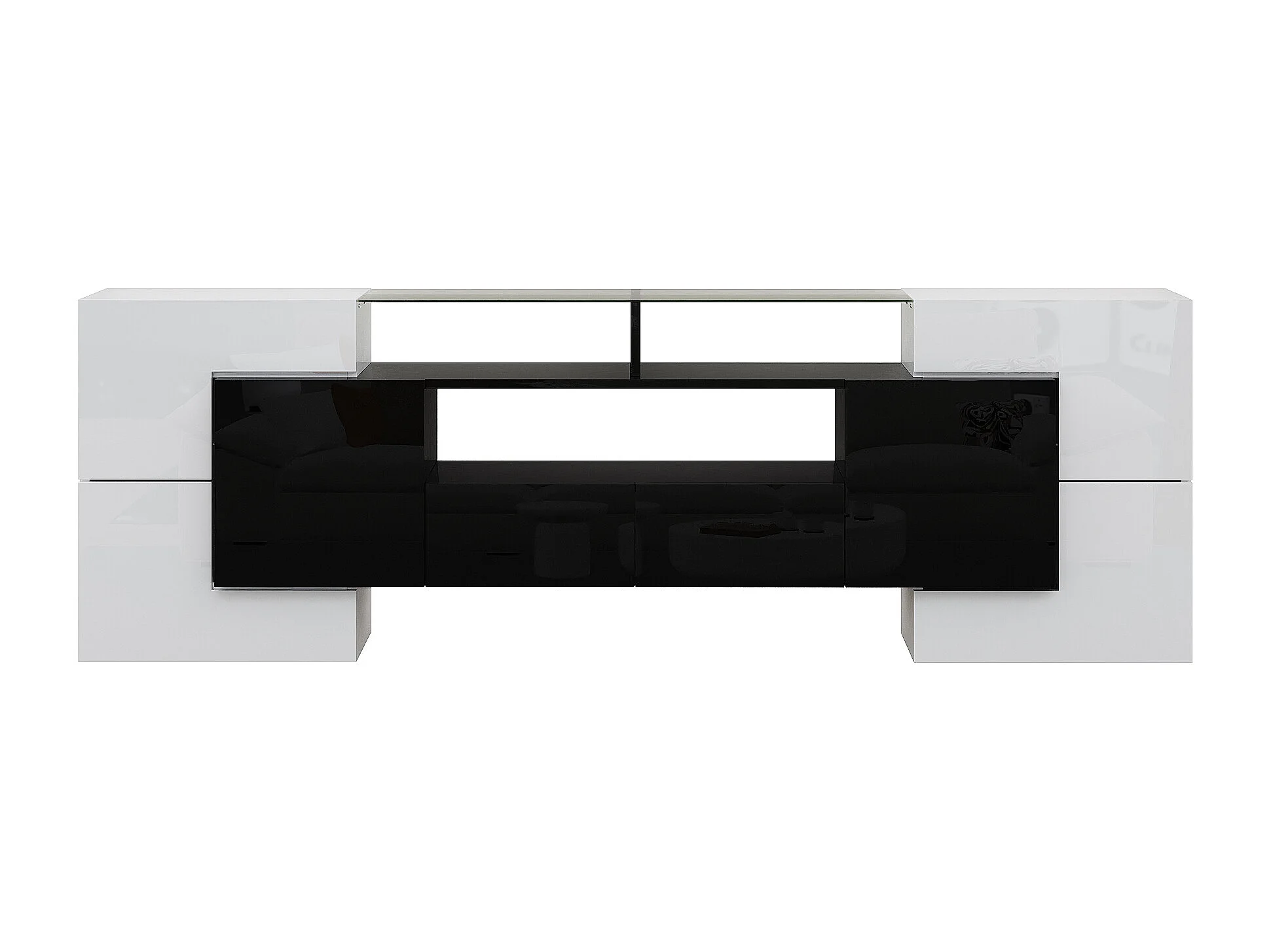 TV-meubel met LED-verlichting, 6 deuren en 2 lades - Wit en zwart gelakte afwerking