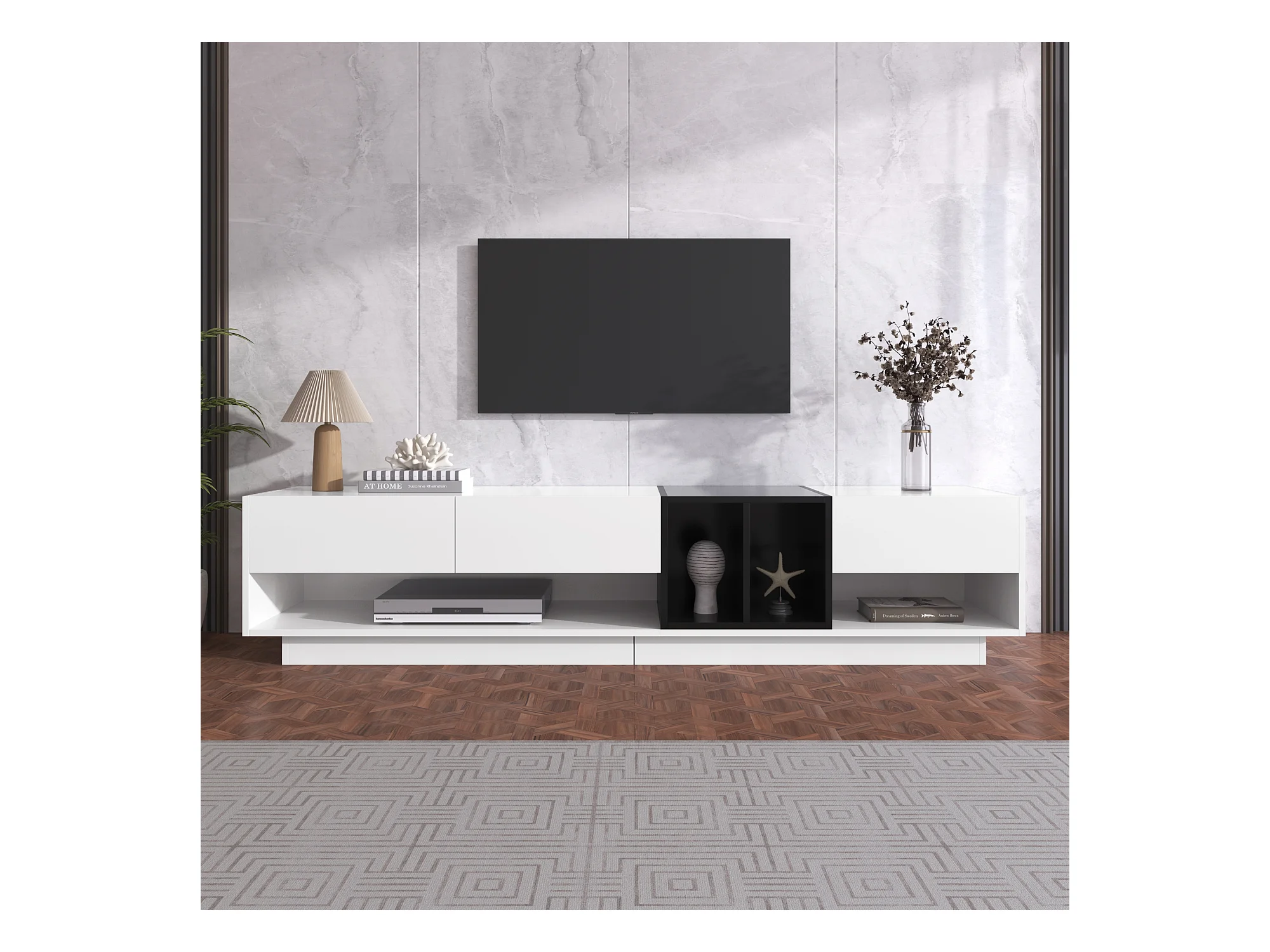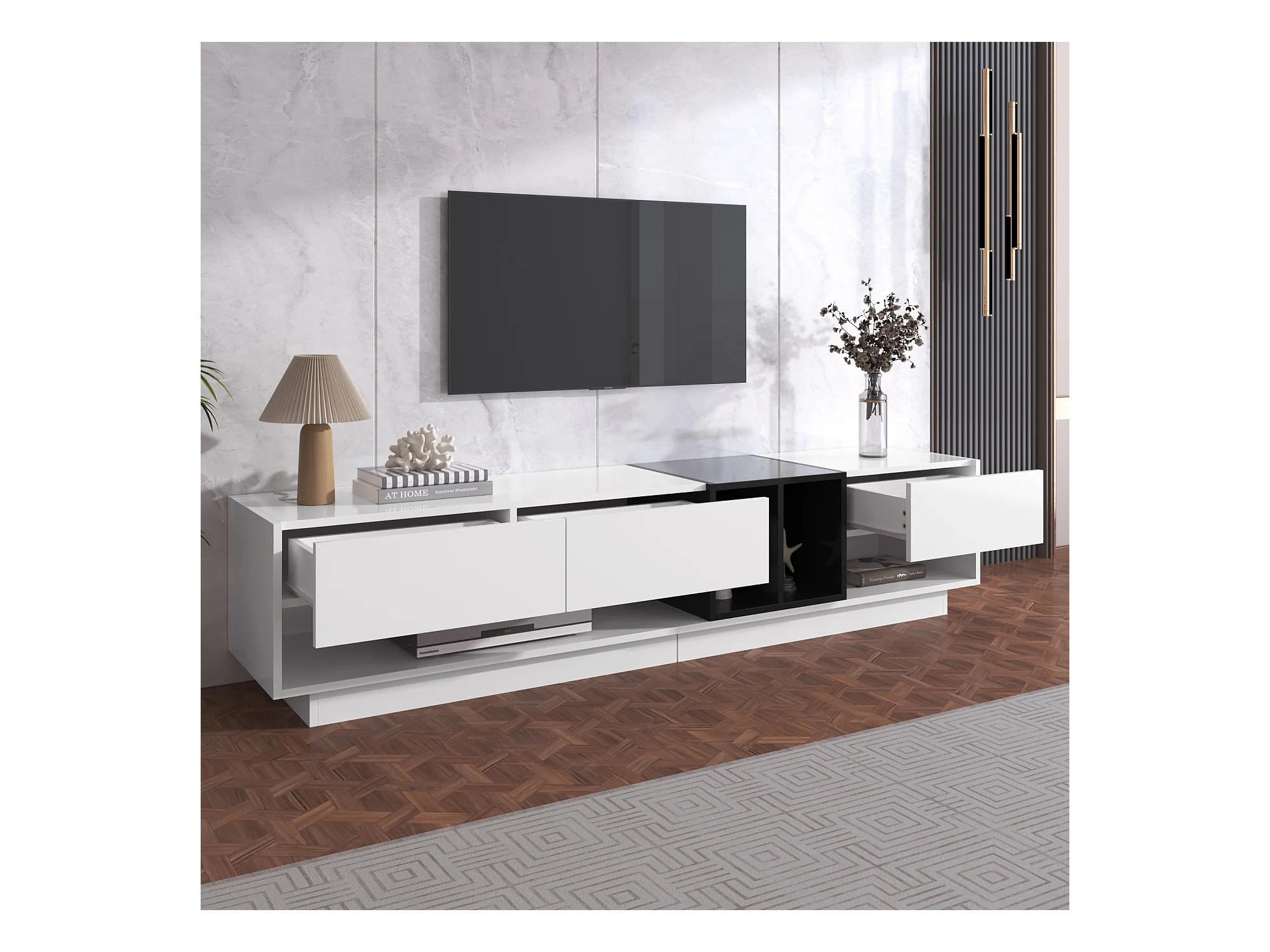 TV-meubel met opbergruimte, zwart-wit design, MDF, met 3 lades en planken, hoogglans afwerking (190x40x42cm)