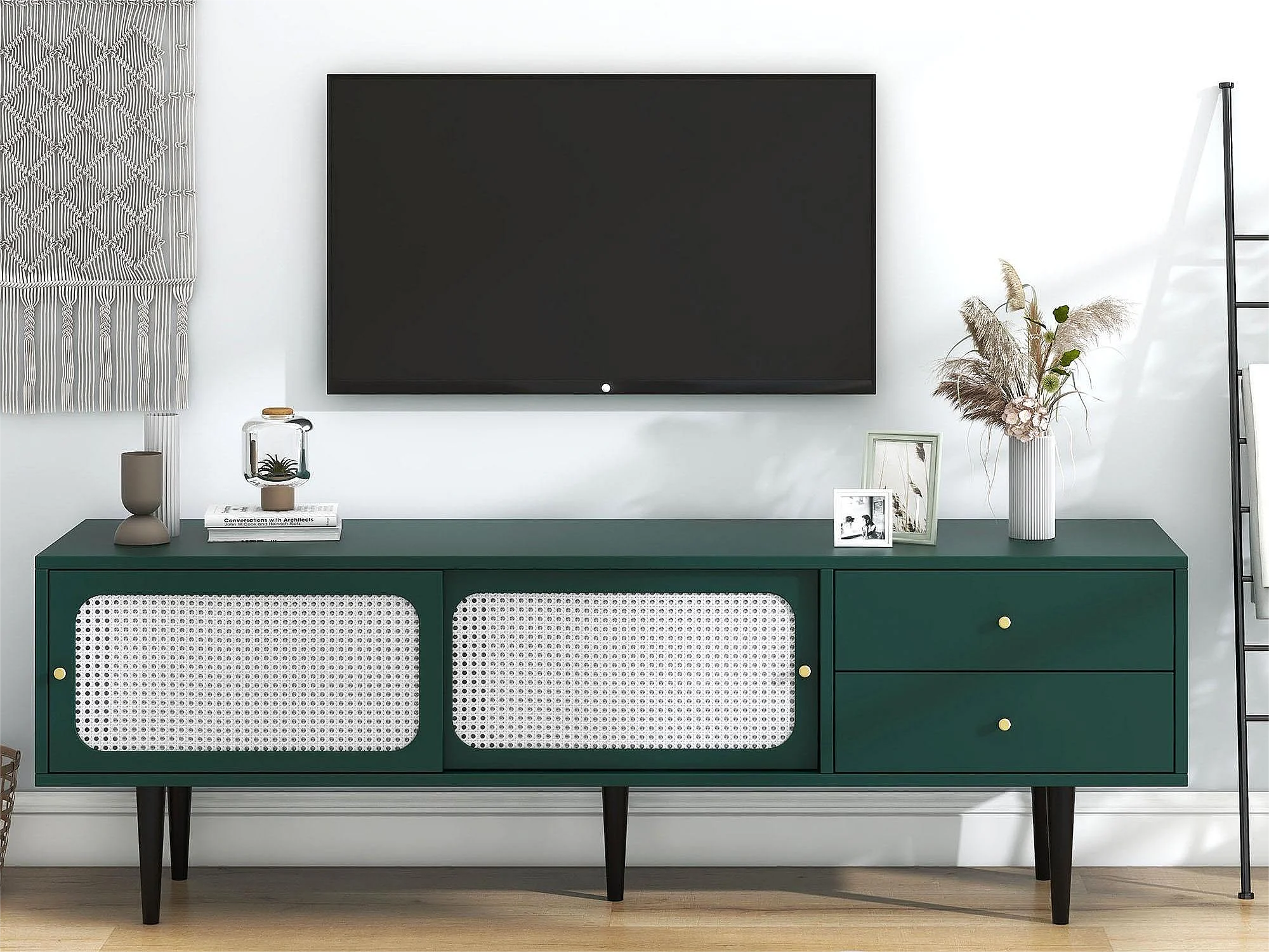 TV-meubel 120 cm - 2 schuifdeuren en 2 lades - MDF groen fineer en zwart metaal