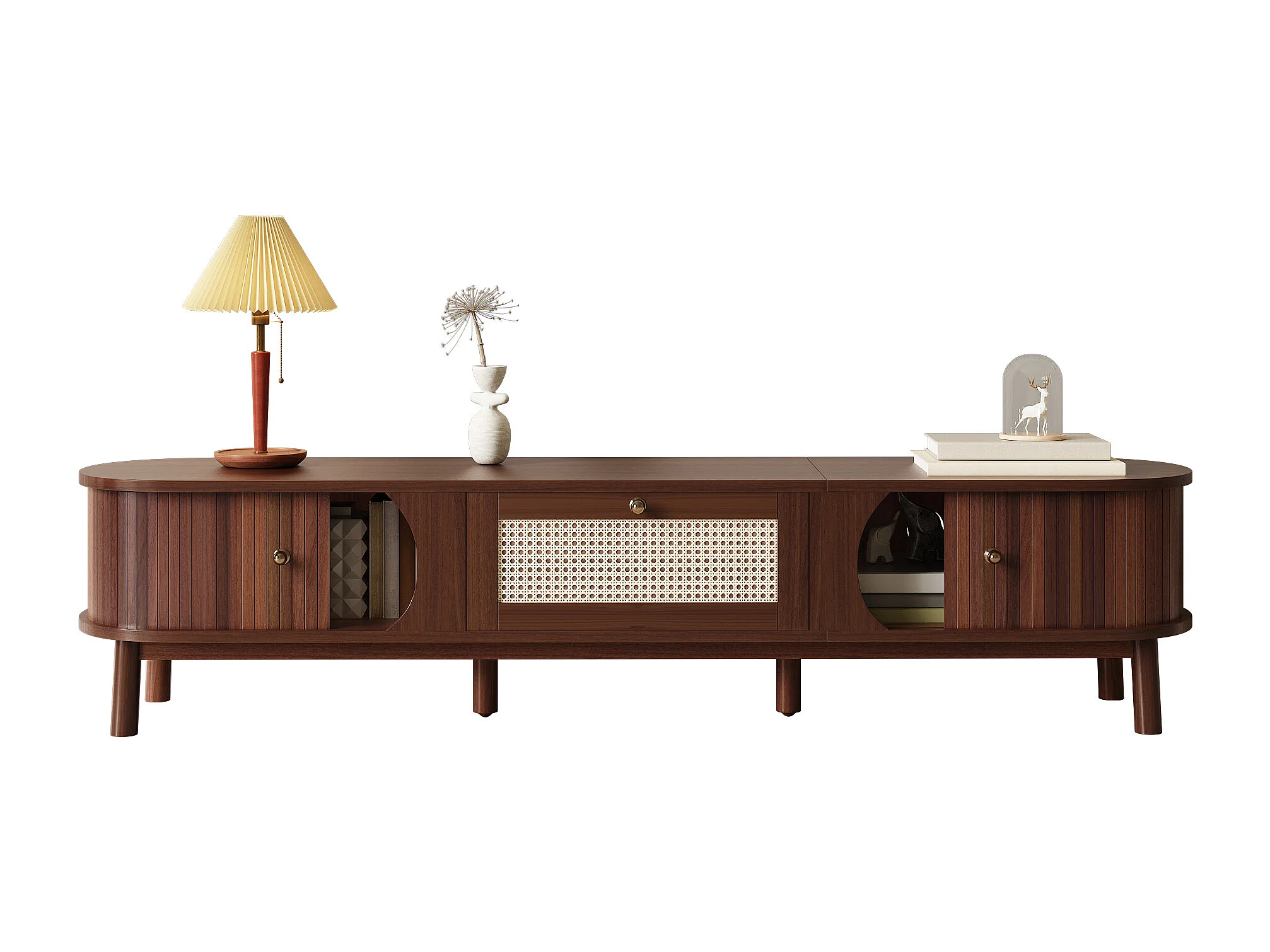 Tv-meubel van natuurlijk hout en rotan, rustiek design met massief houten deuren en rotan lades (170x39,5x38cm)
