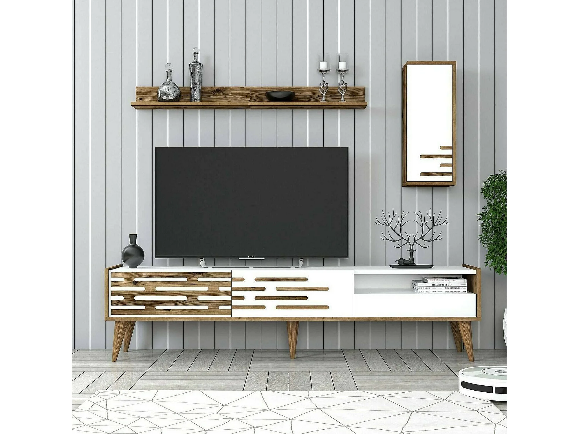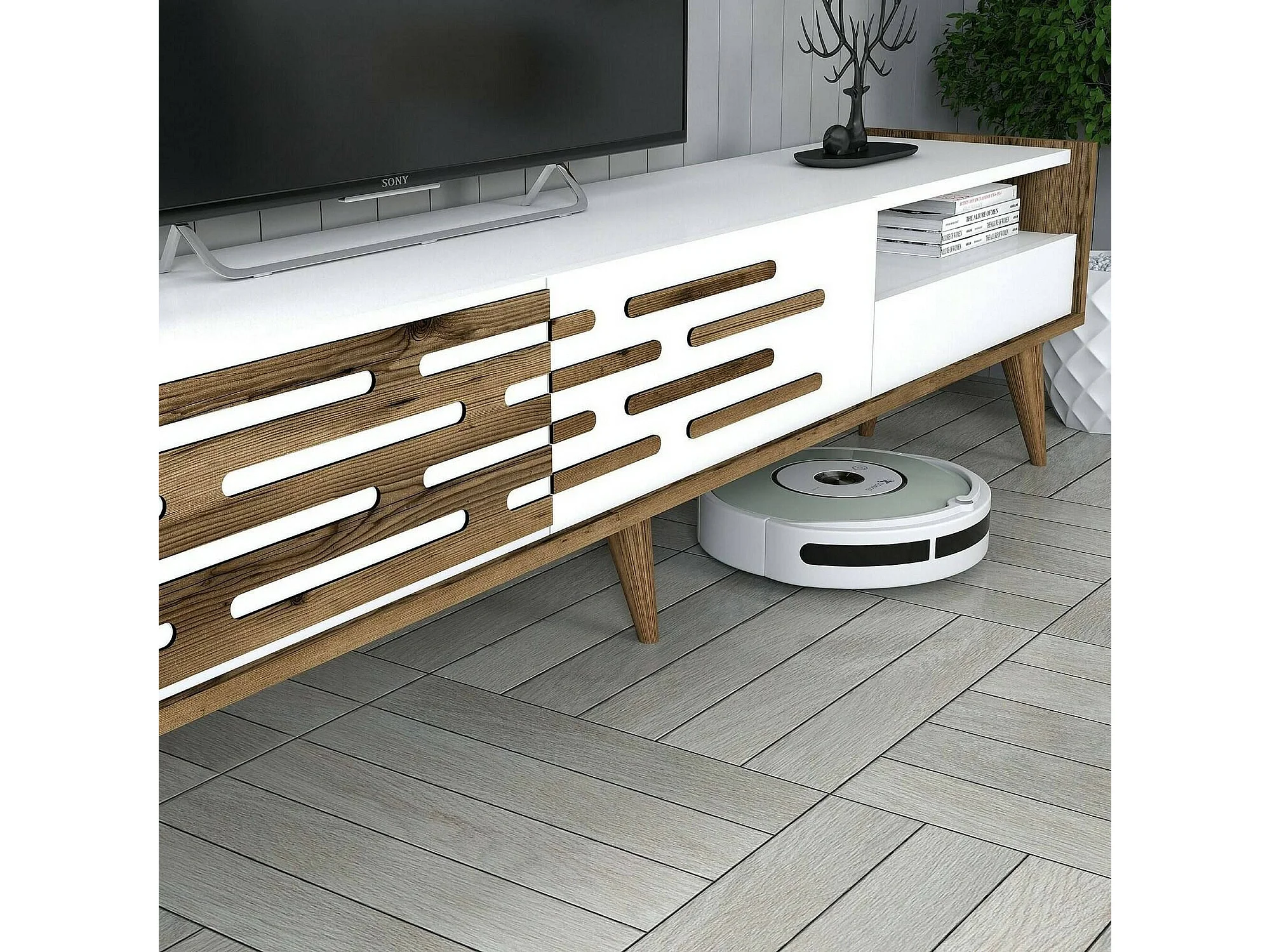 Tv-standaard Dbrunozz, CreWoonkamer, lage tv-meubel, wandvoet, 180x45h35 cm, wit en walnoot