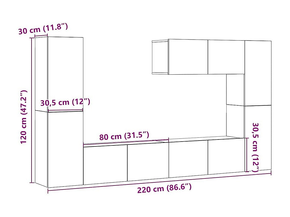 8-delig Tv-meubelset wandmontage bewerkt hout artisanaal eiken