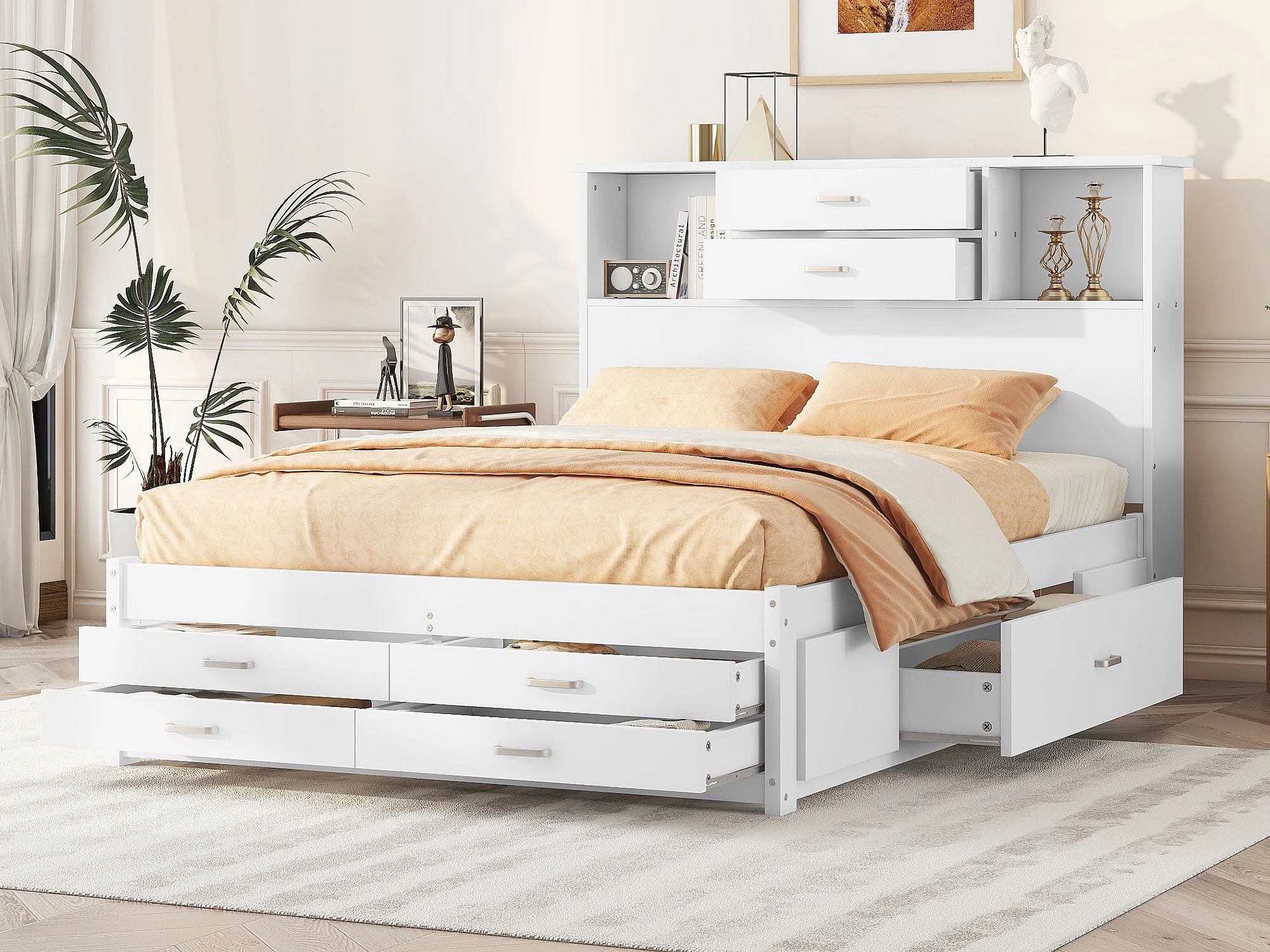 Tweepersoons houten bed 140 x 200 cm met 8 laden en 2 opbergvakken - MDF hout - Lattenbodem - Wit
