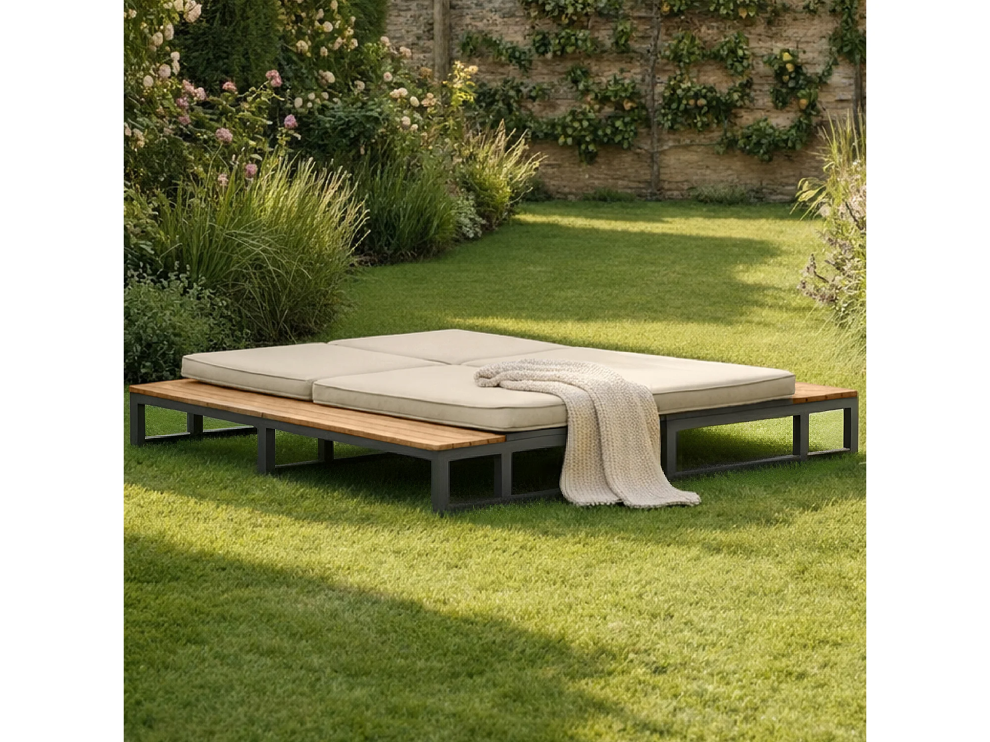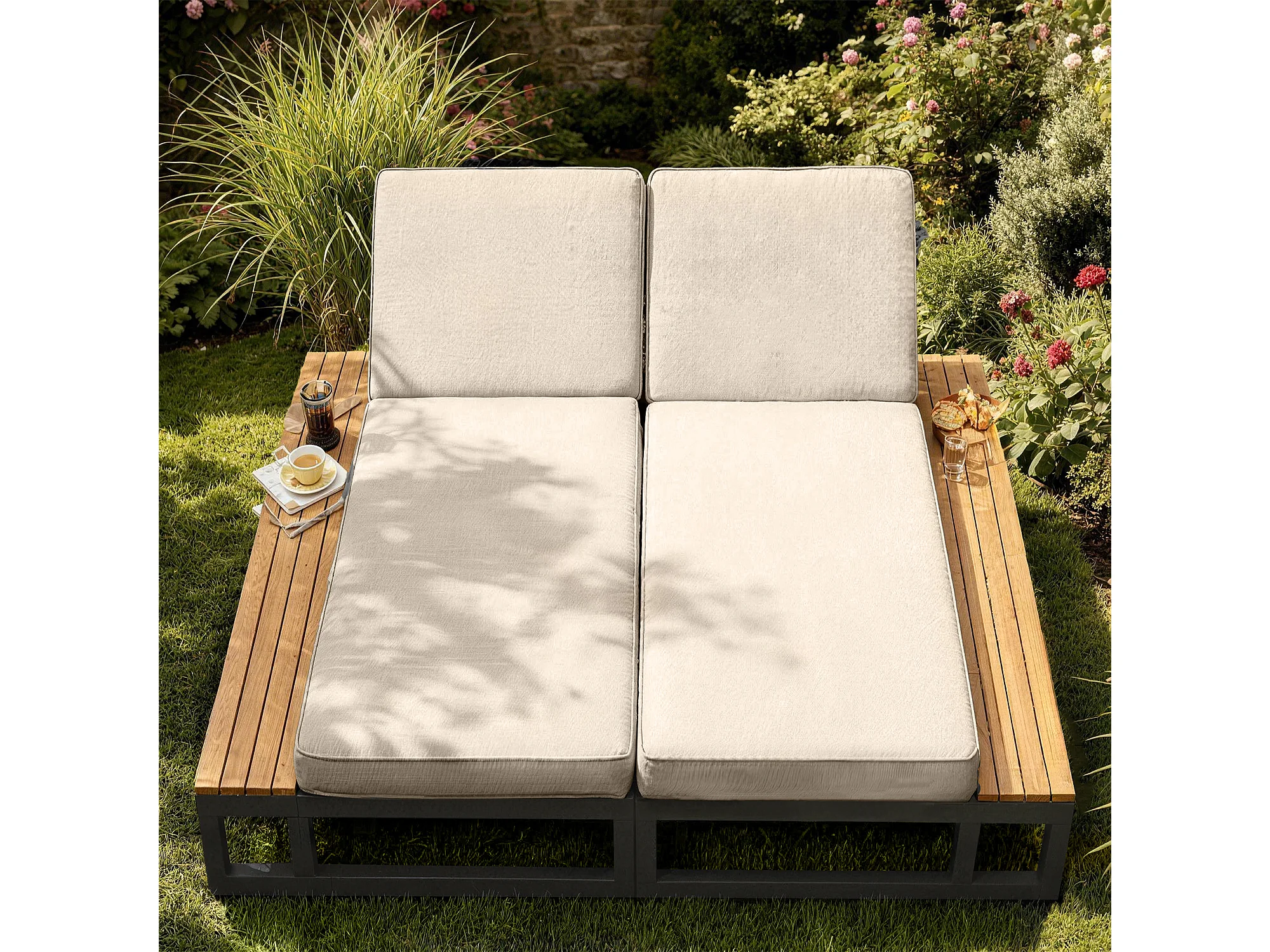 Tweepersoons ligstoel van metaal en waterdichte stof met verstelbare rugleuning - Beige