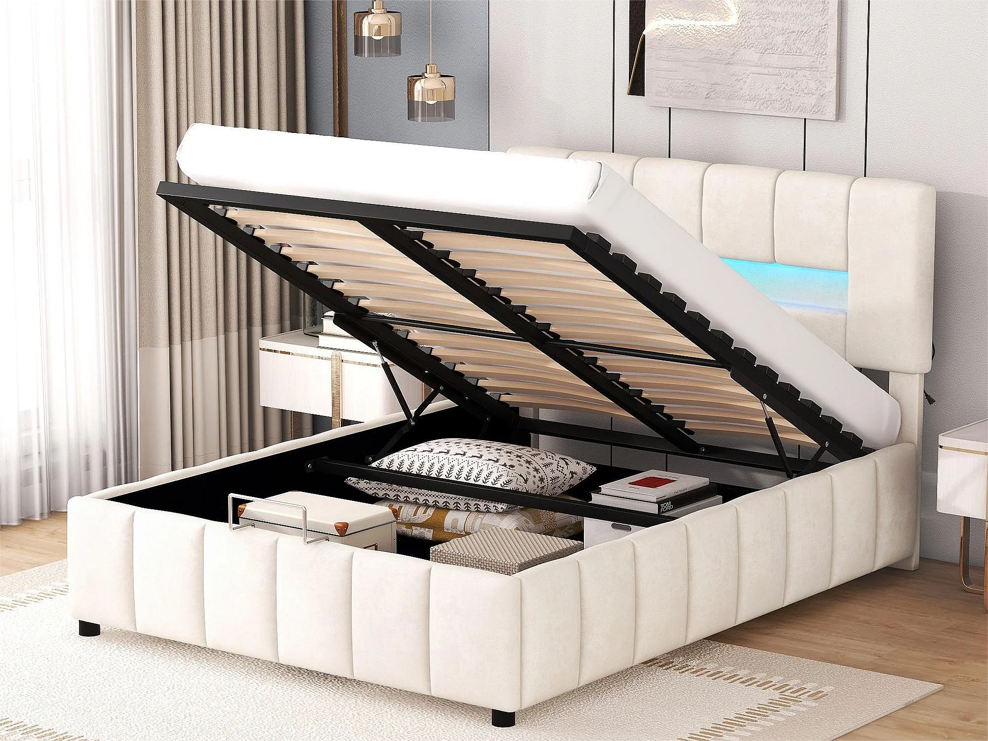 Tweepersoons opbergbed 140x200cm, gewatteerd bed, familiebed, platformbed met LED-verlichting, modern bedframe met opbergruimte, wit