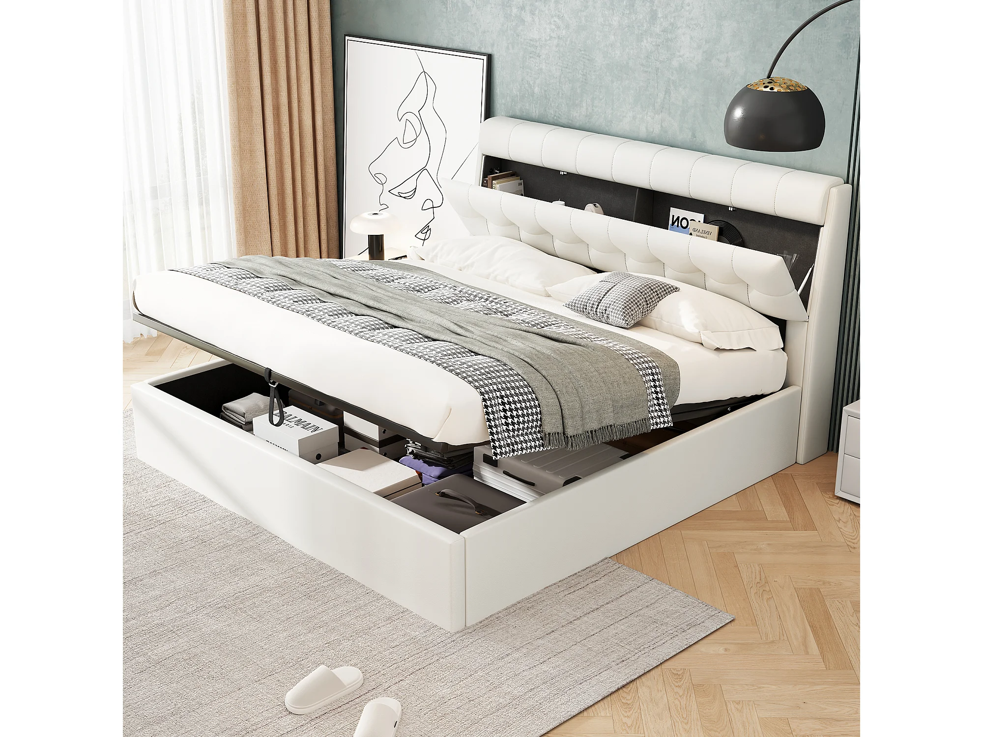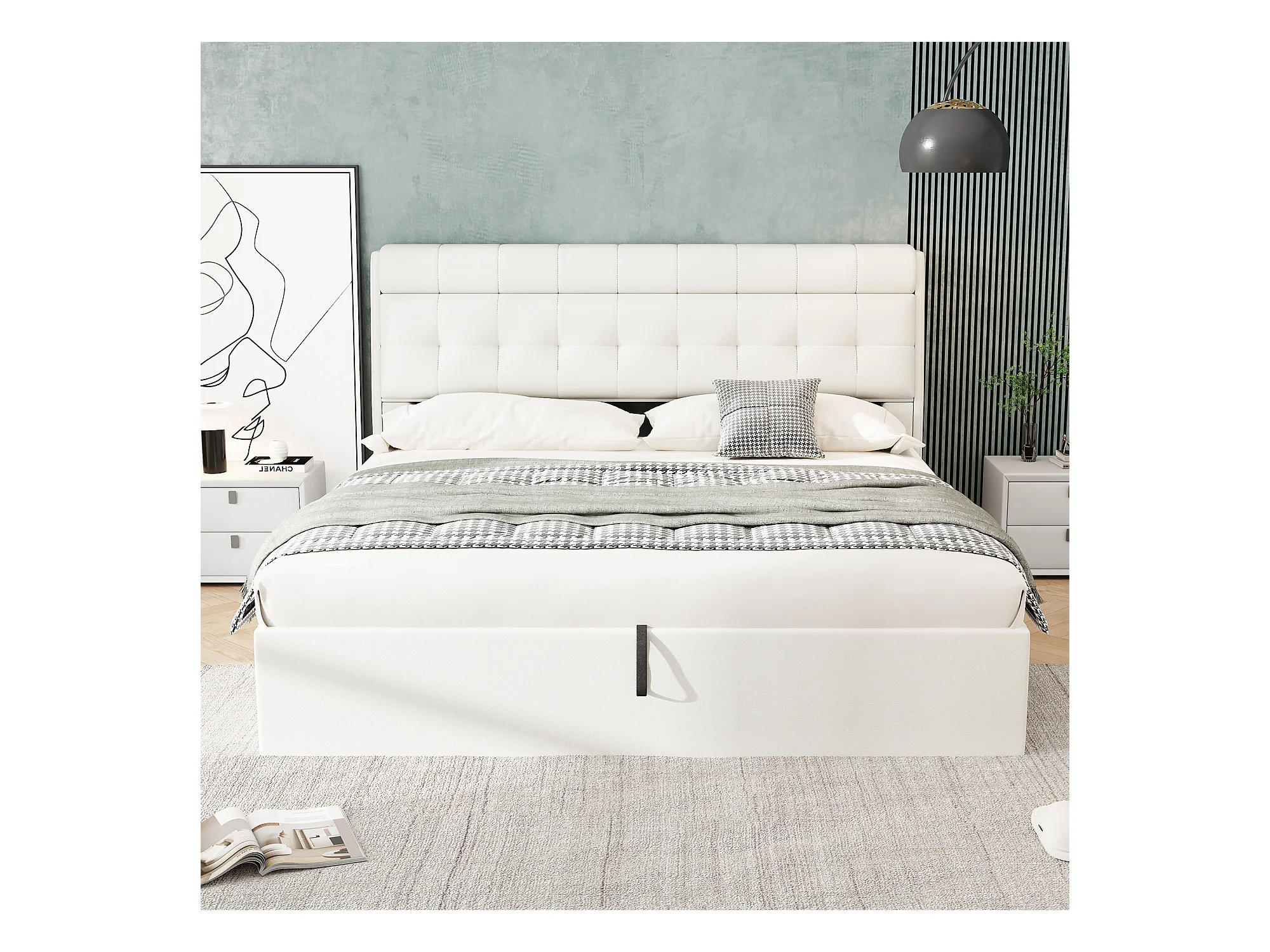 Tweepersoons opbergbed 180x200 cm, hydraulisch bed met verborgen hoofdbord, wit PU materiaal (zonder matras)