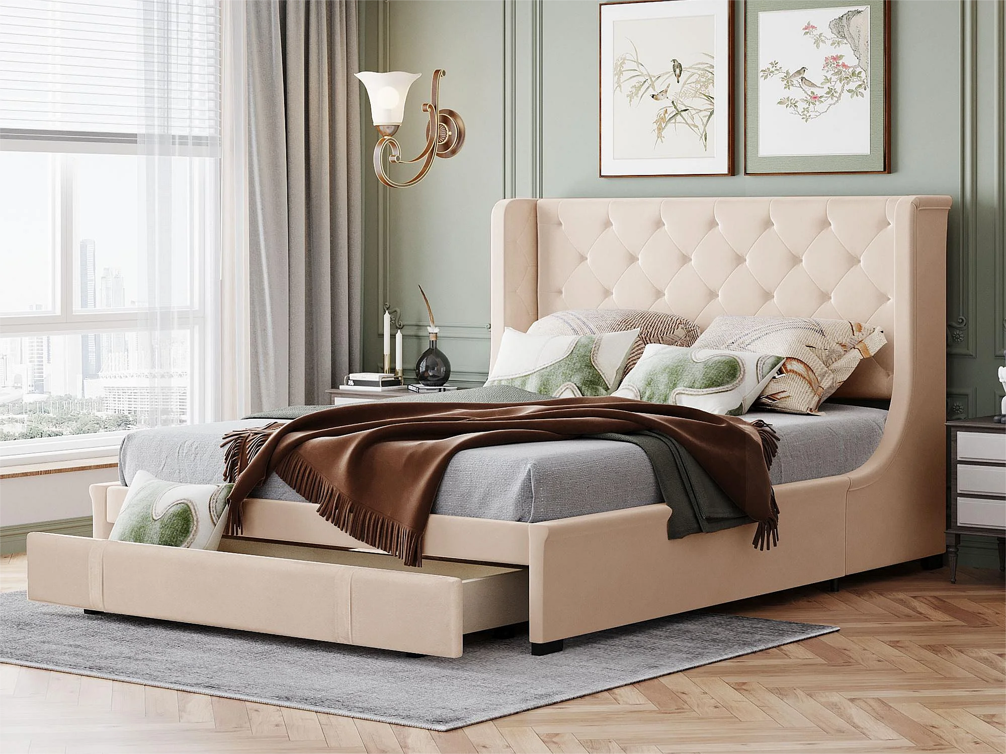 Tweepersoonsbed 140 x 200 cm met grote lade, inclusief lattenbodem, beige stof