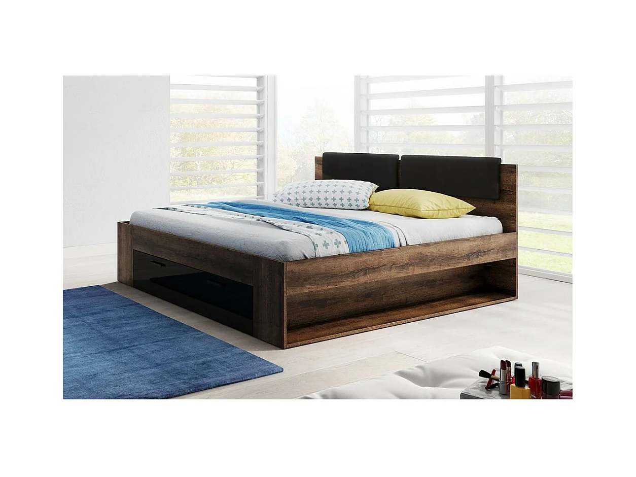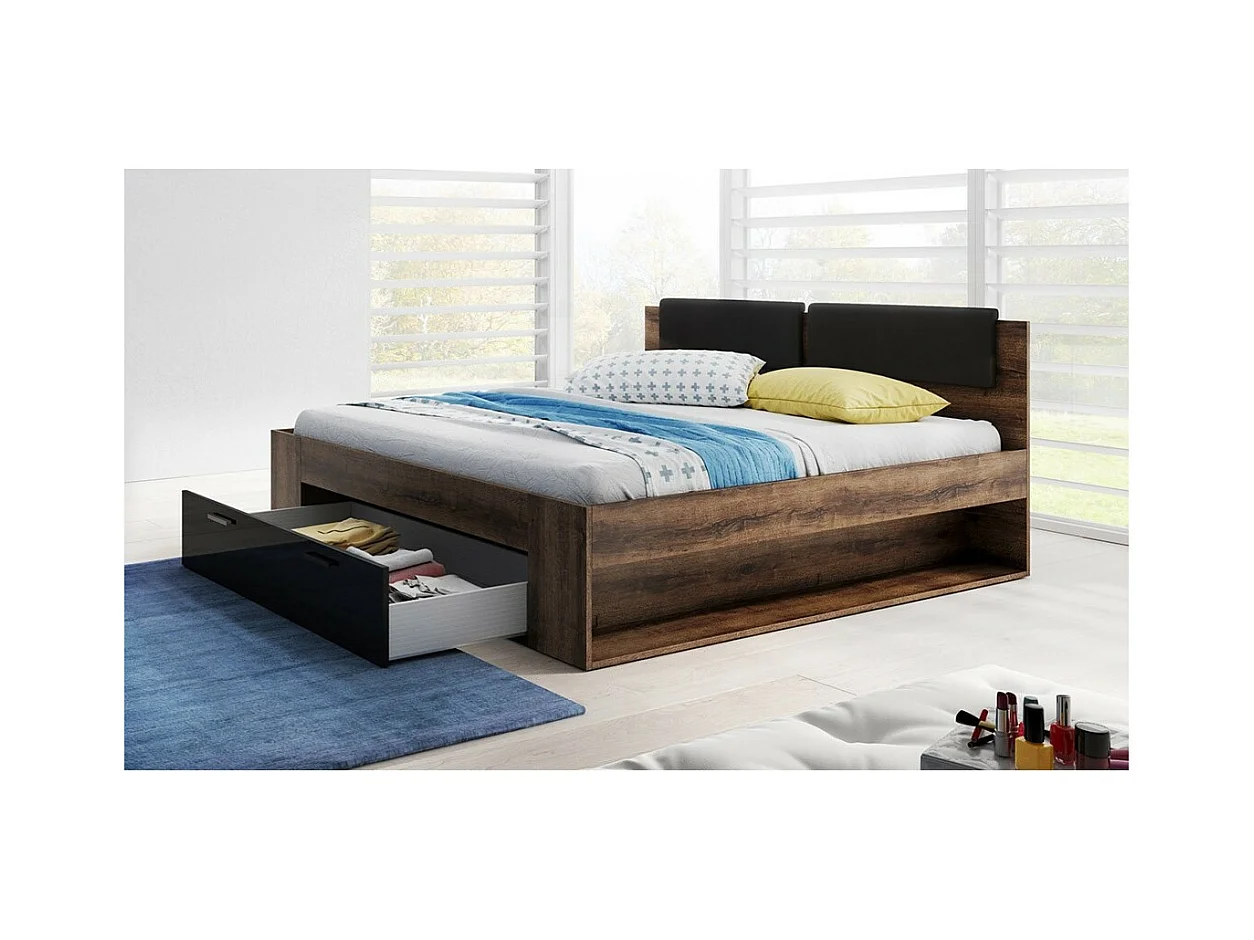 Tweepersoonsbed 140x200 met ingebouwde lades - Collectie FLOYD. Kleur donkereiken en zwart.
