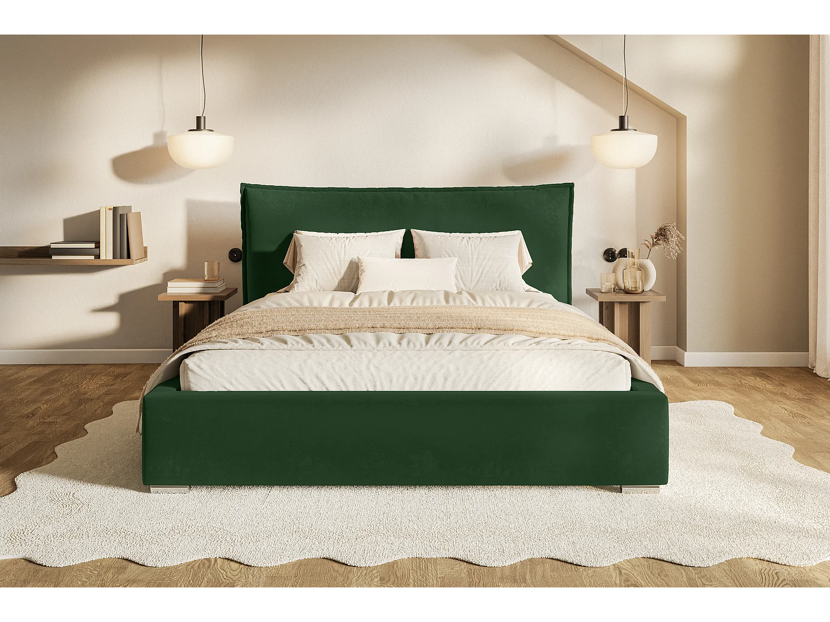 Tweepersoonsbed 140x200 Zenito met opbergruimte - hoofdbord in kussenvorm, metalen lattenbodem - Groen (Amor Velvet 4311)