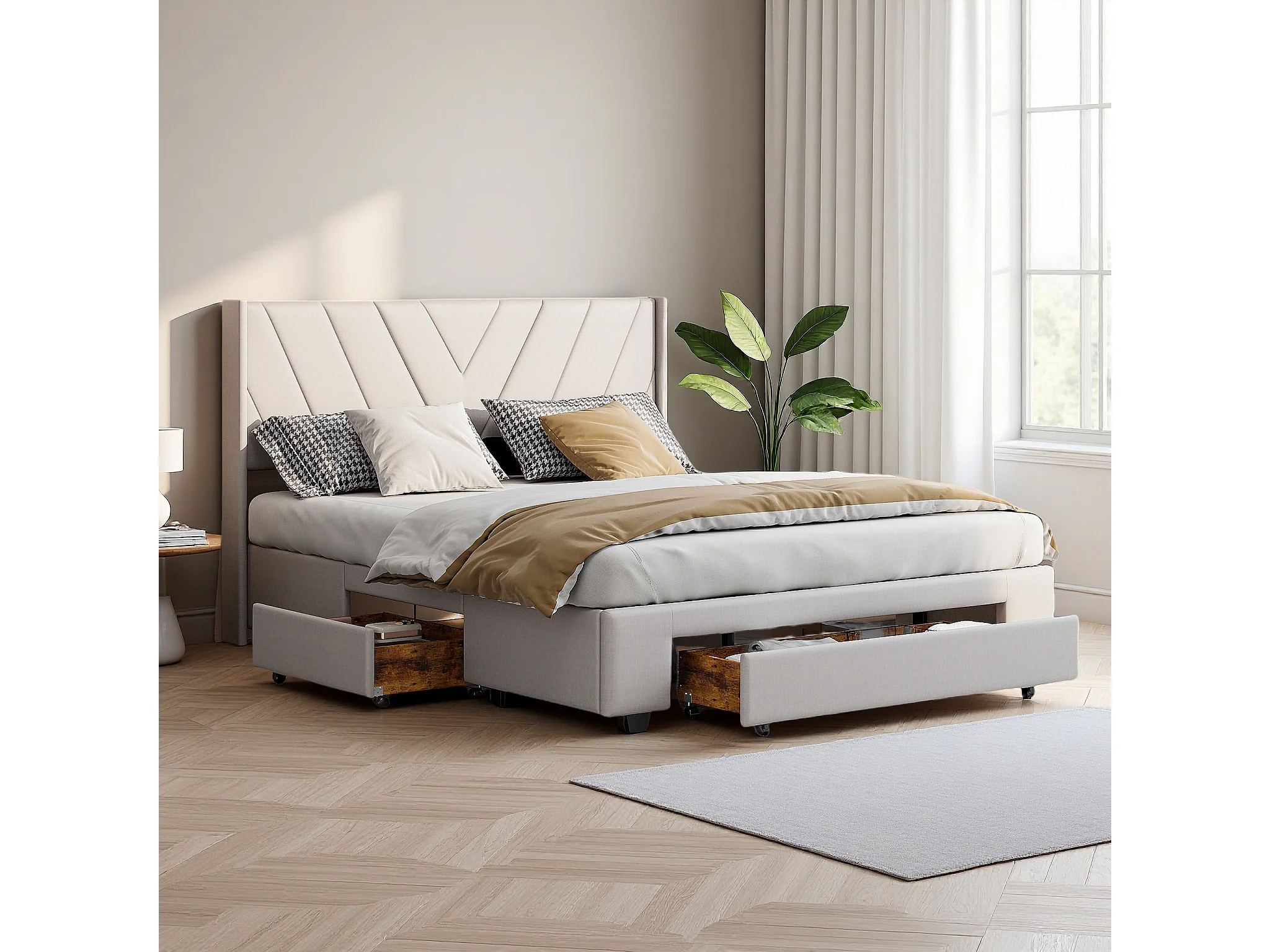 Gestoffeerd tweepersoonsbed 160x200 cm met 3 lades en opbergruimte, bed voor tieners met lattenbodem, zonder matras, linnen, beige