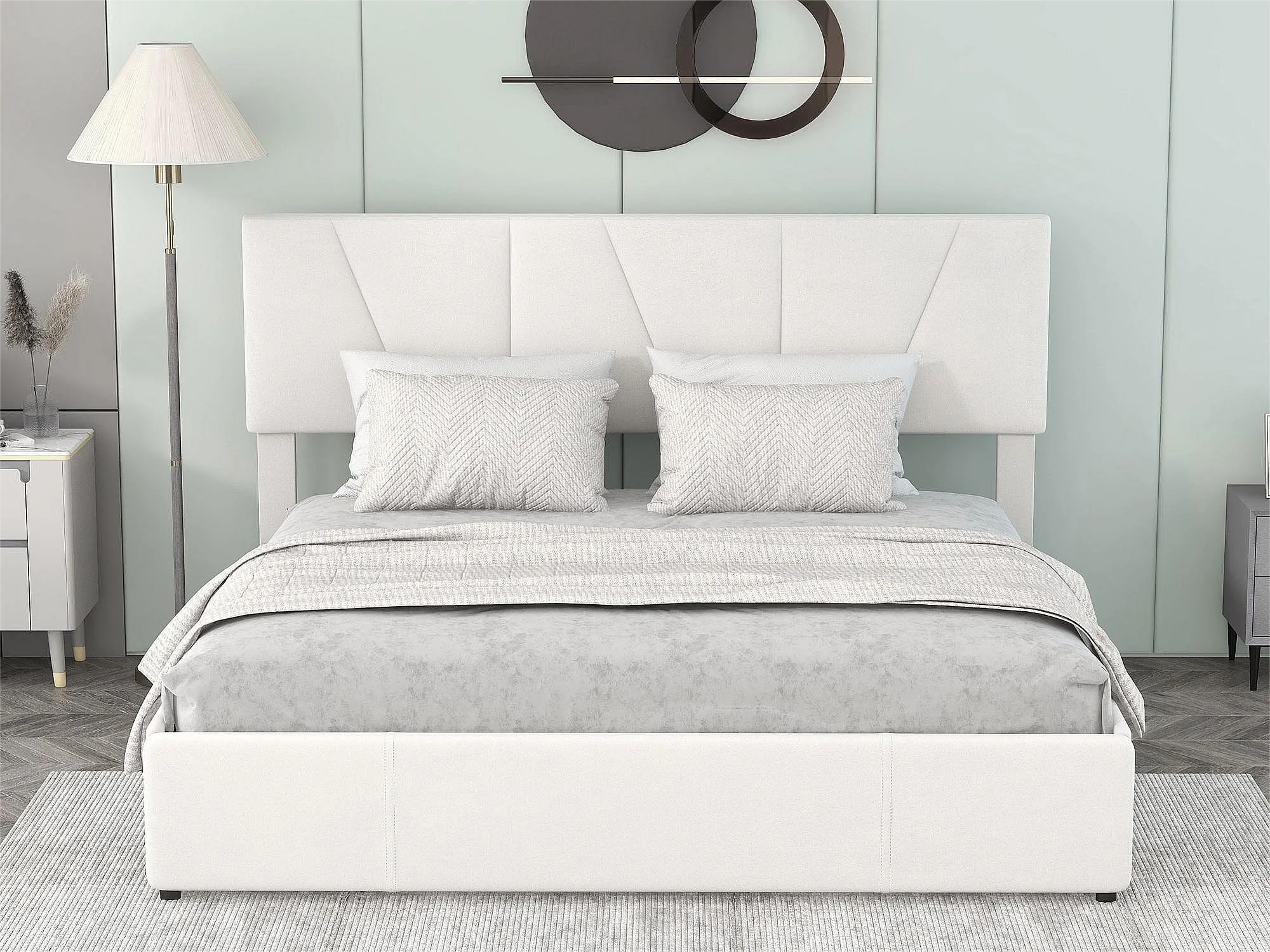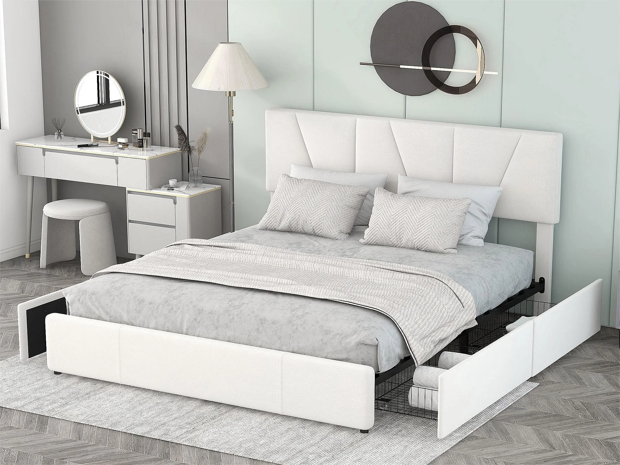 Tweepersoonsbed 160x200cm met 4 laden, gewatteerd bed voor 2 personen, fluwelen stof, verstelbaar hoofdeinde, modern design, wit