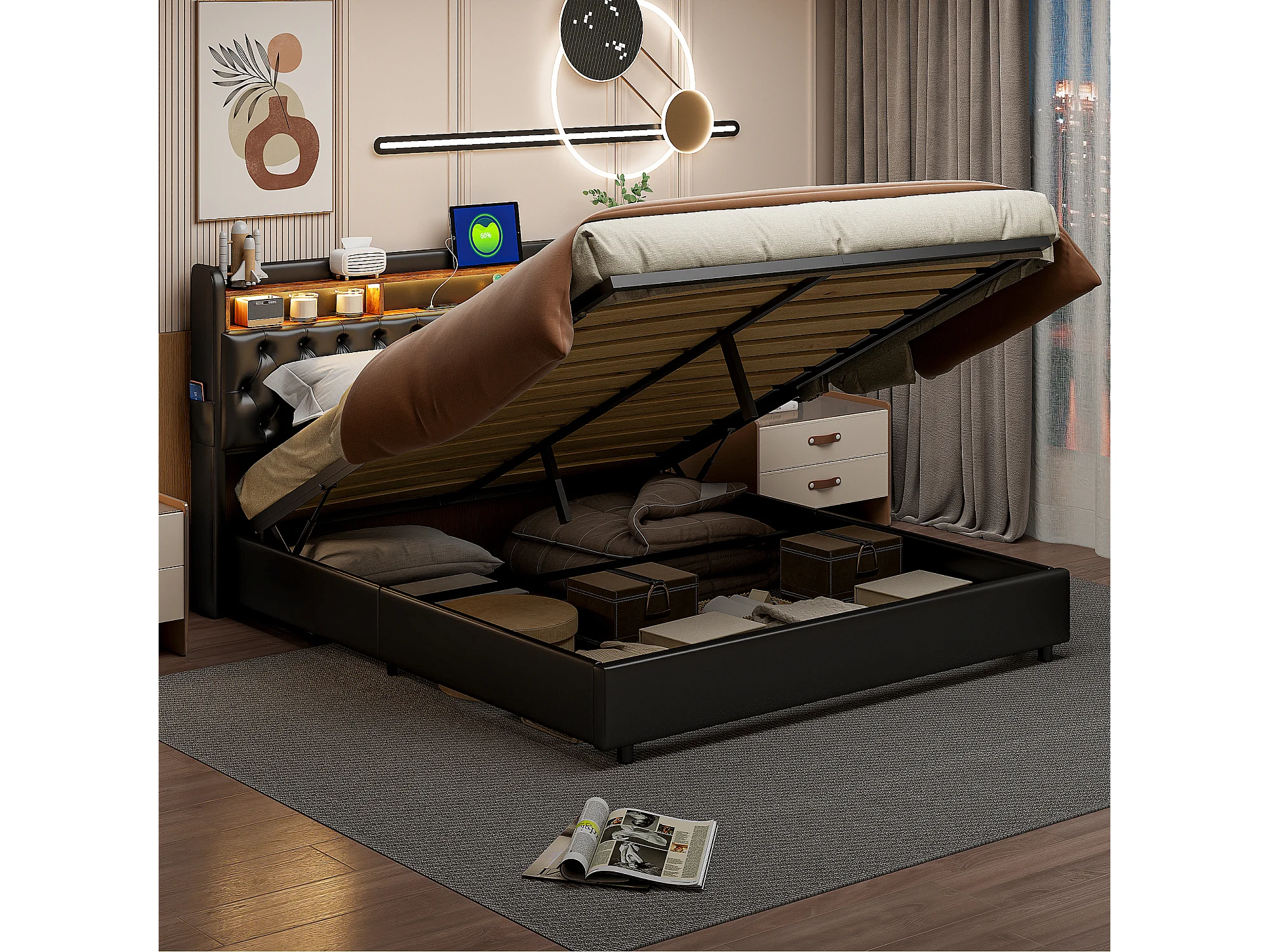 Tweepersoonsbed 180x200 cm in zwart PU met opbergruimte, led-hoofdbord, praktische opbergruimte en geïntegreerde EU USB-poorten
