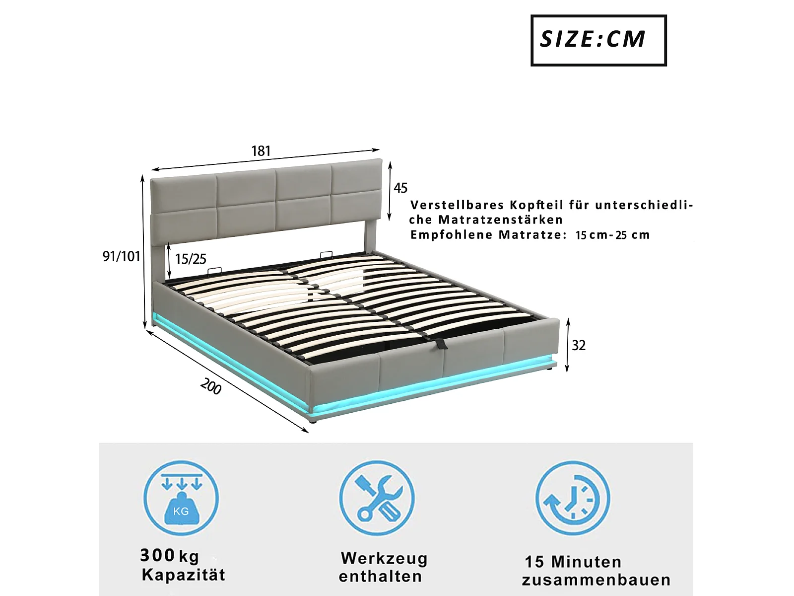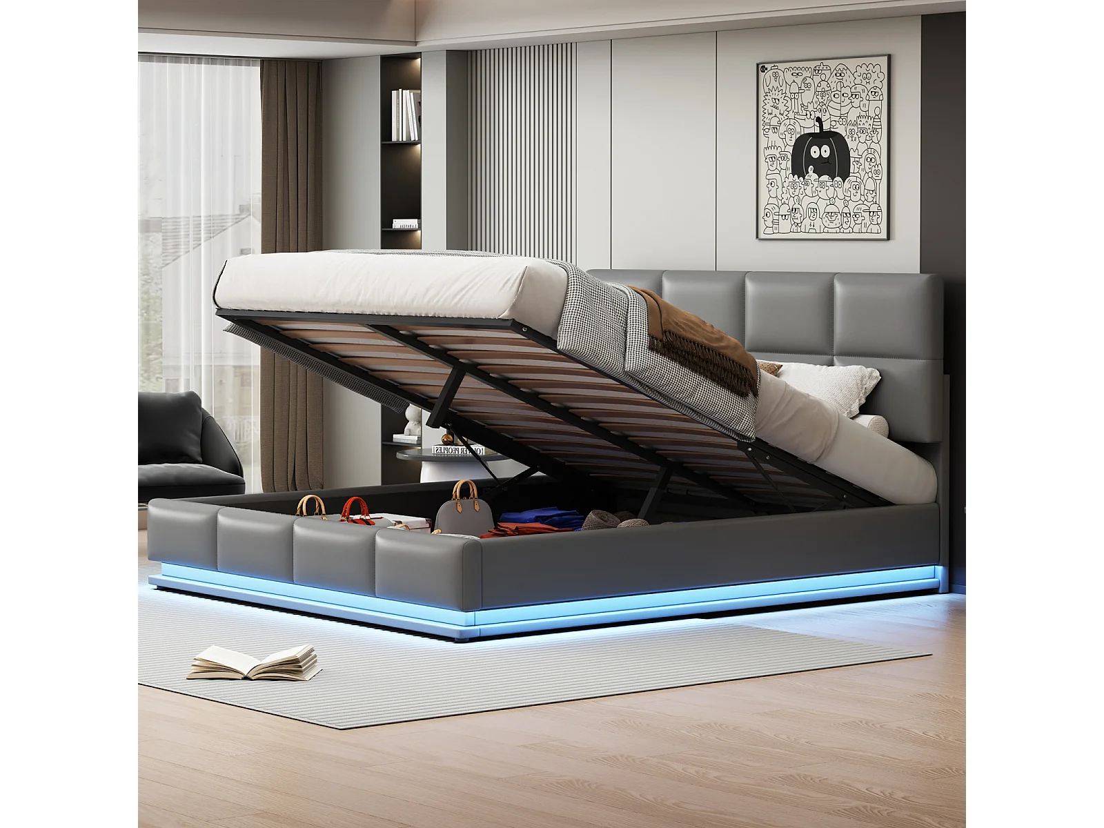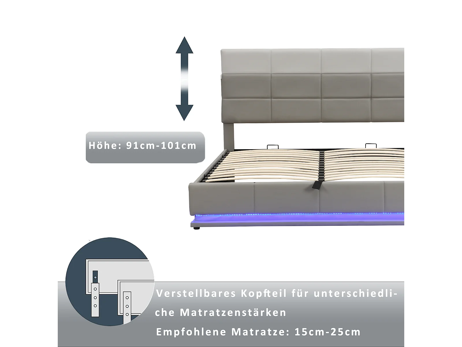Tweepersoonsbed 180x200cm in lichtgrijs imitatieleer met ledverlichting en hydraulisch opbergvak, inclusief lattenbodem