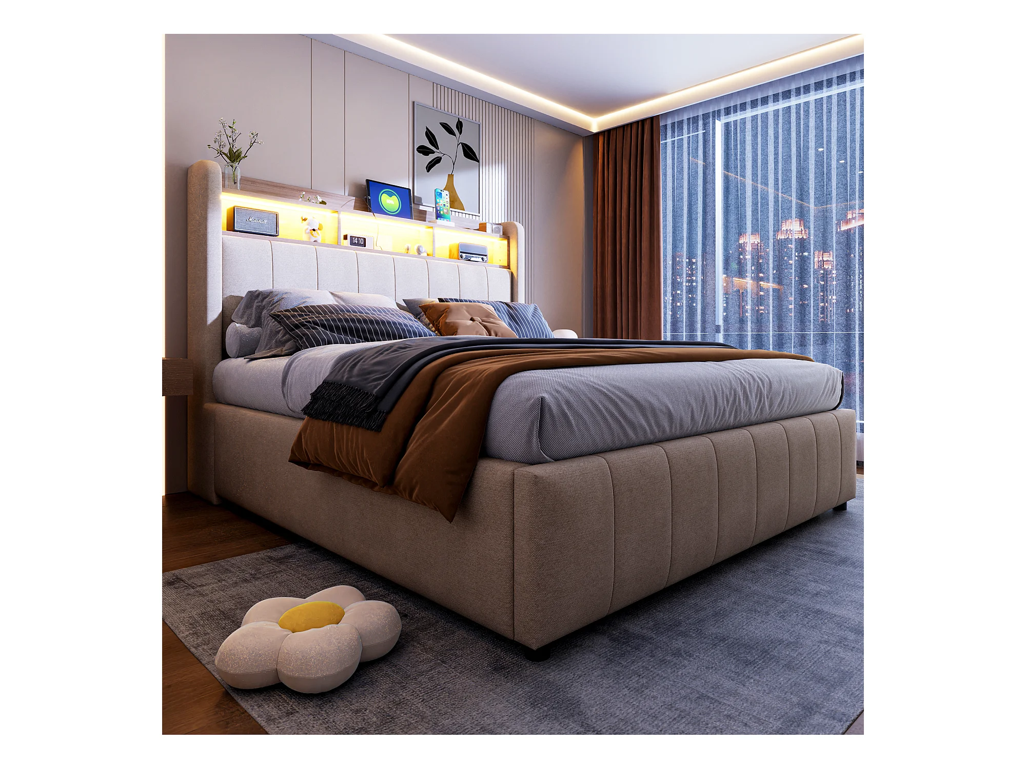 Volwassen opbergbed 140x200cm met LED en USB type-C, beige linnen stof, lattenbodem, zonder matras