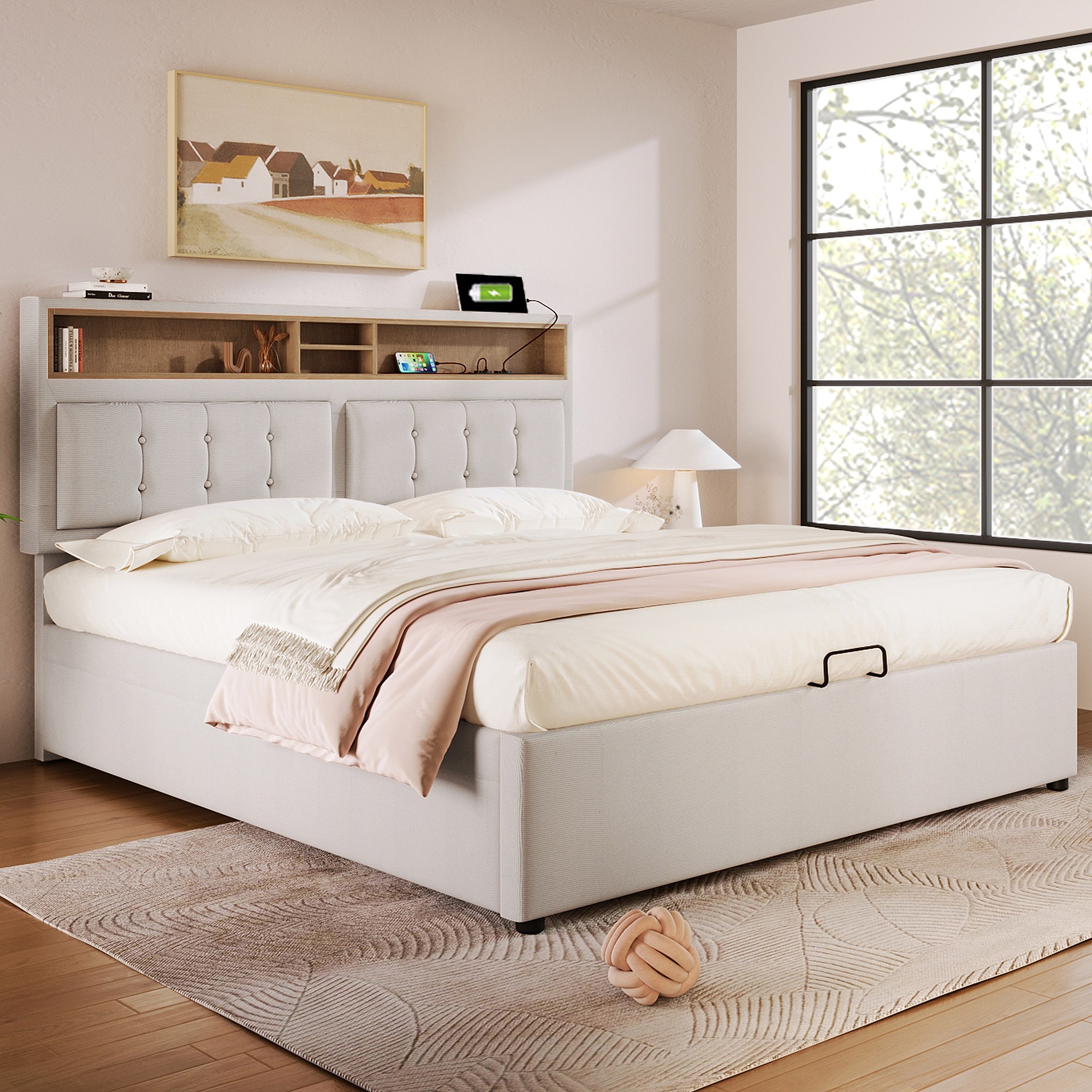 Tweepersoonsbed met opbergruimte, leeslampje en USB-oplader, beige linnen (206x145x107cm)