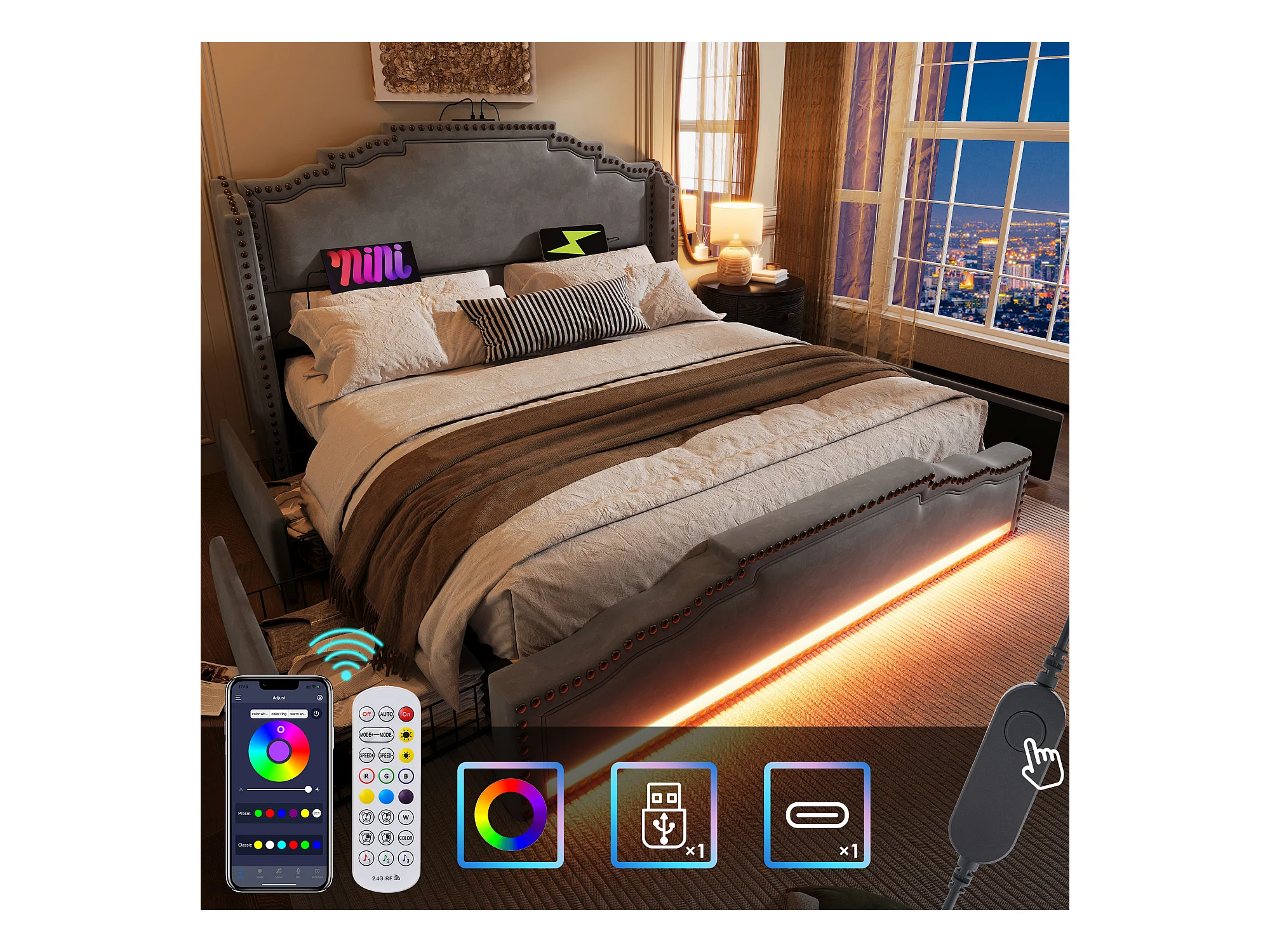 Gestoffeerd tweepersoonsbed 140x200cm, bedframe met LED-verlichting en USB-aansluiting, lattenbodem, grijs