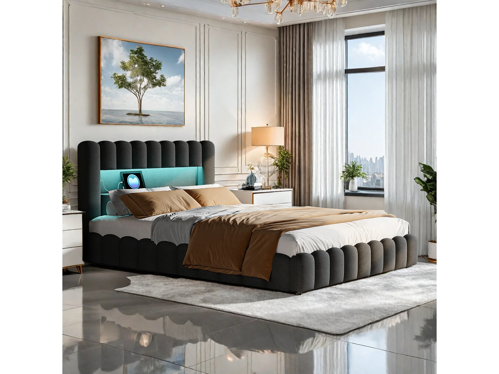 Tweepersoonsbedframe 140 x 200 cm, Grijs met opbergruimte, Linnen stof, LED-verlichting, Hoofdbord en oplaadstation, Lattenbodem