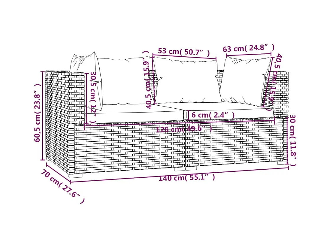 Tweezitsbank met kussens poly rattan zwart