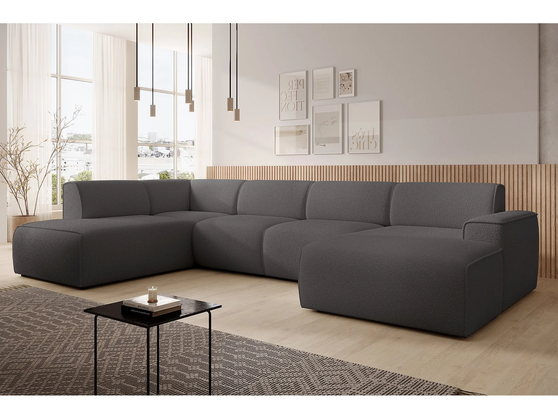 U-vormige bank met rugleuning aan de ottomane links – donkergrijs – bouclé – BOUVI