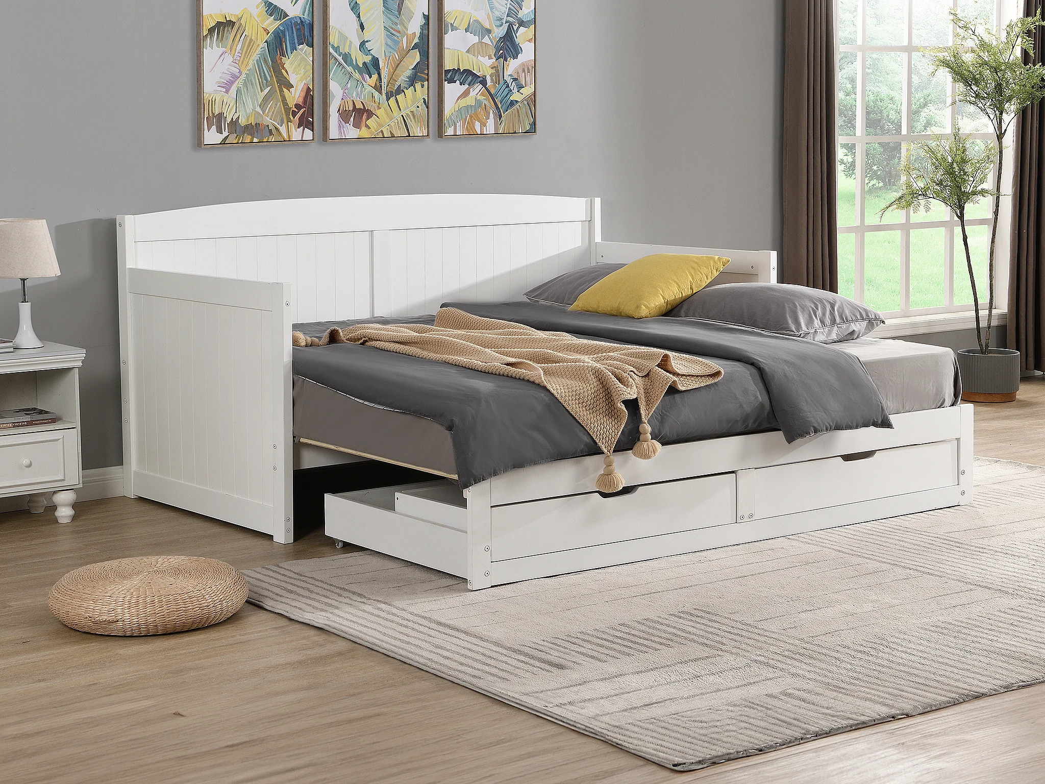 Uitschuifbaar bedbankje 90 x 190 of 180 x 190 cm - Met bedbodem met kamstructuur en lades - Grenen en mdf - Wit - DINIVA