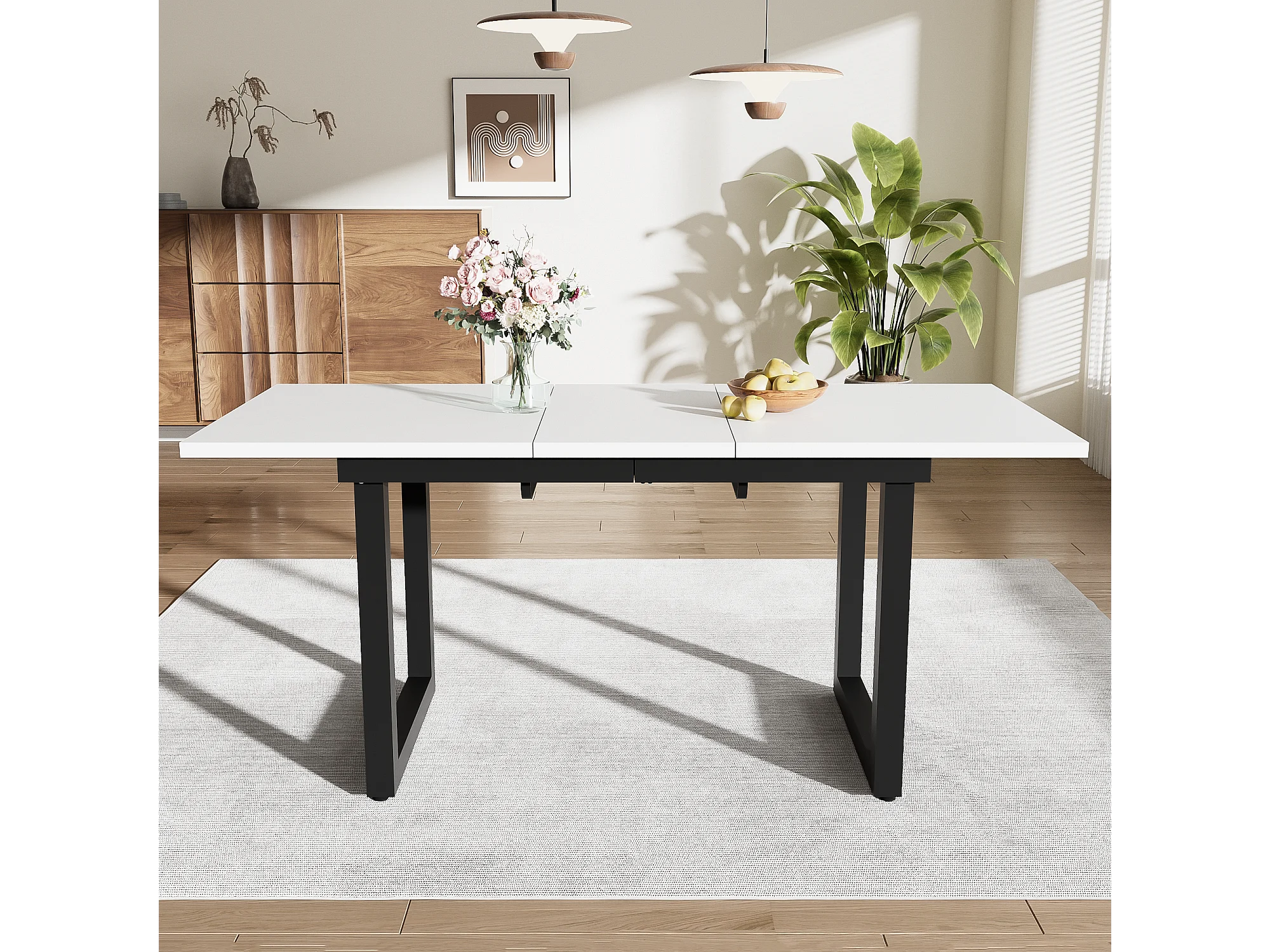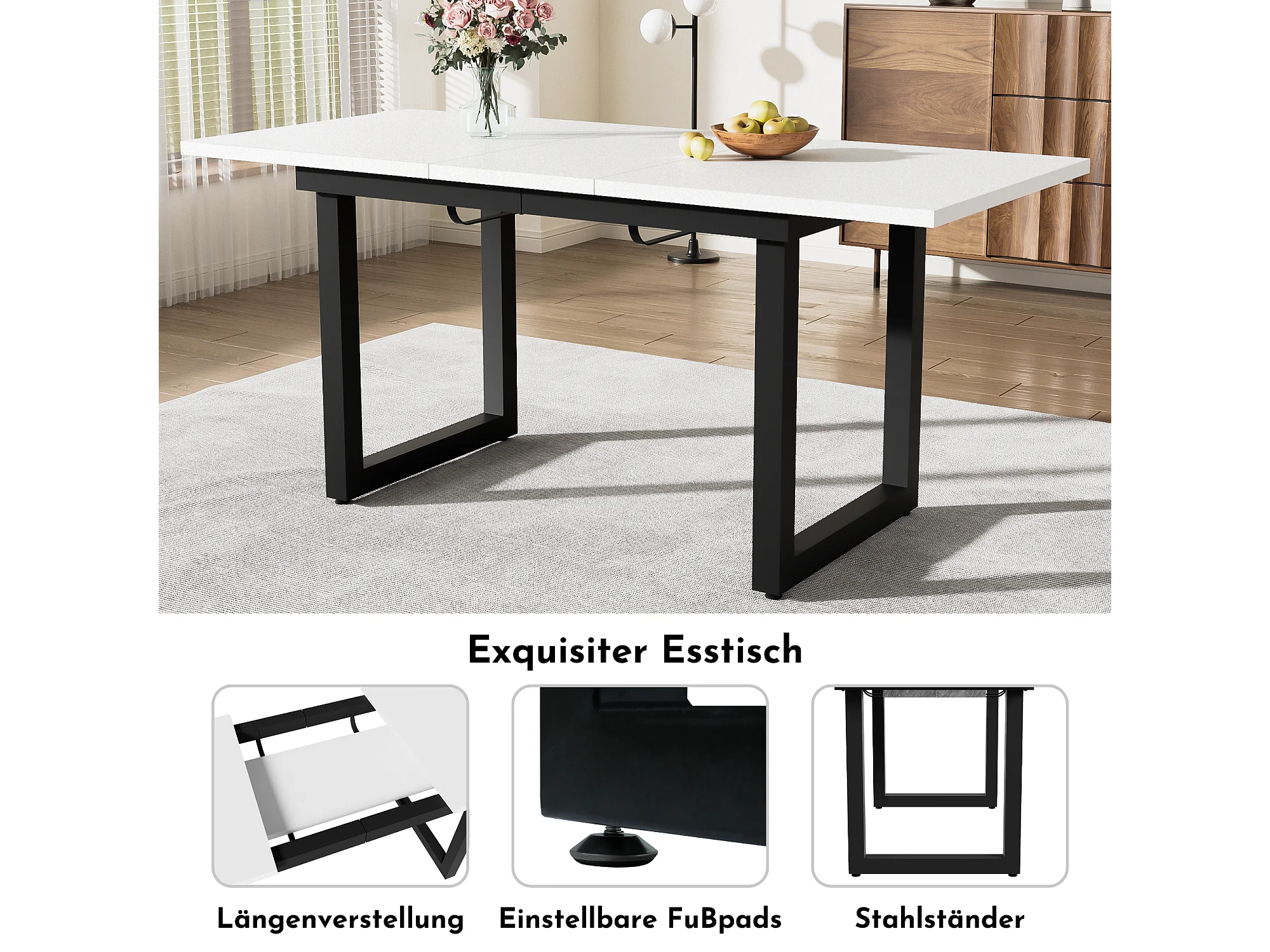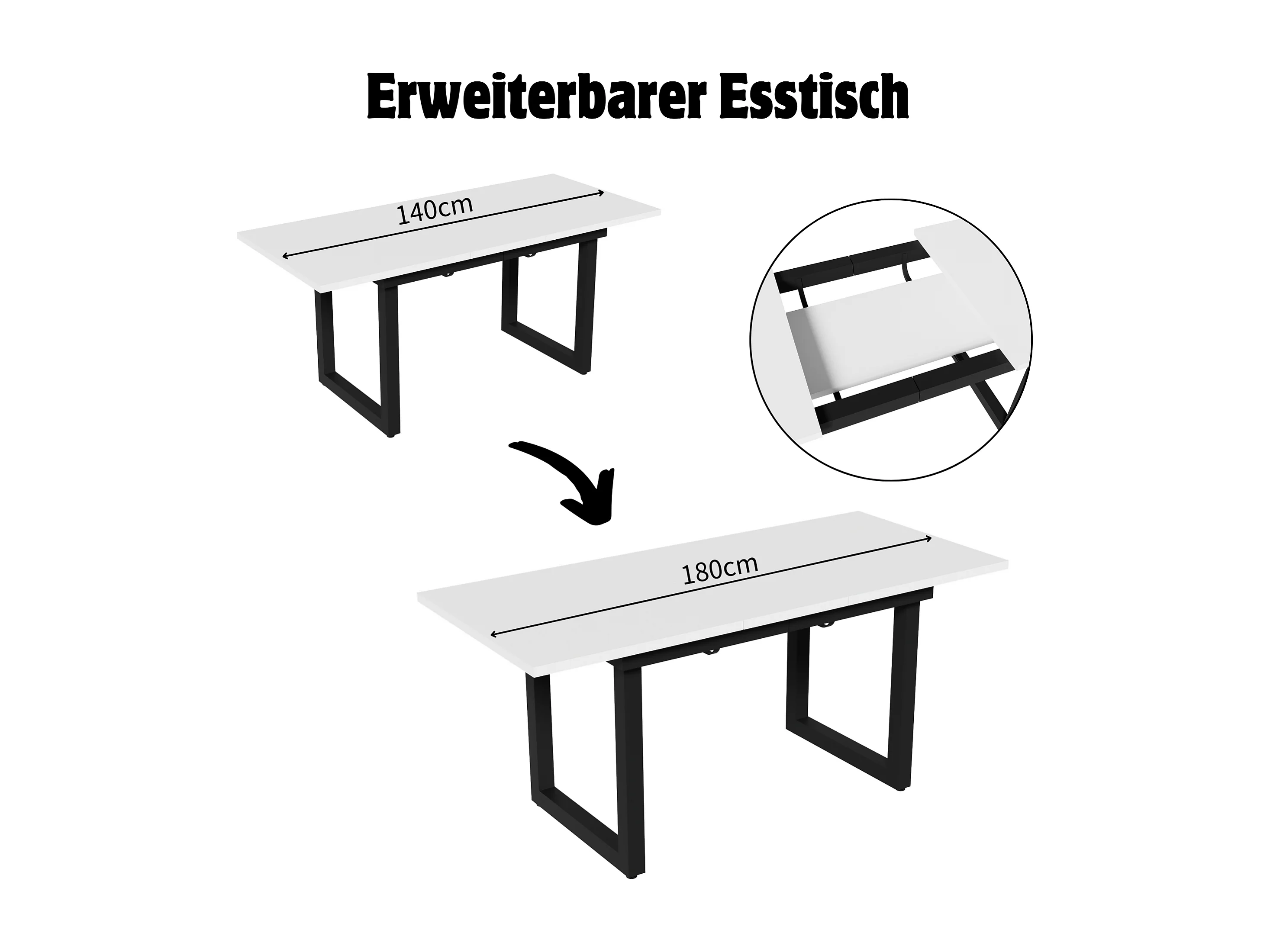 Uitschuifbare eettafel, industrieel design, stevig, gemaakt van MDF, metalen frame, moderne stijl, wit en zwart (140/180x80x75 cm)