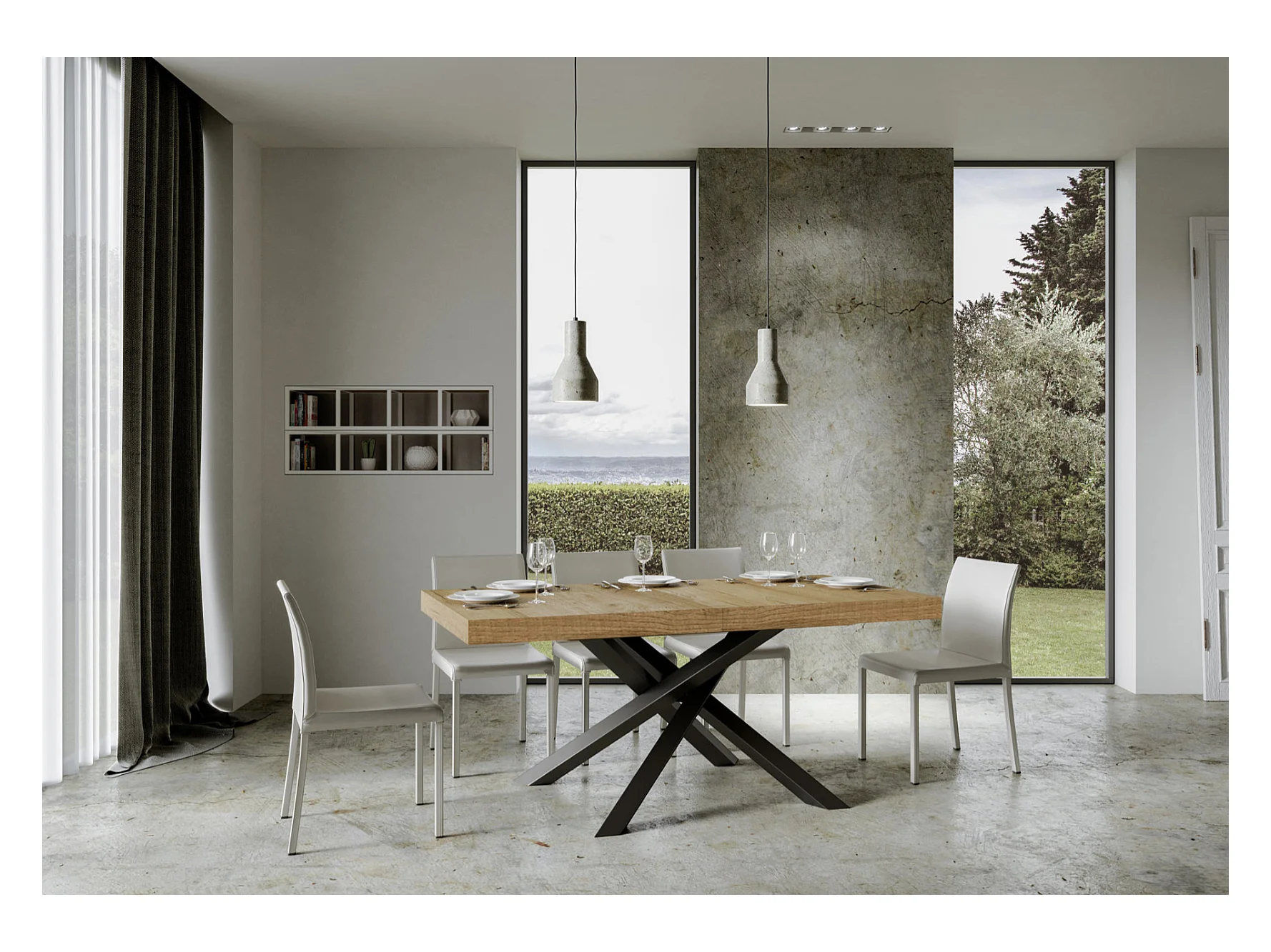 Kristo uitschuifbare houten V-poot eettafel-Kleur Natuurlijk-Voet en steun op zwenkwielen-Verlengsnoeren 5 dunne verlengingen-Uitschuifbare breedte