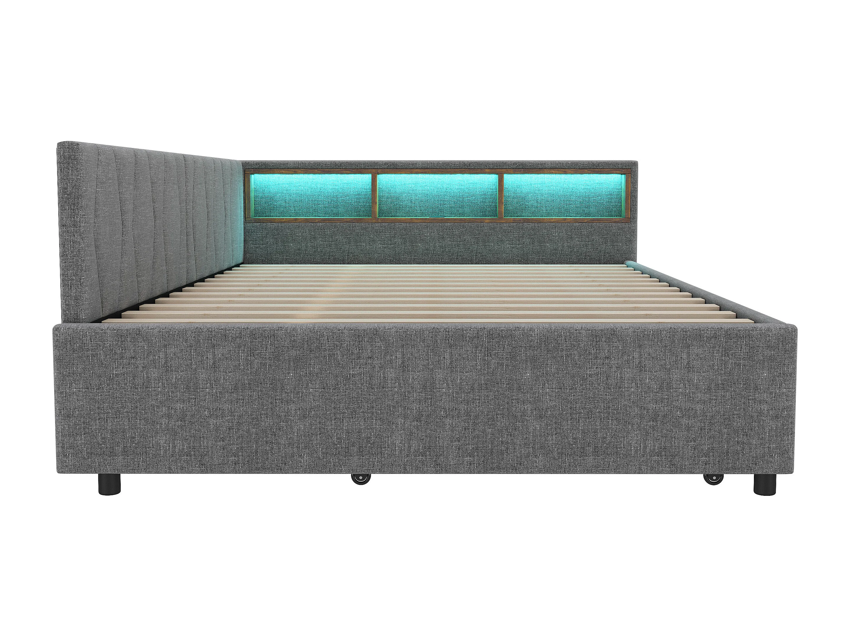 Uitschuifbed 140x200 cm, grijs linnen, slaapbank met USB-aansluitingen en led-verlichting, zonder matras
