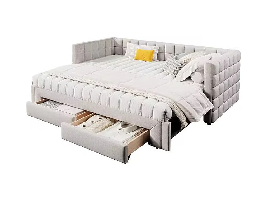Uitschuifbed 90/180x200cm in fluweel - met gewatteerde rugleuning en 2 lades - Beige