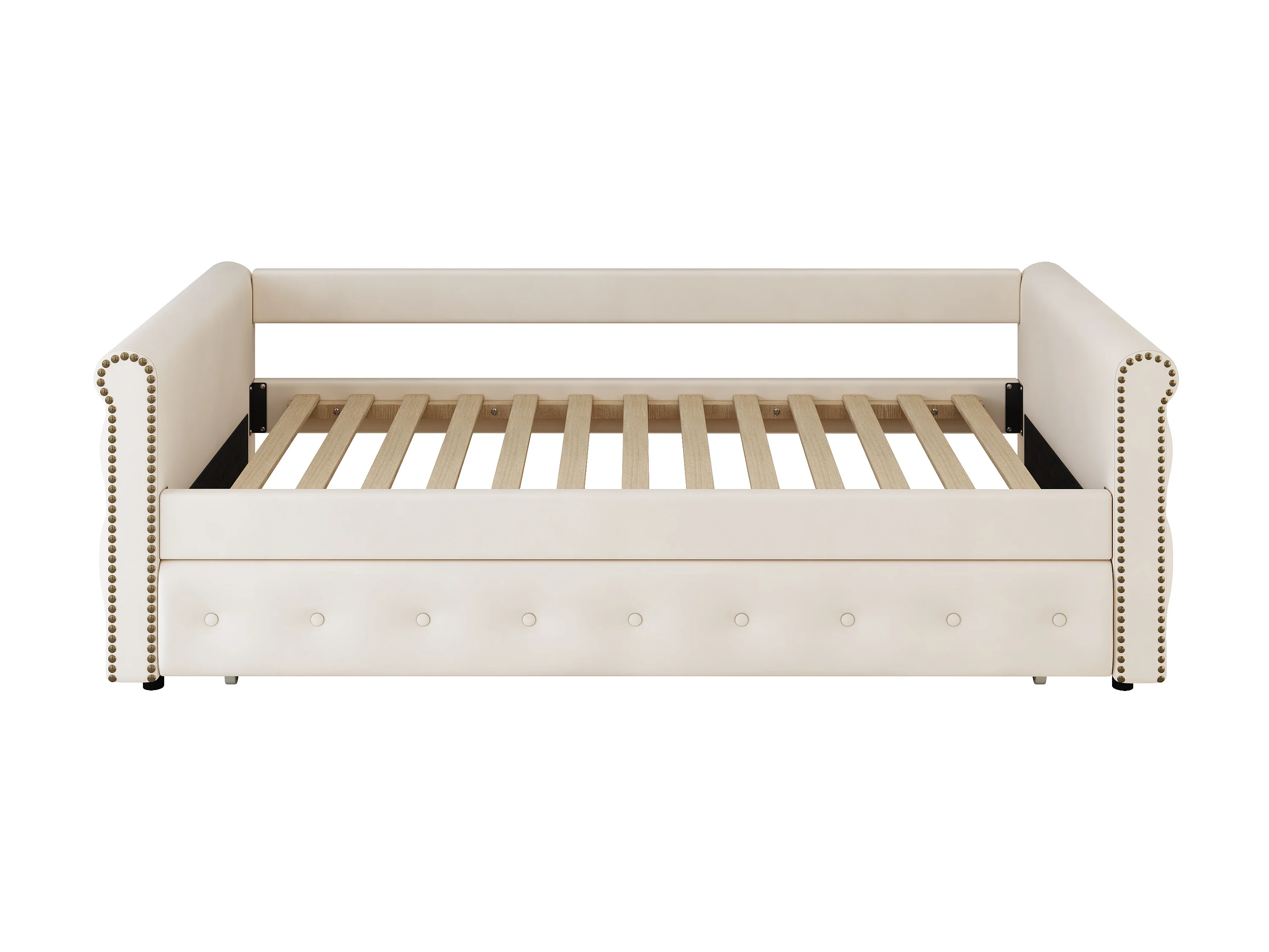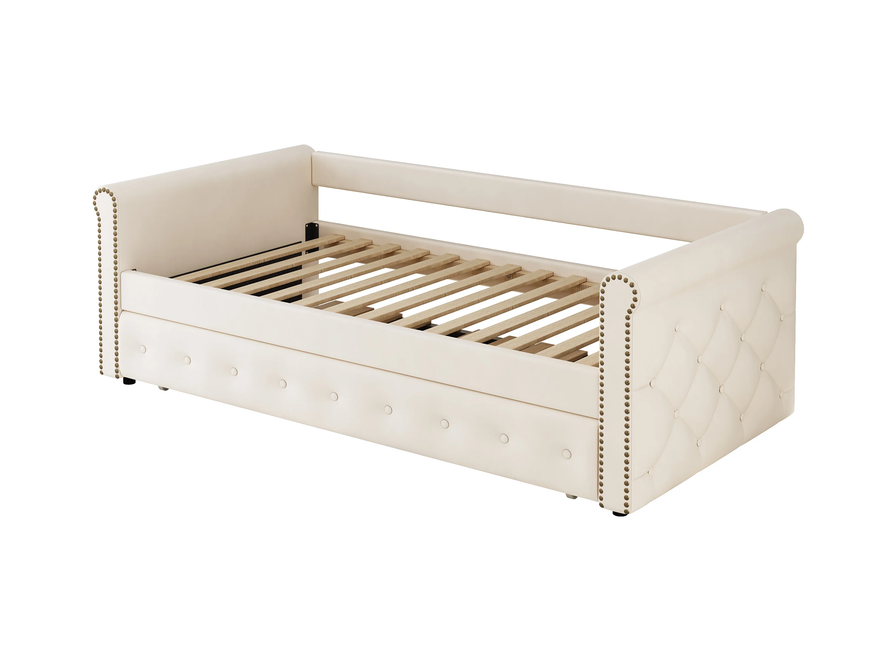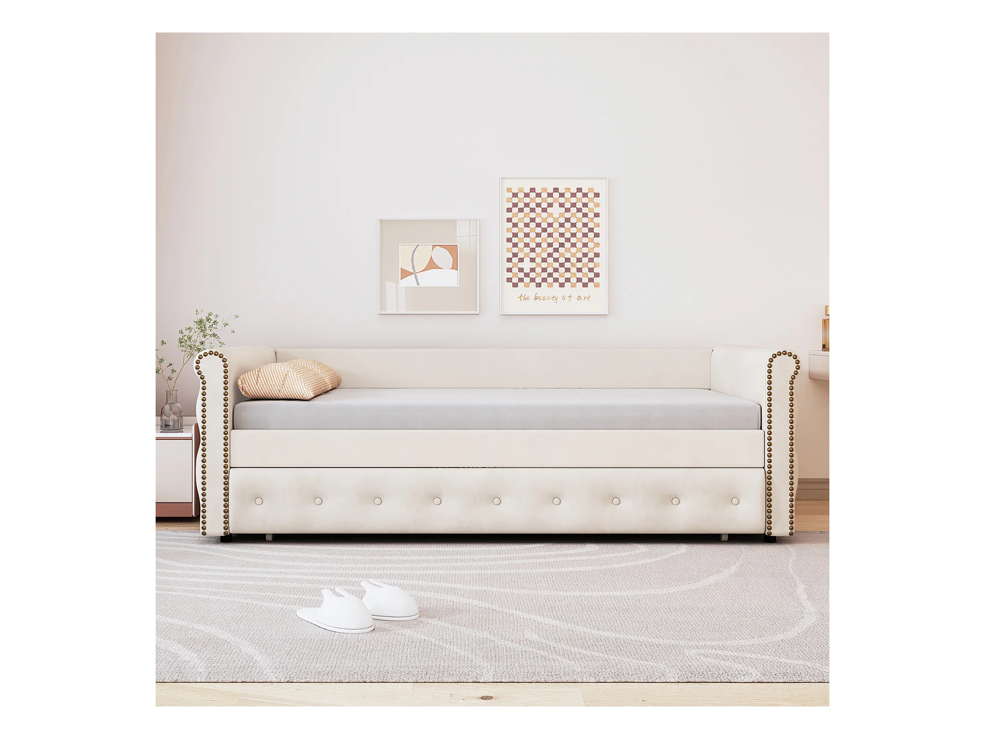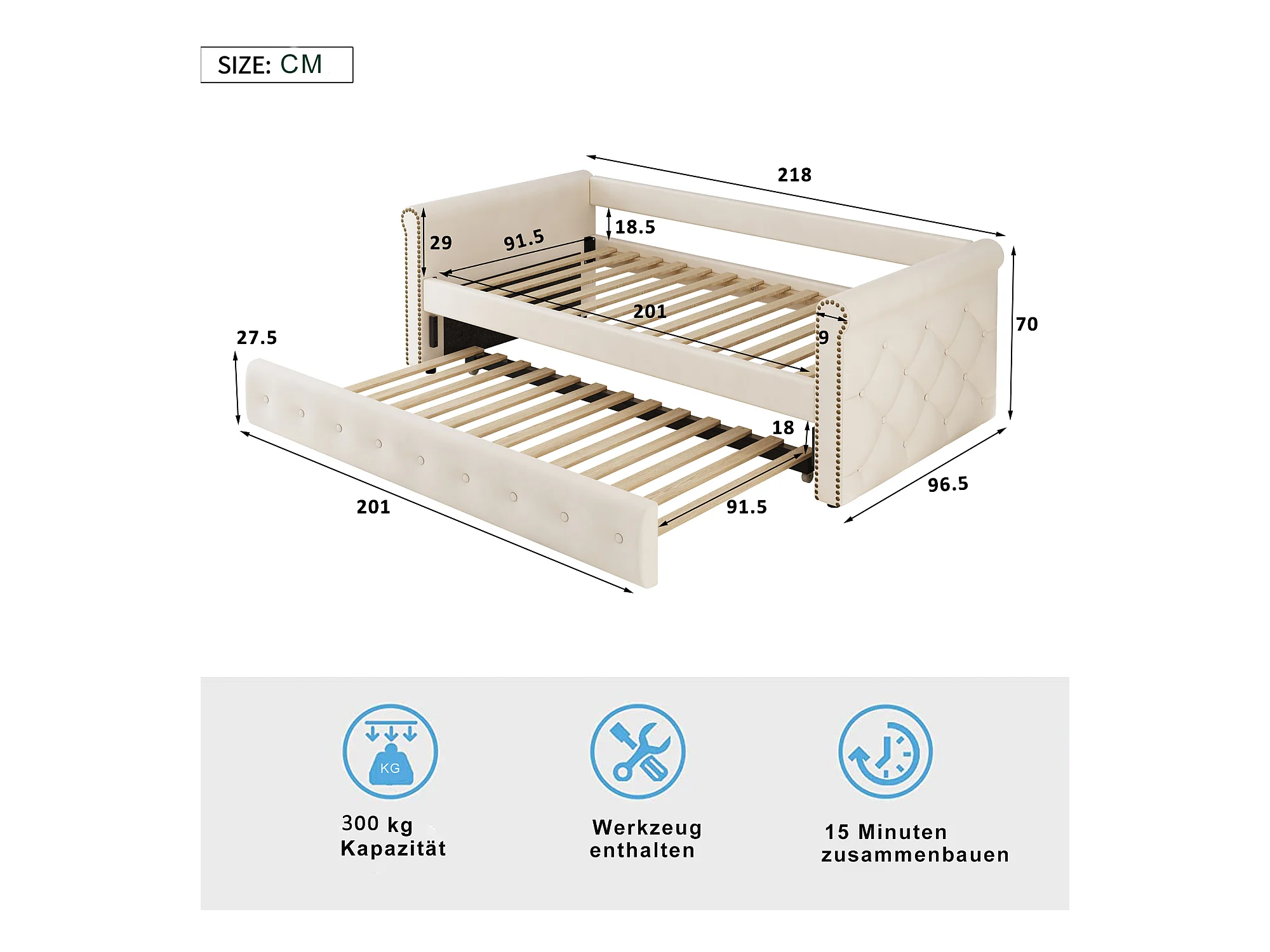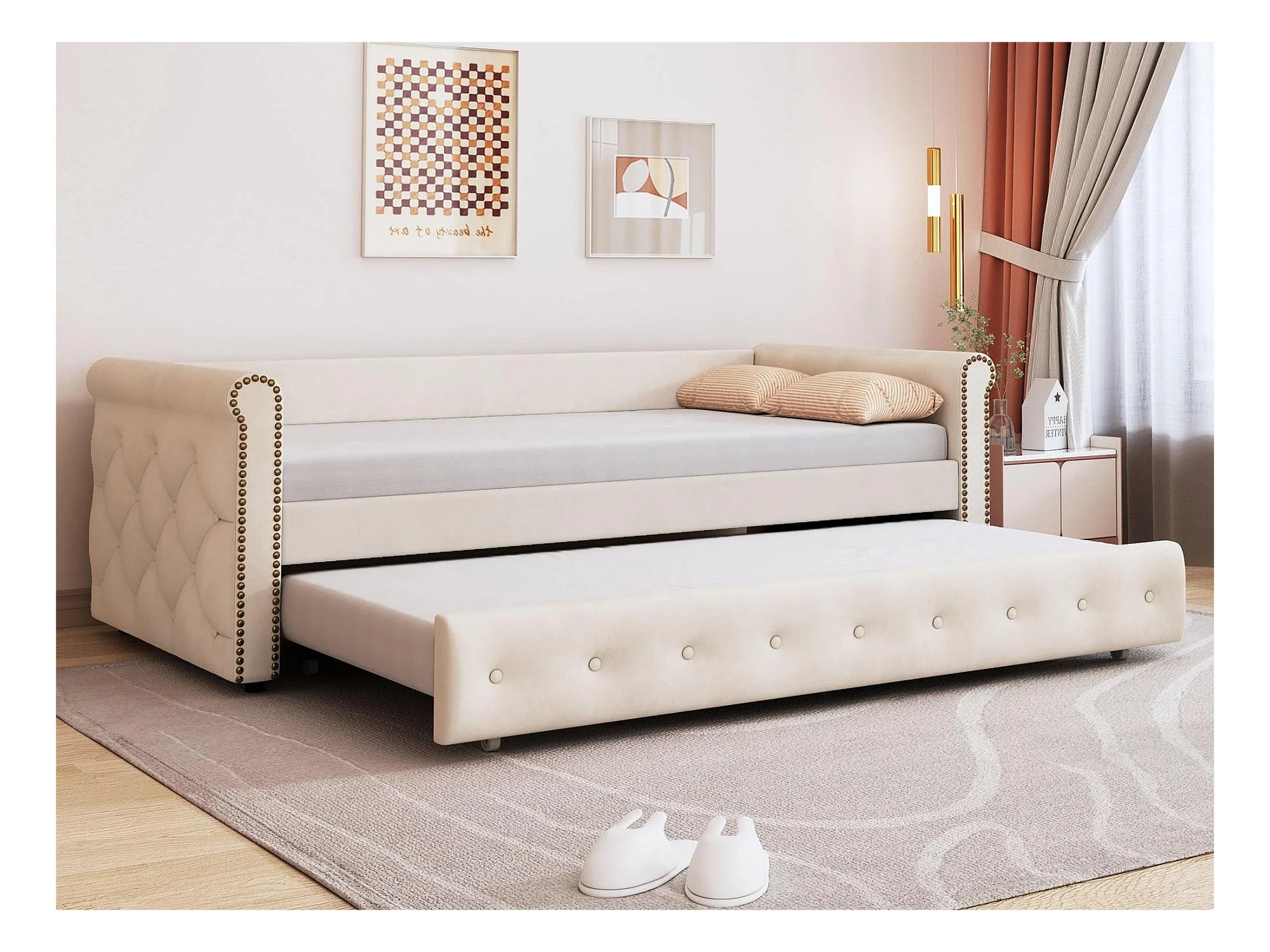 Uitschuifbed 90 x 200 cm - linnen stof - inclusief bedbodem - beige kleur