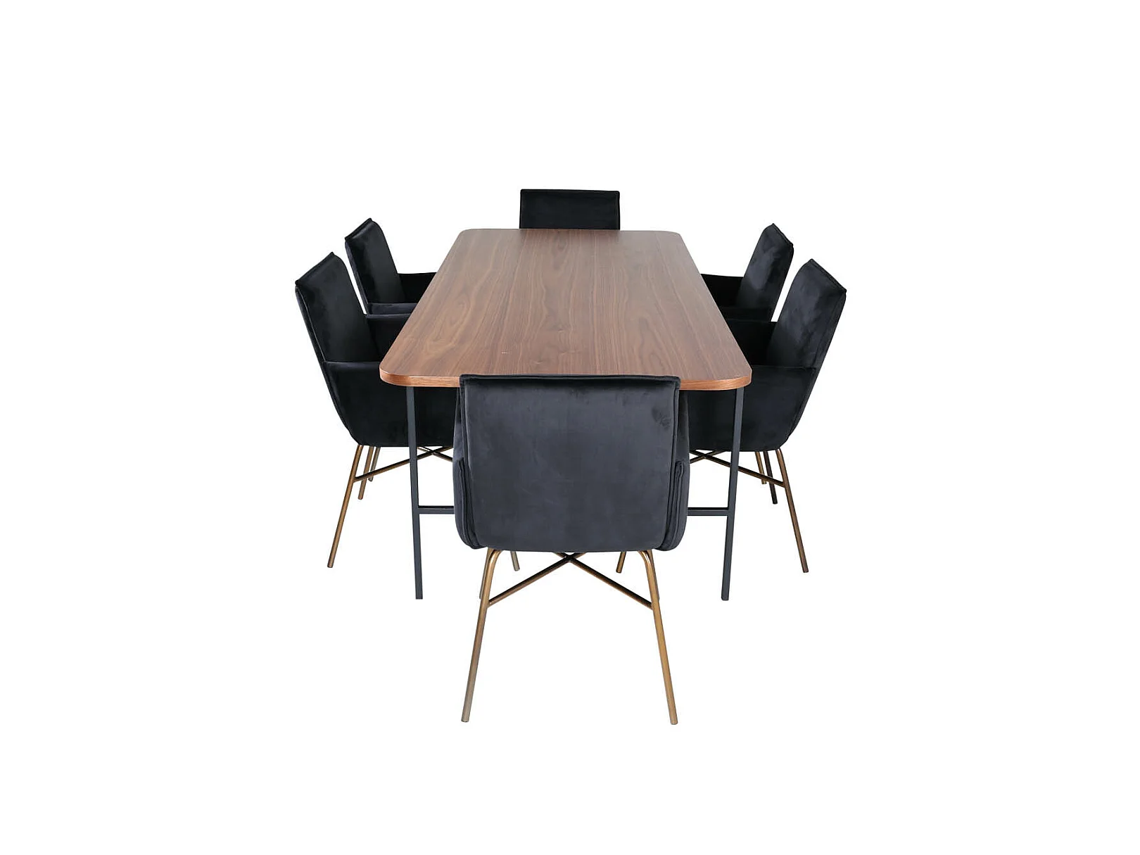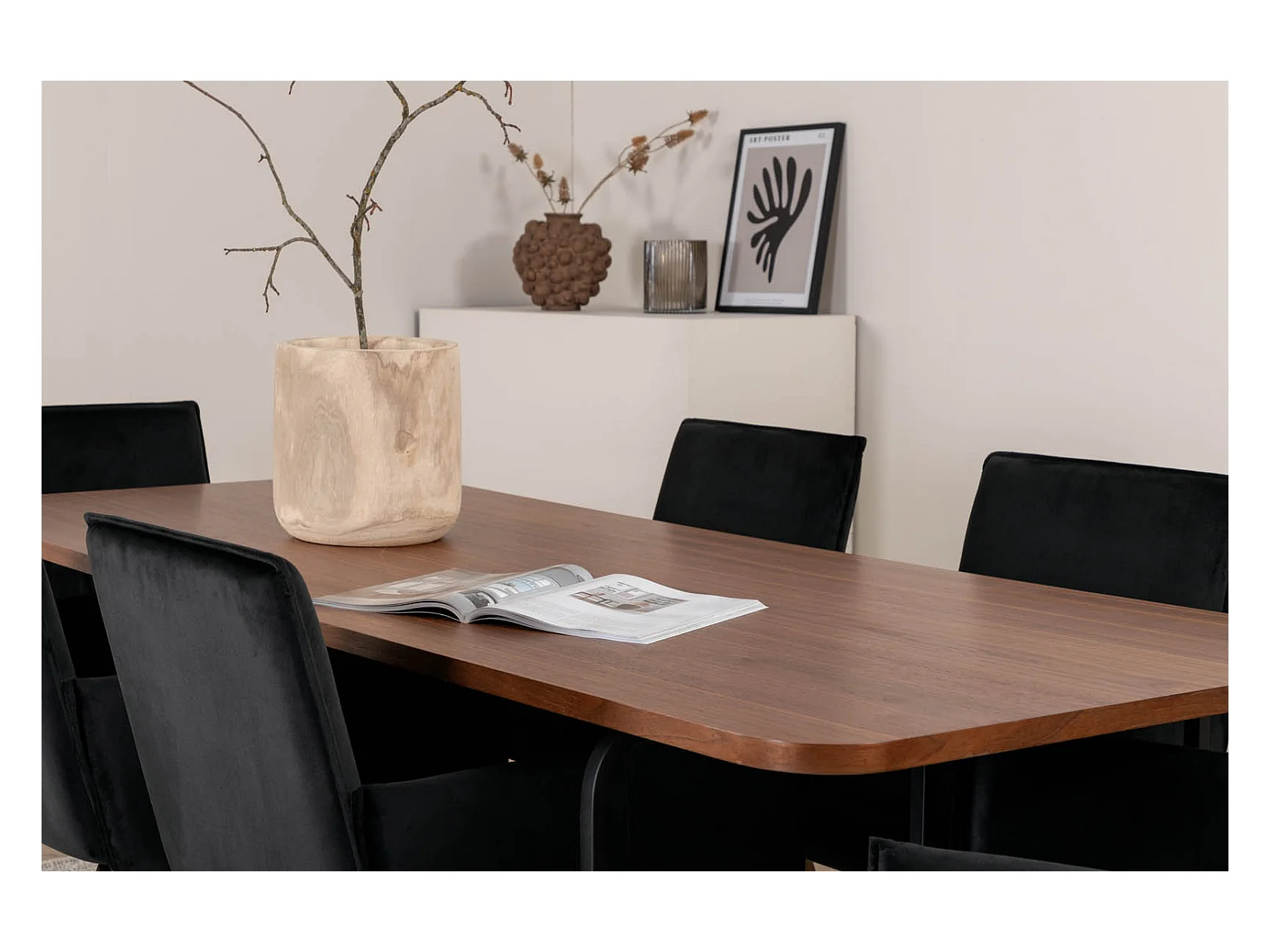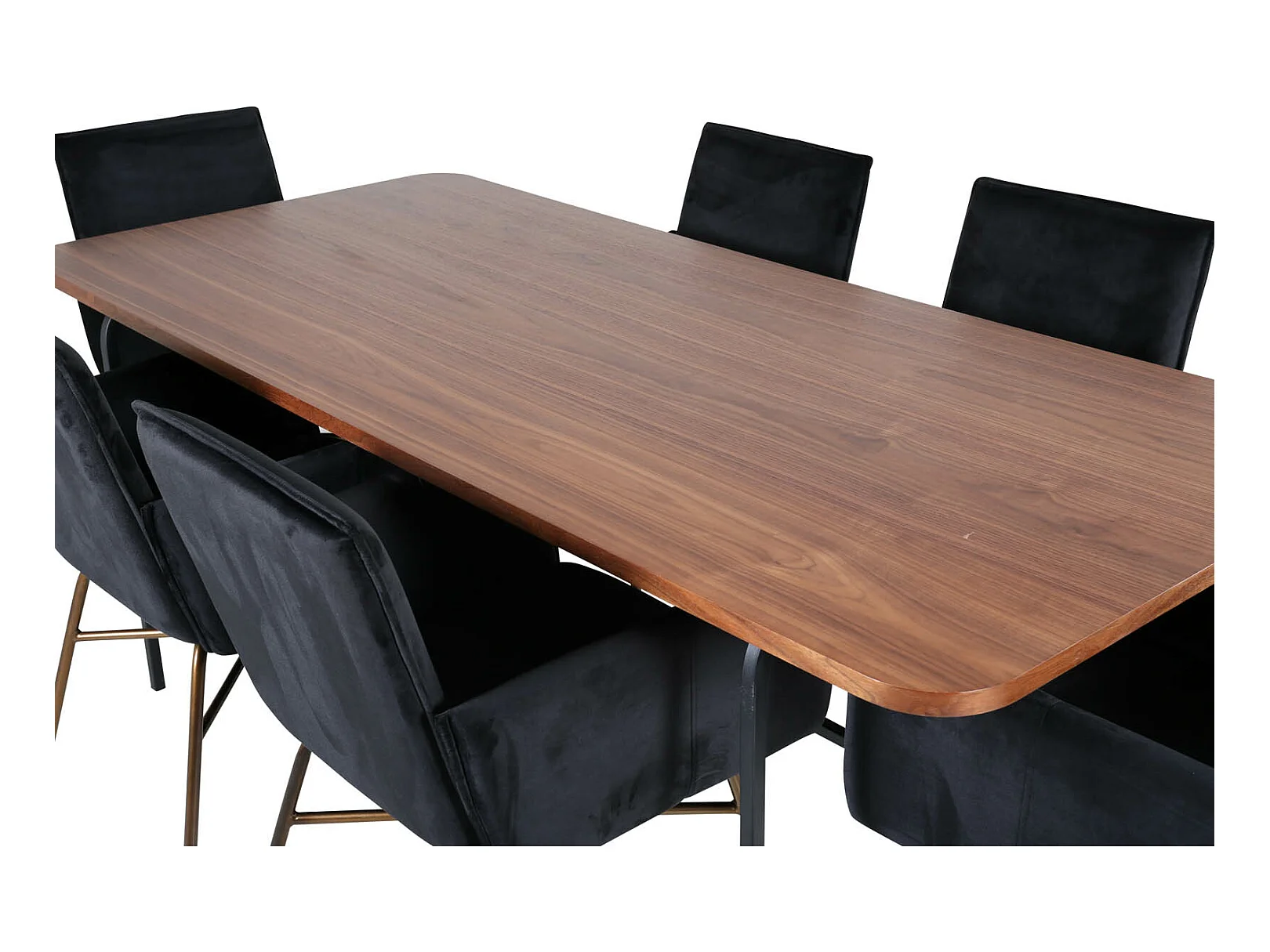 UnoWA eethoek eetkamertafel Okkernoot decor en 6 Pippi eetkamerstal velours zwart.
