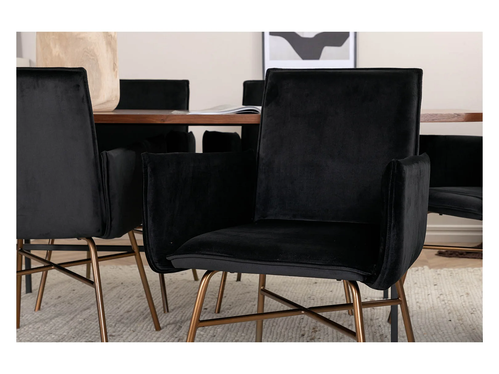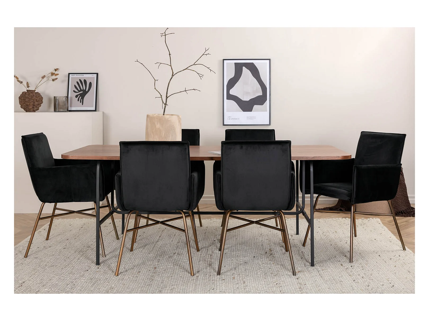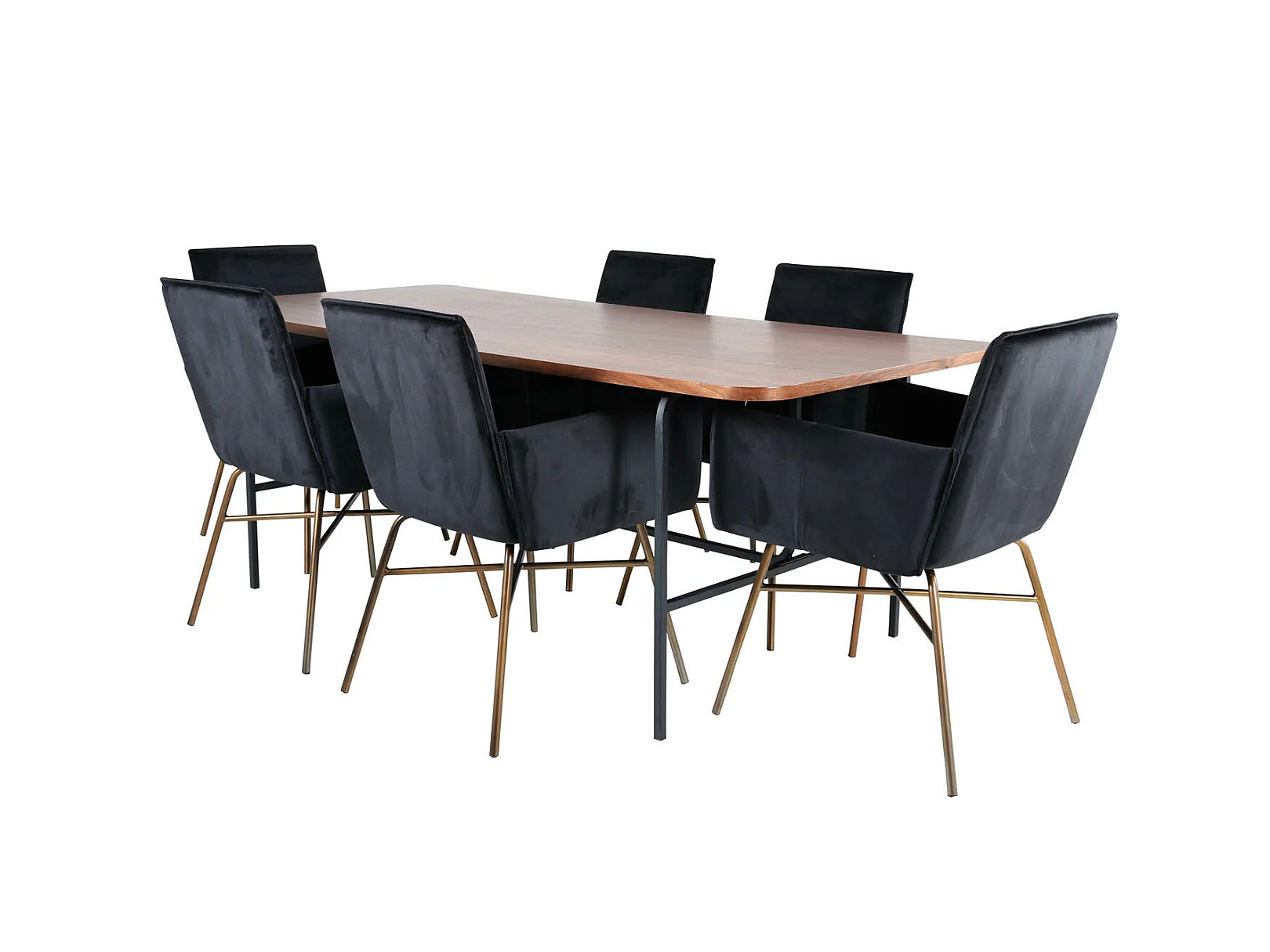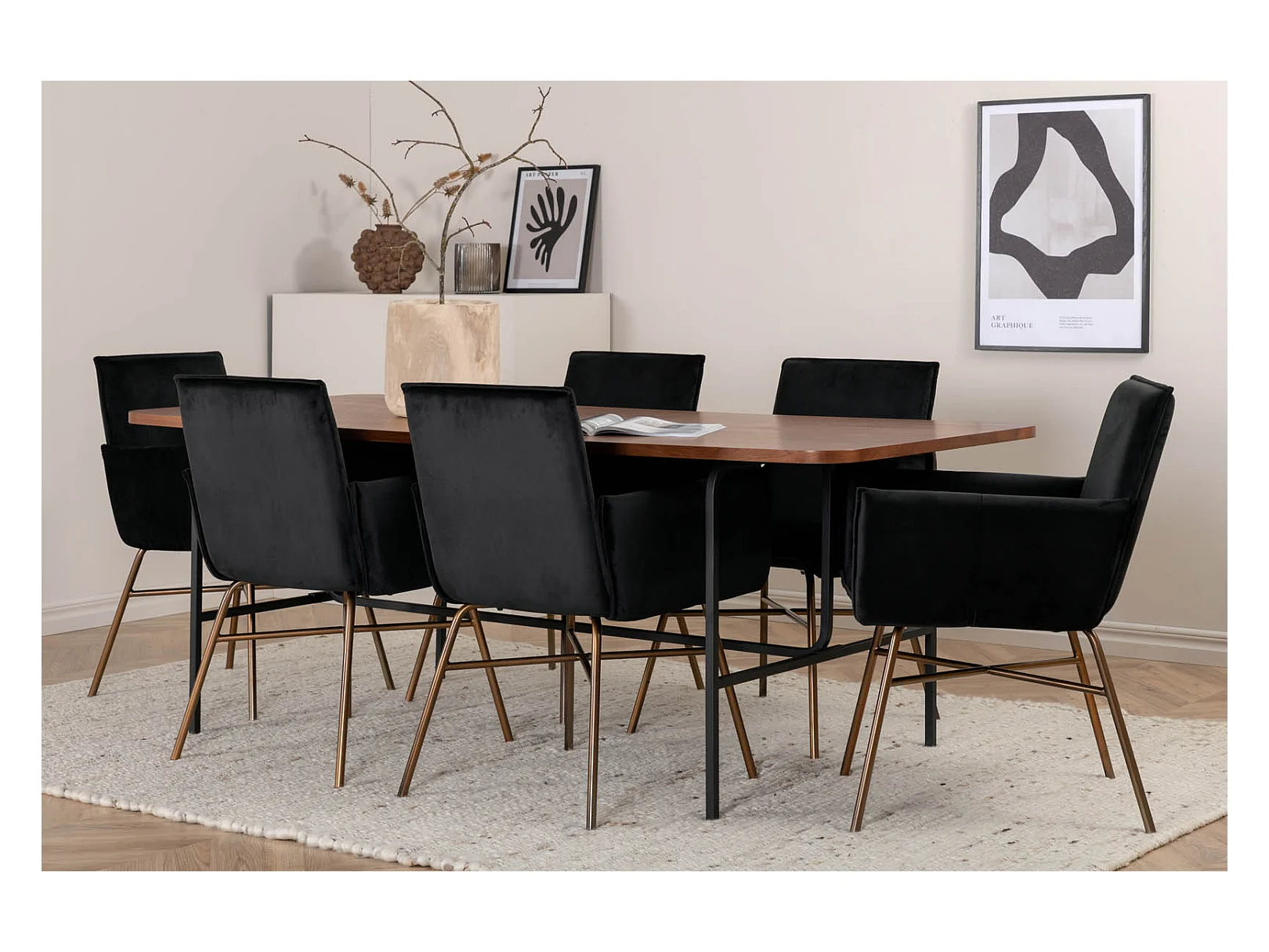 UnoWA eethoek eetkamertafel Okkernoot decor en 6 Pippi eetkamerstal velours zwart.