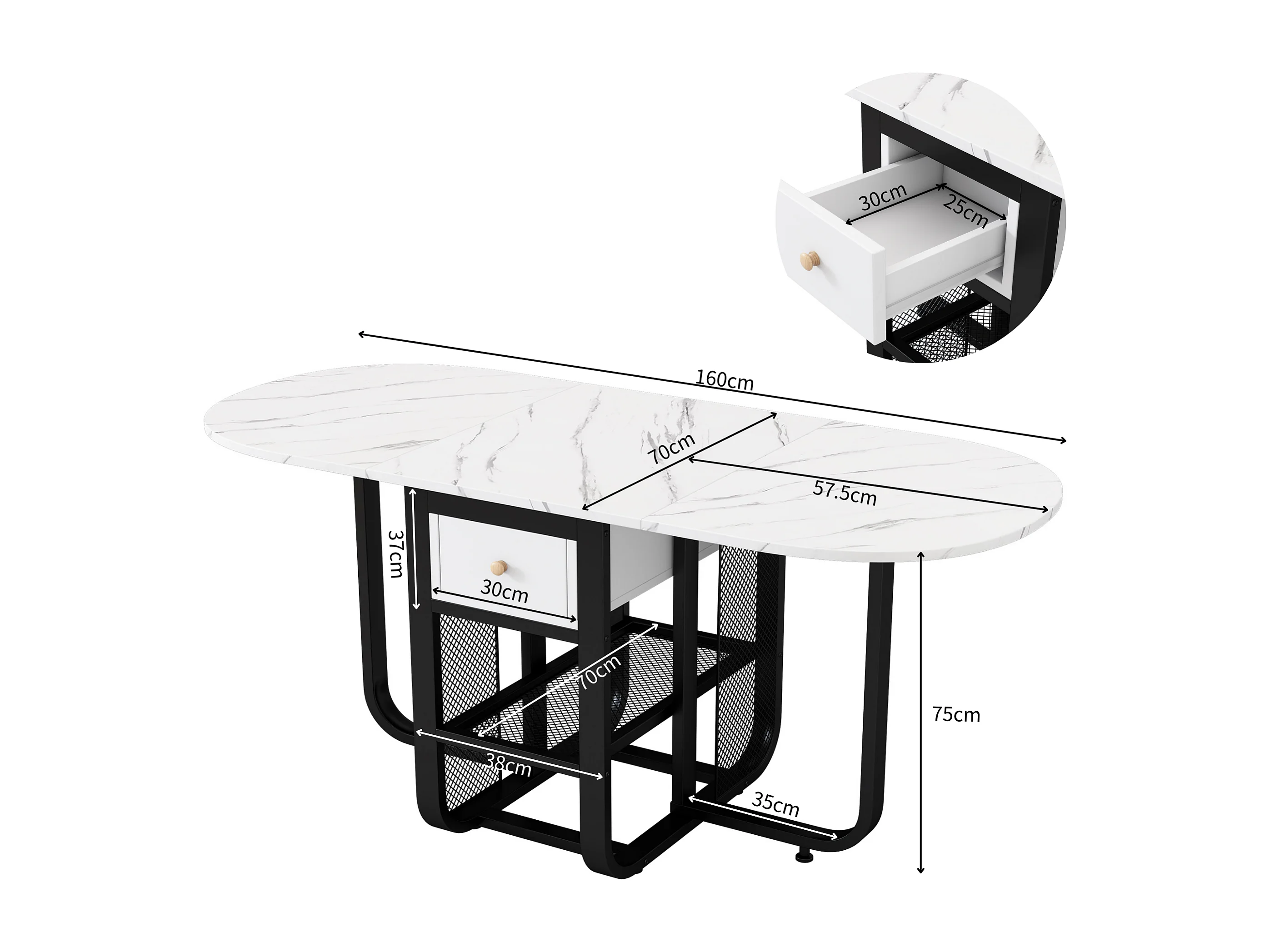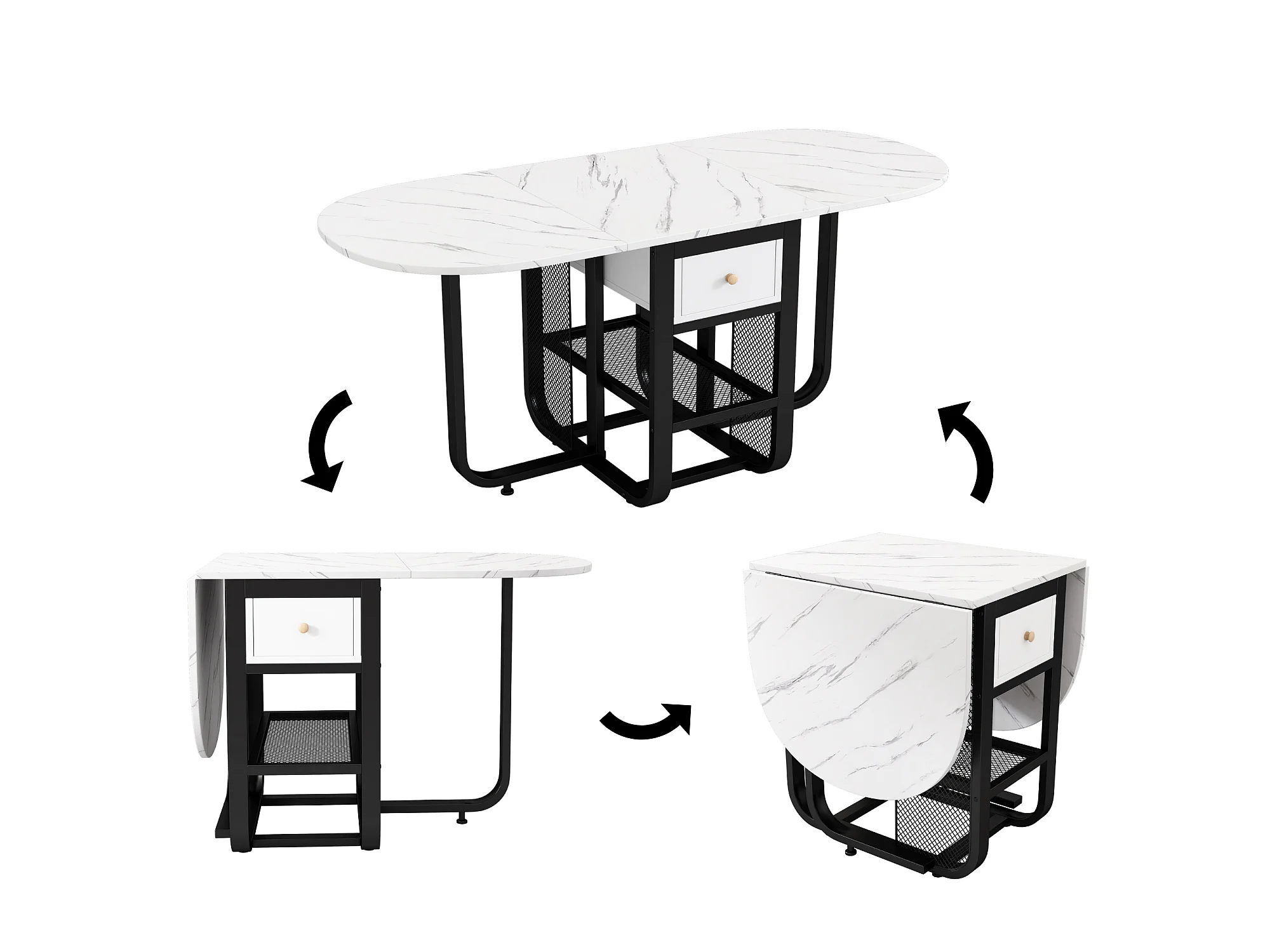 Veelzijdige intrekbare opklapbare eettafel - met 2 laden en opbergplank - spaanplaat - wit en zwart