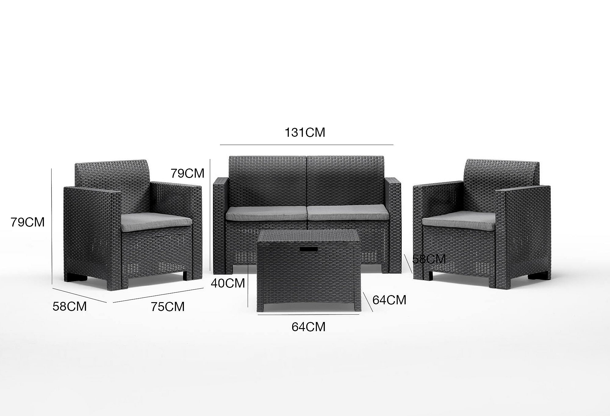 TECHNISCHE EIGENSCHAPPEN - Volledig gemaakt van resistent polypropyleen, waardoor het overal in de open lucht kan worden geplaatst en bestand is tegen zonlicht en regen, hij is waterdicht en waterafstotend - Wasbaar, makkelijk schoon te maken - Snelle en eenvoudige montage - Ideaal voor 4 personen - PRODUCTAFMETINGEN IN CM - Fauteuil: 75x58h79, Bank: 131x58h79, Salontafel: 64x64h40