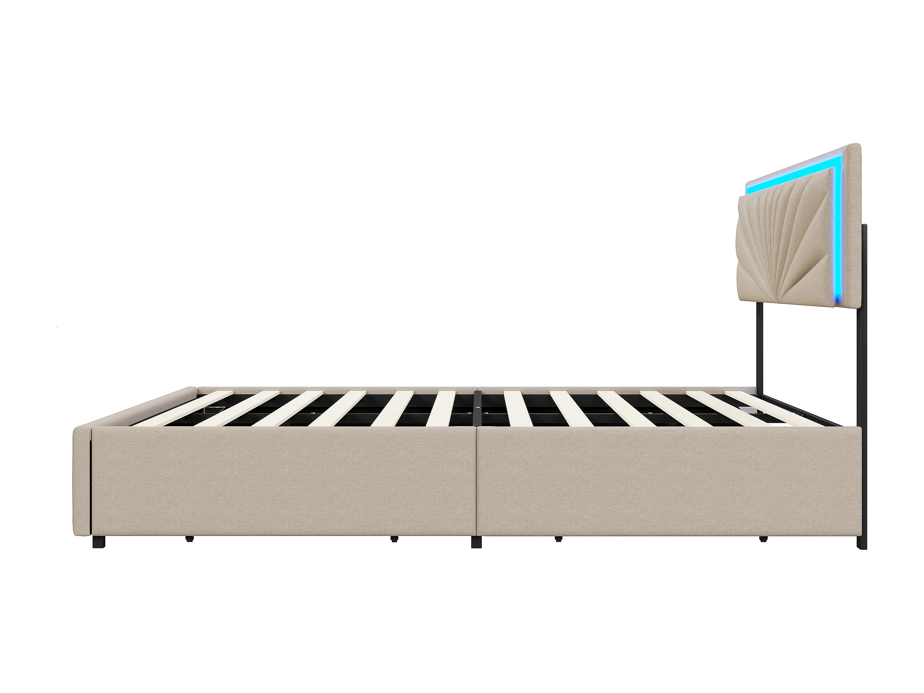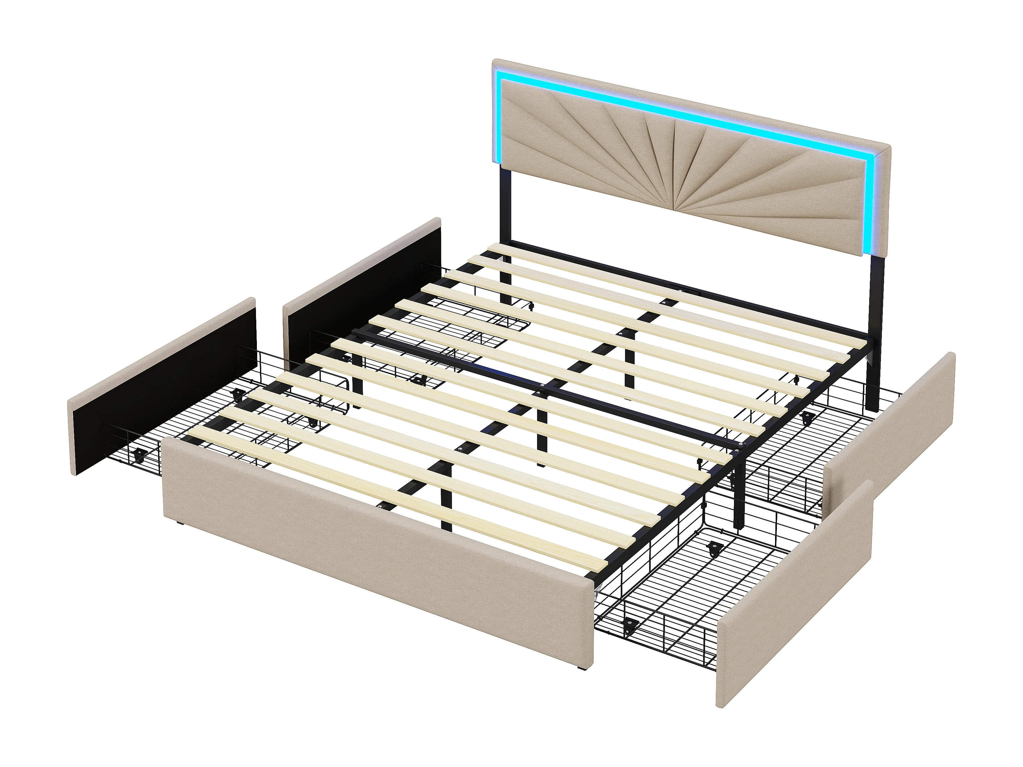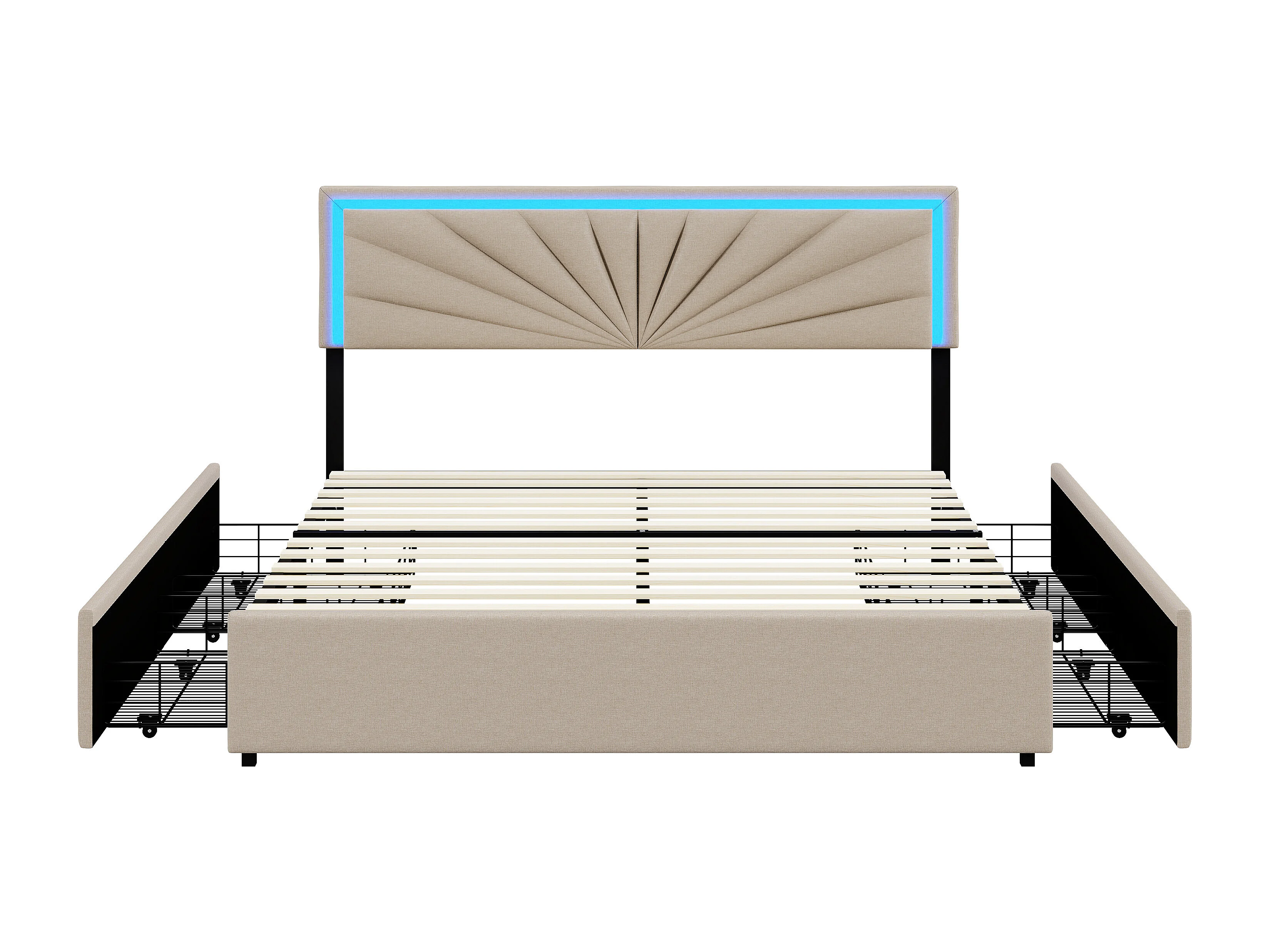 Opbergbed, beige, tweepersoonsbed, linnen, met 4 lades, nachtkastje met lamp, 140*200 cm