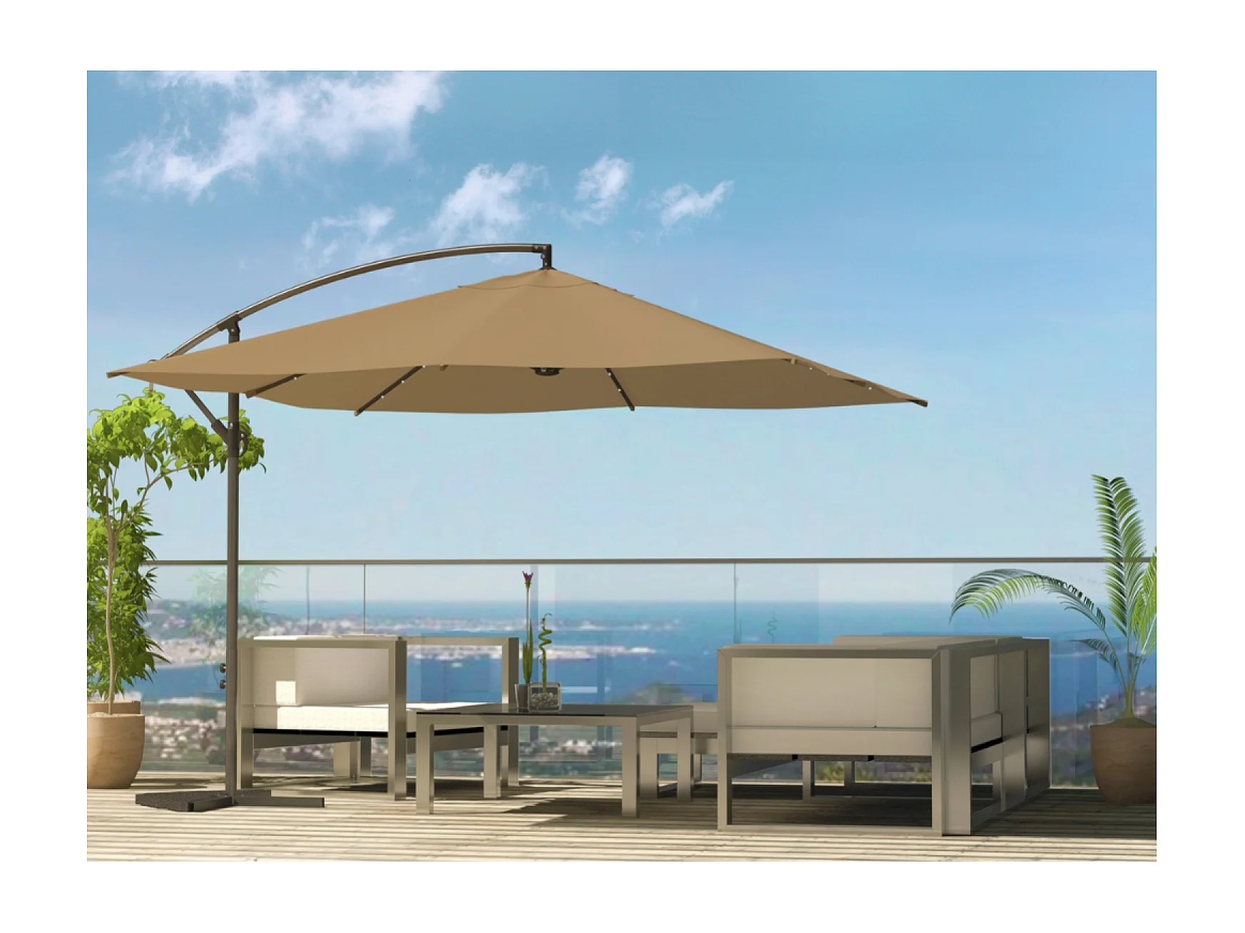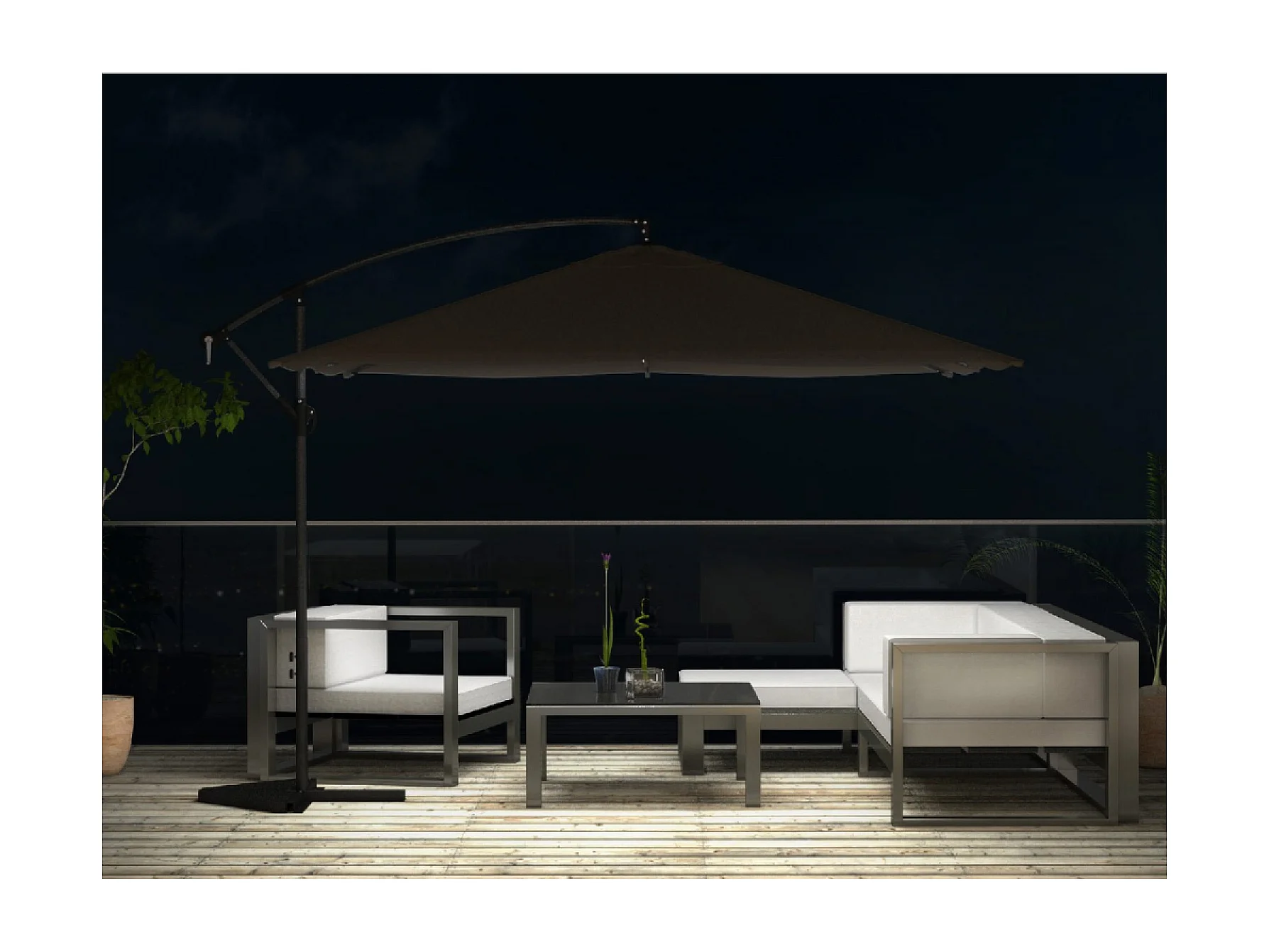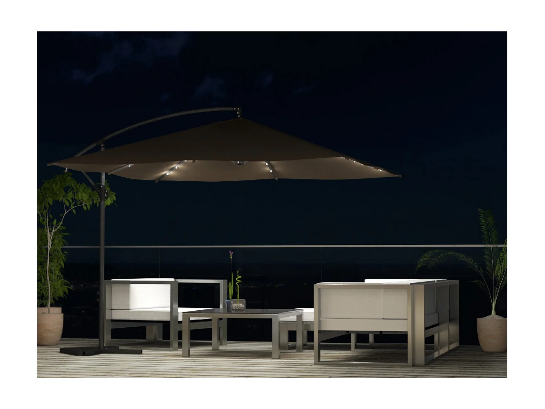 Verplaatste LED zweefparasol 3x3m vierkant chocolade SOLENZARA BULLE