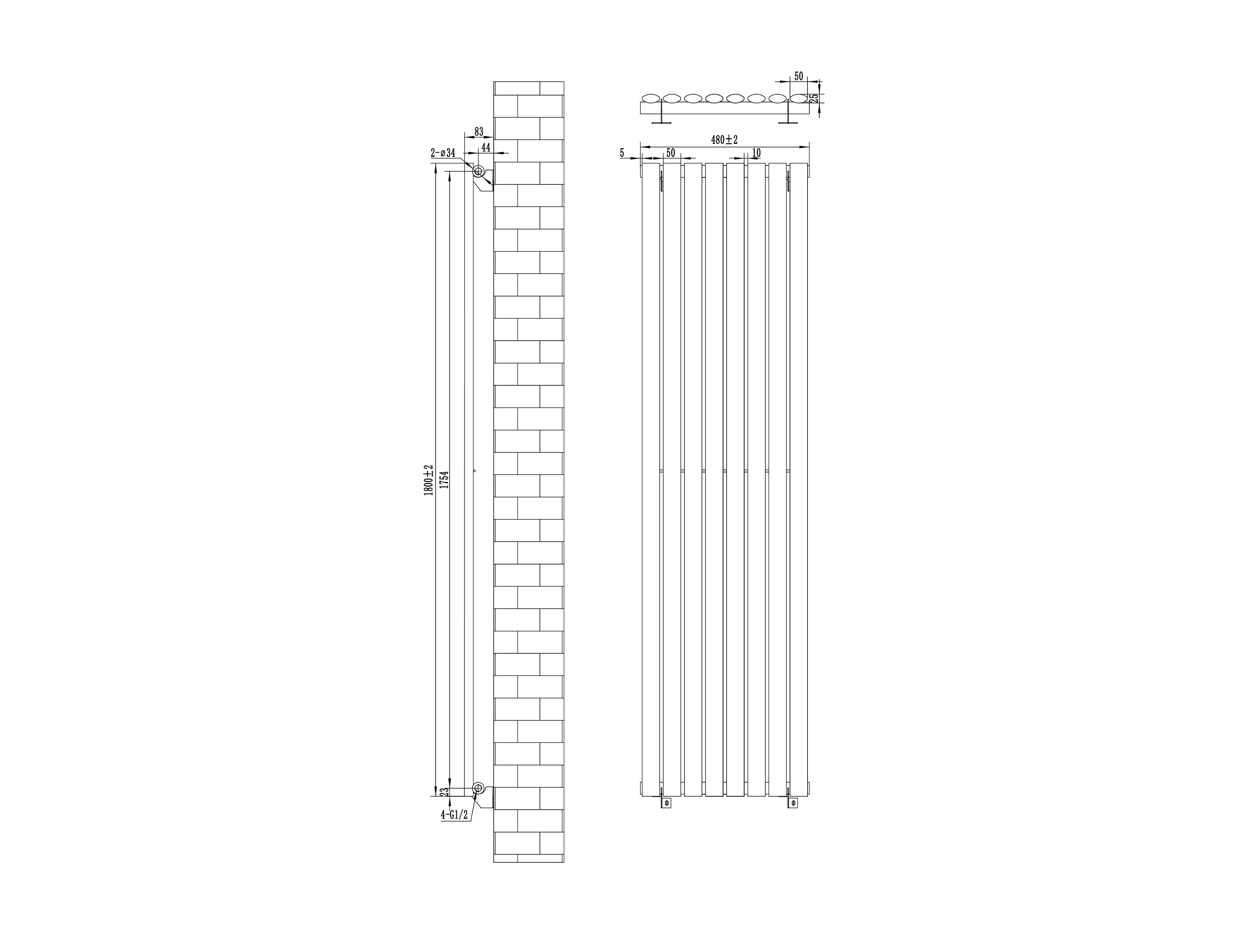 Verticale design radiator ovaal 1 kolom - wit 1800x480 mm thermostaatkraan