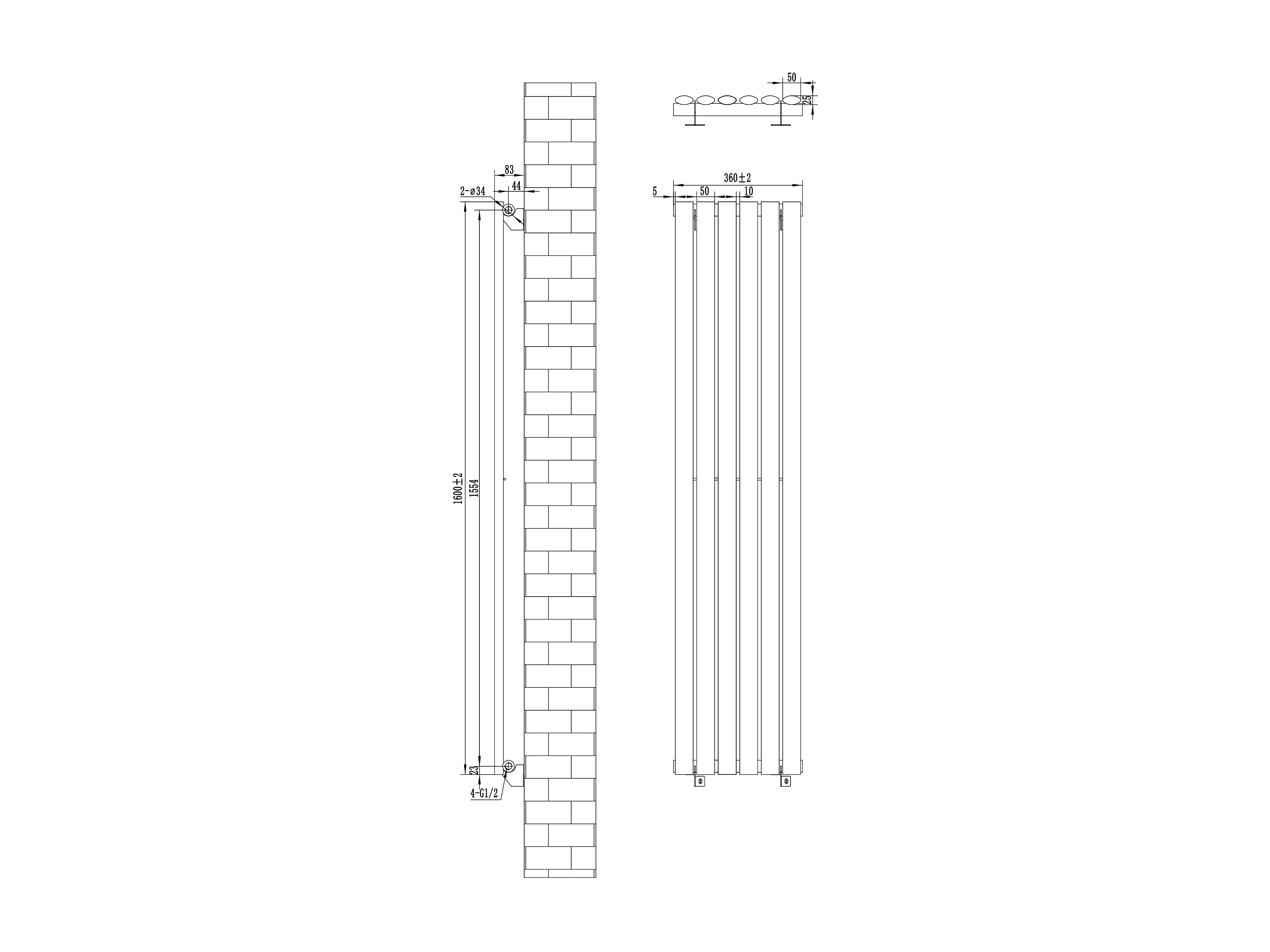 Verticale design radiator ovaal 1 kolom - zwart 1600x360 mm thermostaatkraan
