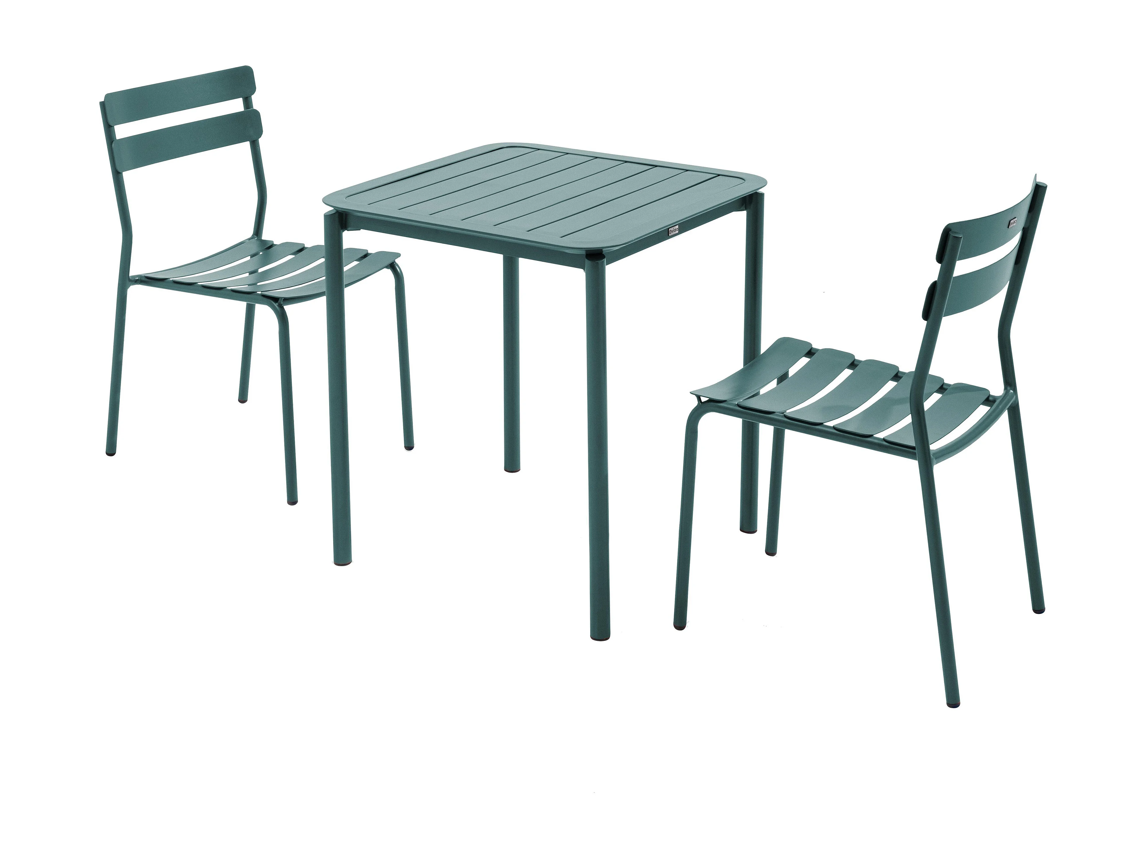 Vierkante terrastafel (70 x 70 cm) en 2 donkergroene stoelen