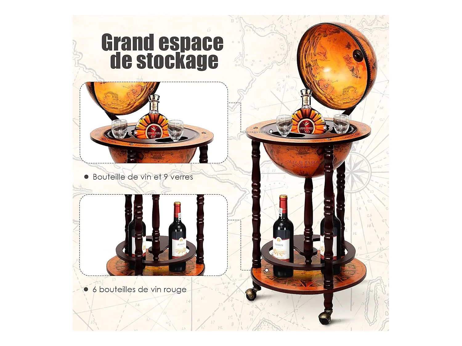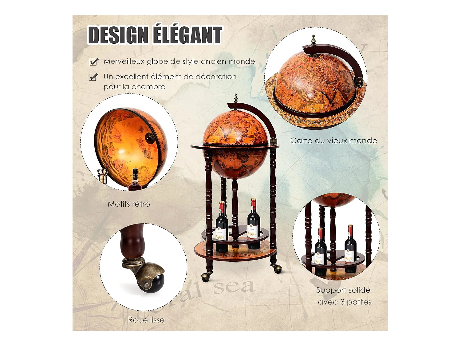 Bar globe cartographie marine du xvie siècle, avec 4 roulettes et style rétro, marron