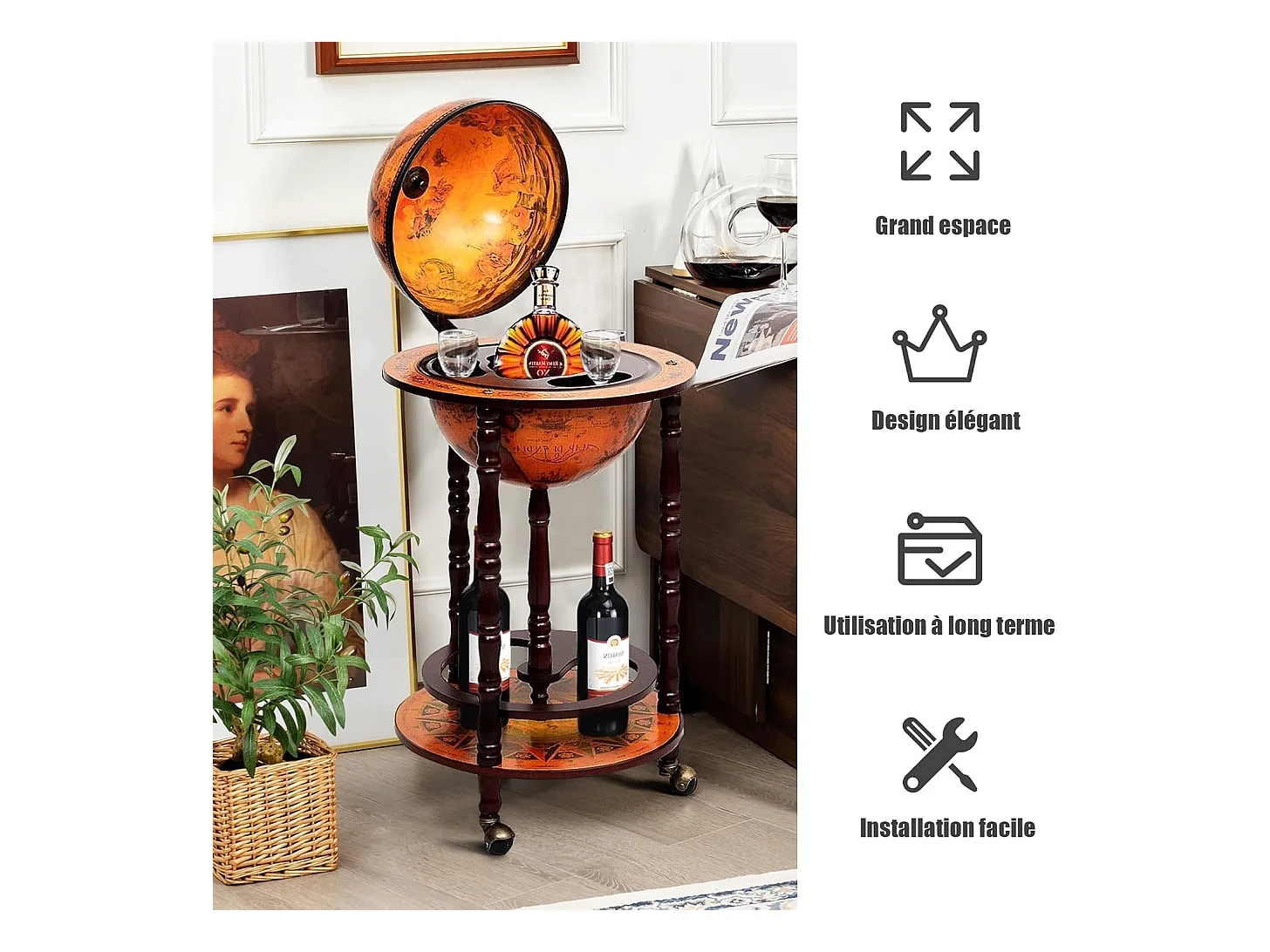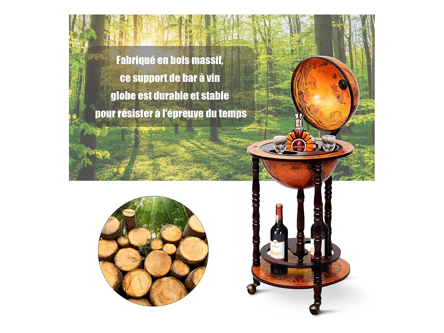 Bar globe terrestre vintage mappe monde en bois d'eucalyptus avec roulette