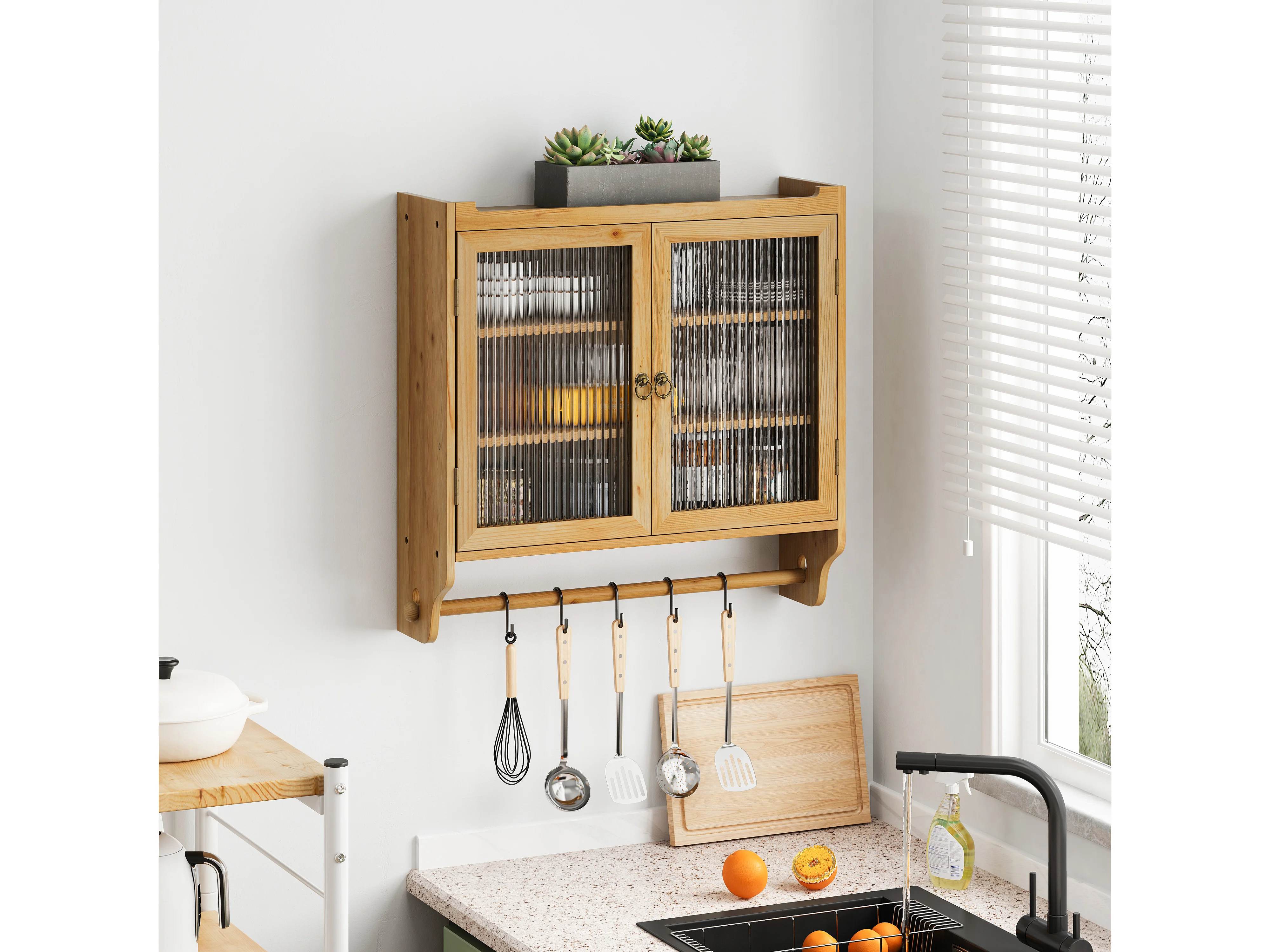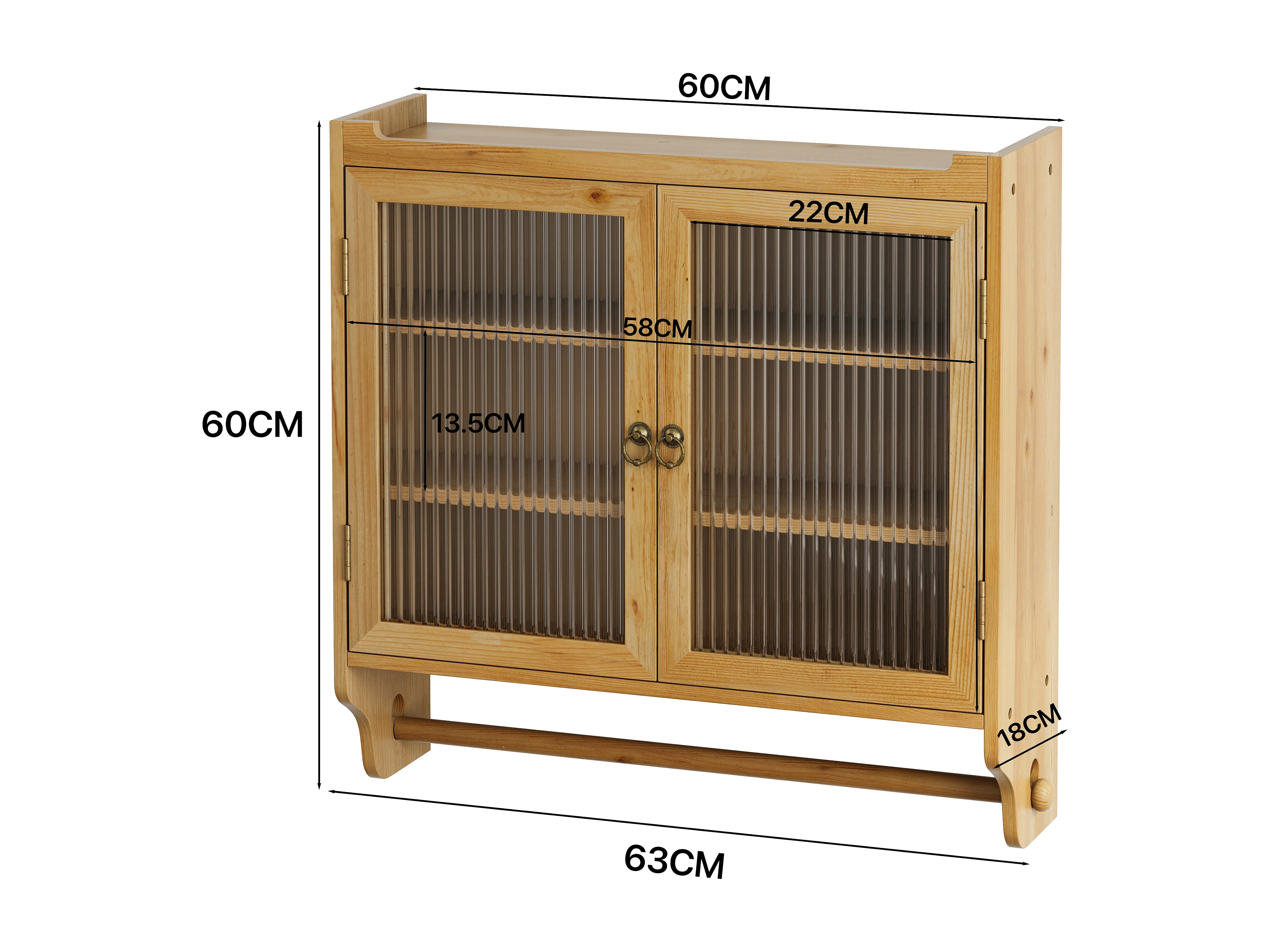 Vintage wandkast met 2 deuren en 3 planken - Hout en glas - Licht natuurlijk