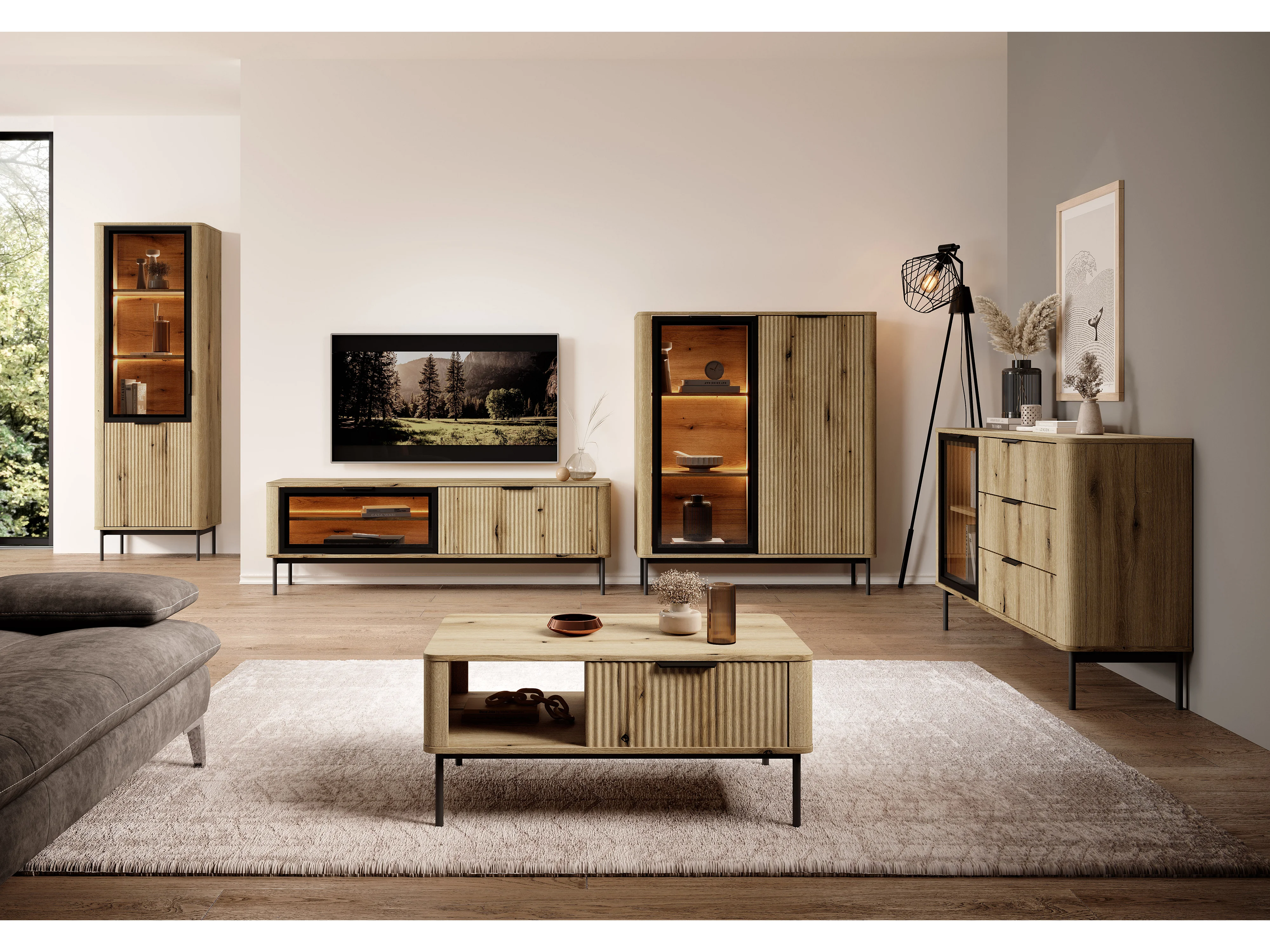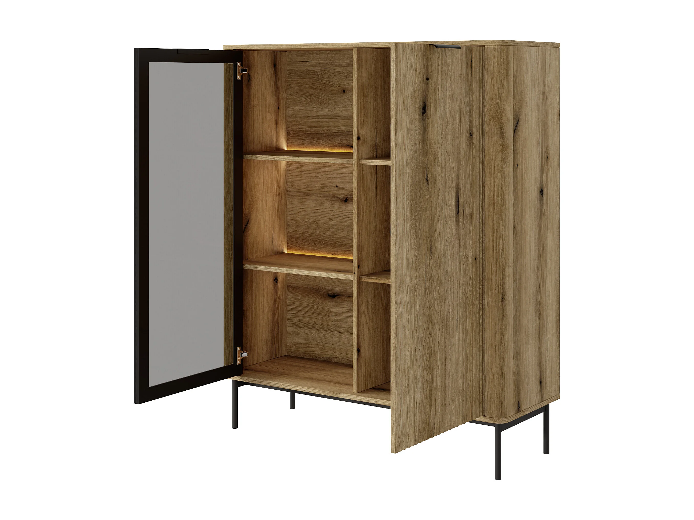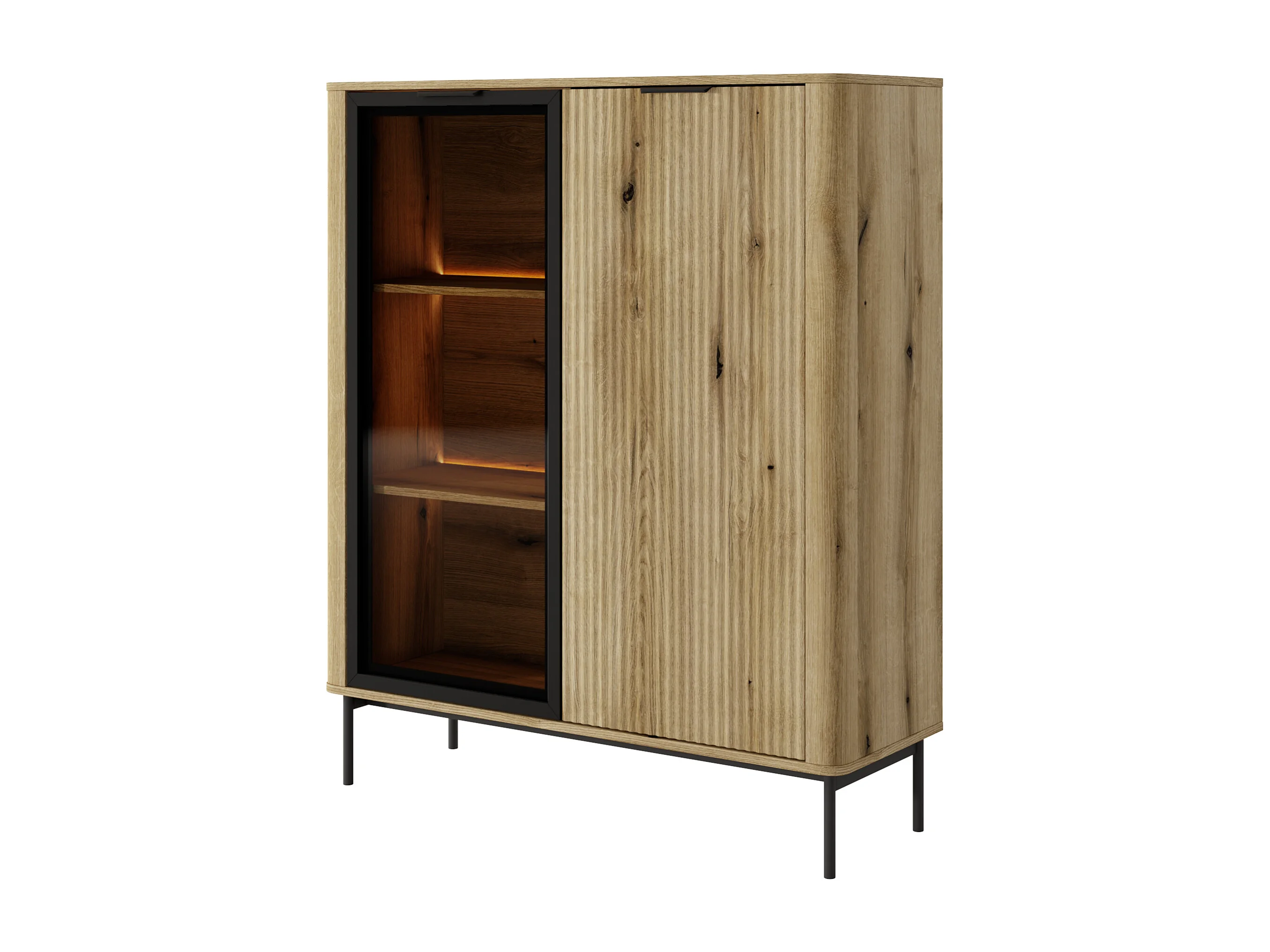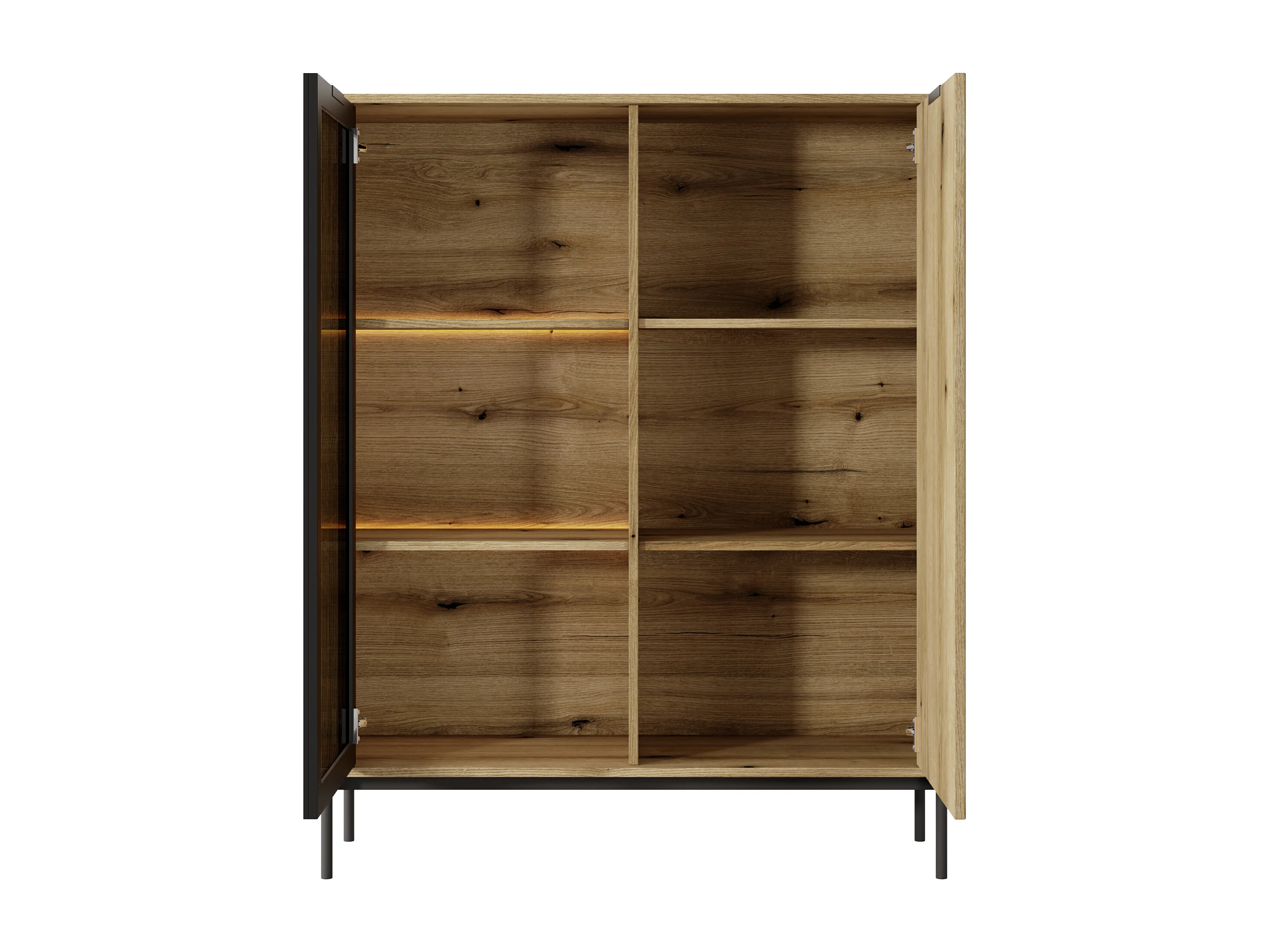 Vitrine: 2 deuren, Evoked Oak, zwarte poten, LED-verlichting, 134,1 x 113,2 x 38 cm