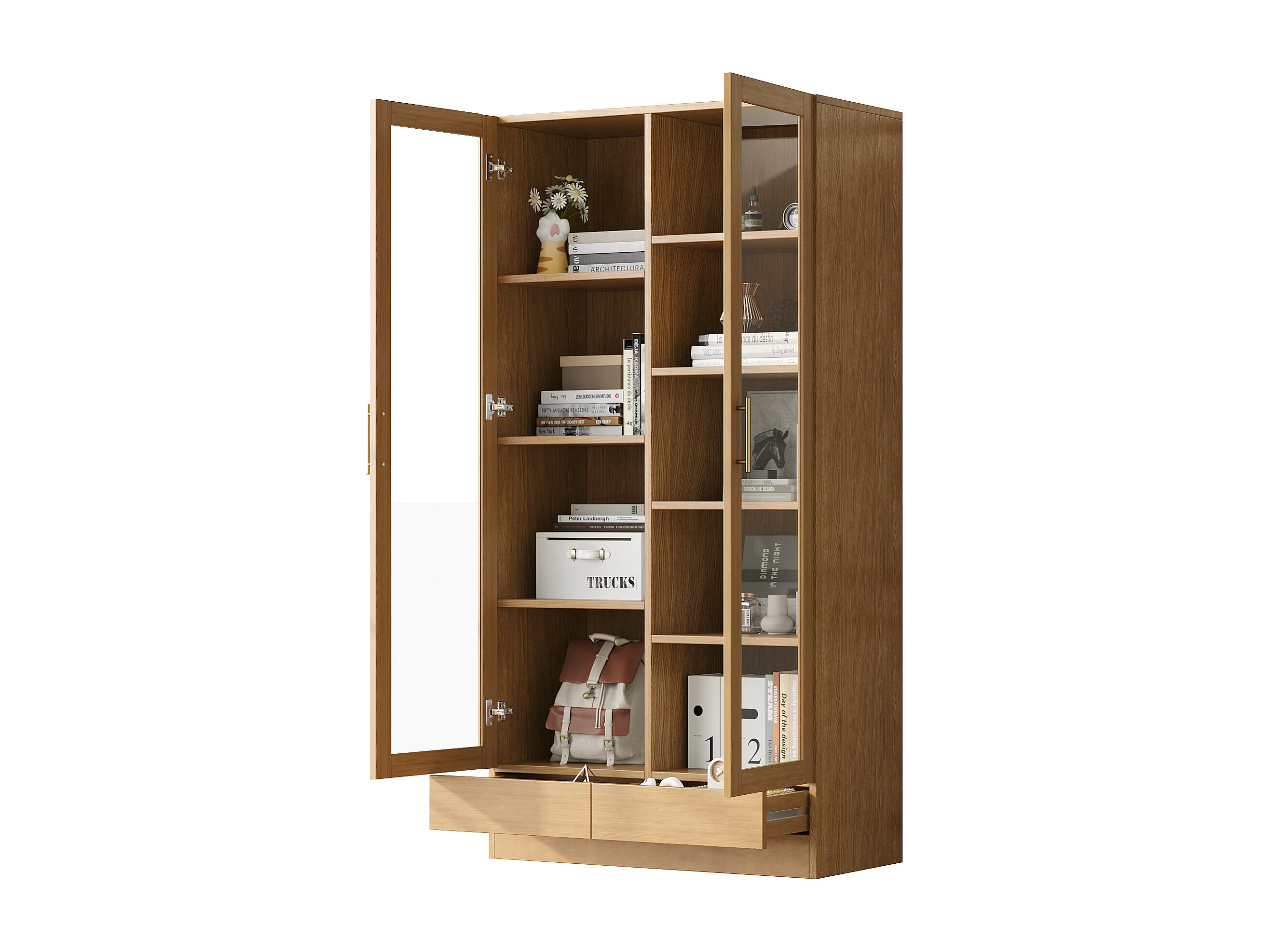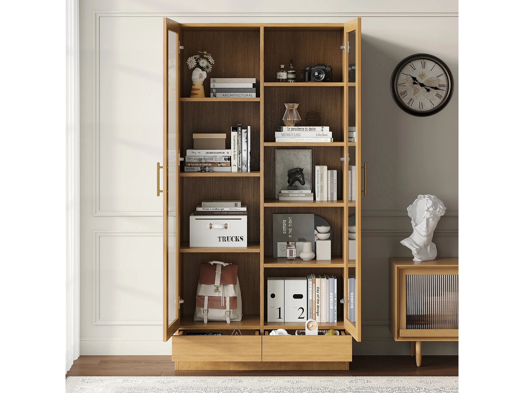 Moderne vitrinekast 80x34x171 cm - Houten buitenkant, glazen deuren, 2 houten deuren en messing handgrepen